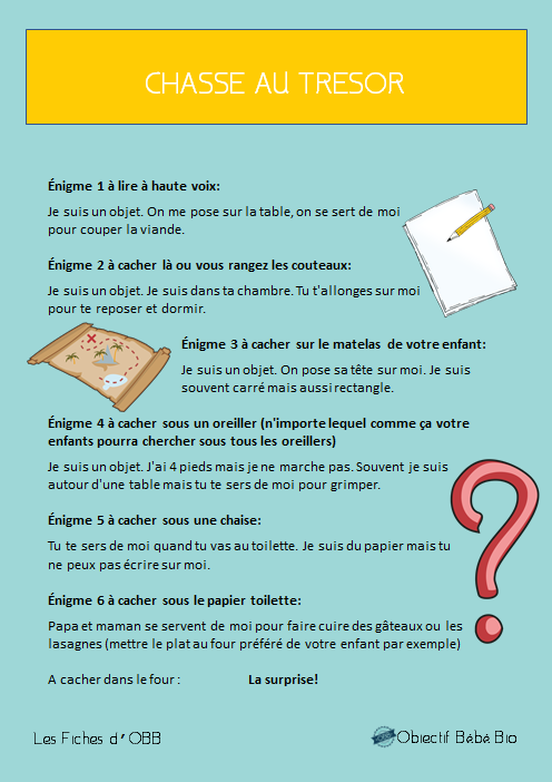 Ci dessous des idées d’énigmes toutes faites mais vous pouvez laisser libre court à votre imagination :