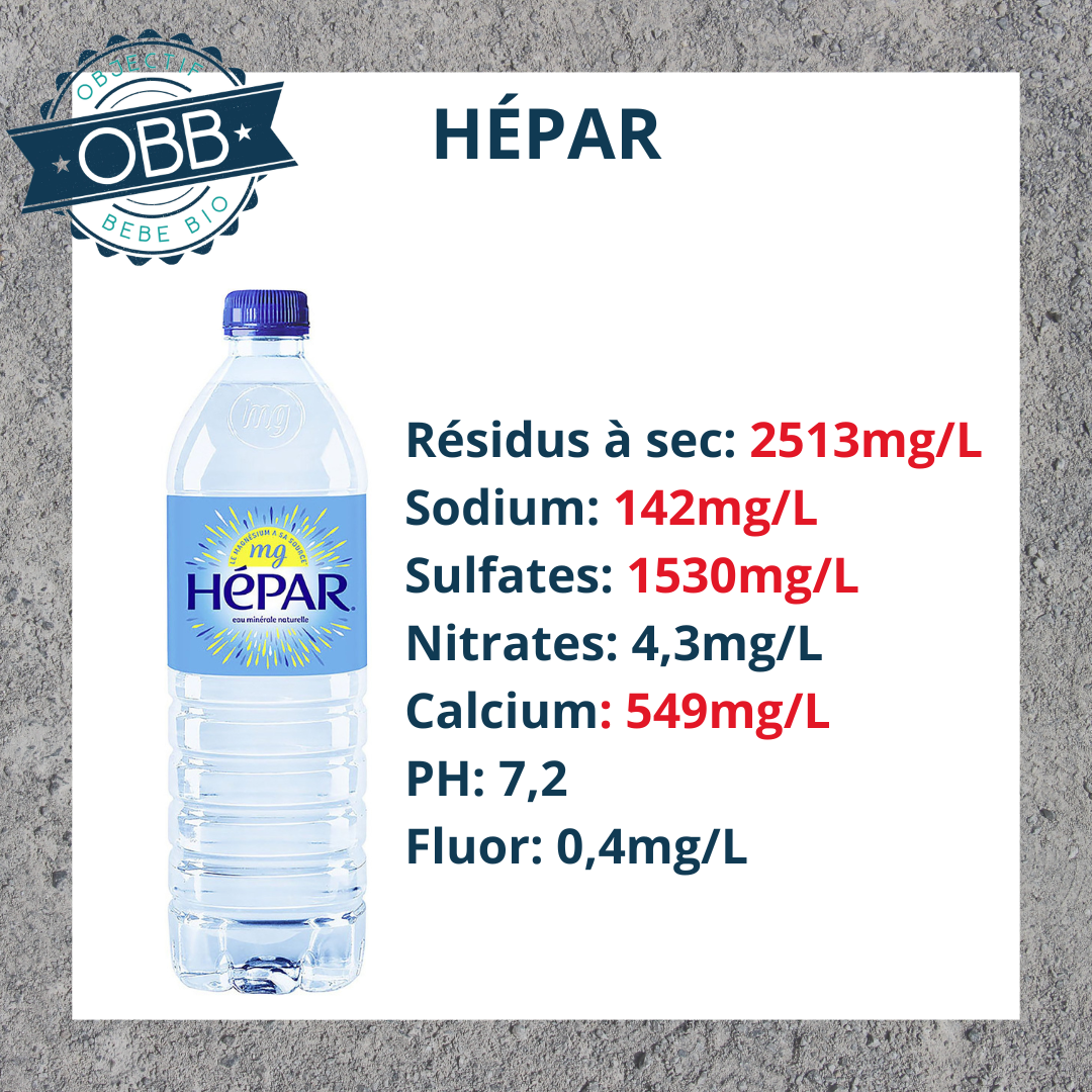 Pour cette catégorie, une eau ne doit pas dépasser les 500 mg/L afin de pouvoir afficher le logo du biberon sur son étiquette. Cependant il vaut mieux donner une eau faiblement minéralisée aux bébés , et donc ne pas dépasser les 200 mg/L. Les reins d’un bébé ne sont pas encore assez matures pour filtrer une eau avec des taux élevés de résidus à sec, comme notamment la Hépar. Cependant cette eau est souvent conseillée, comme « astuce de grand mère » en cas de constipation. Cette technique donc doit être utilisée uniquement soit avis médical !