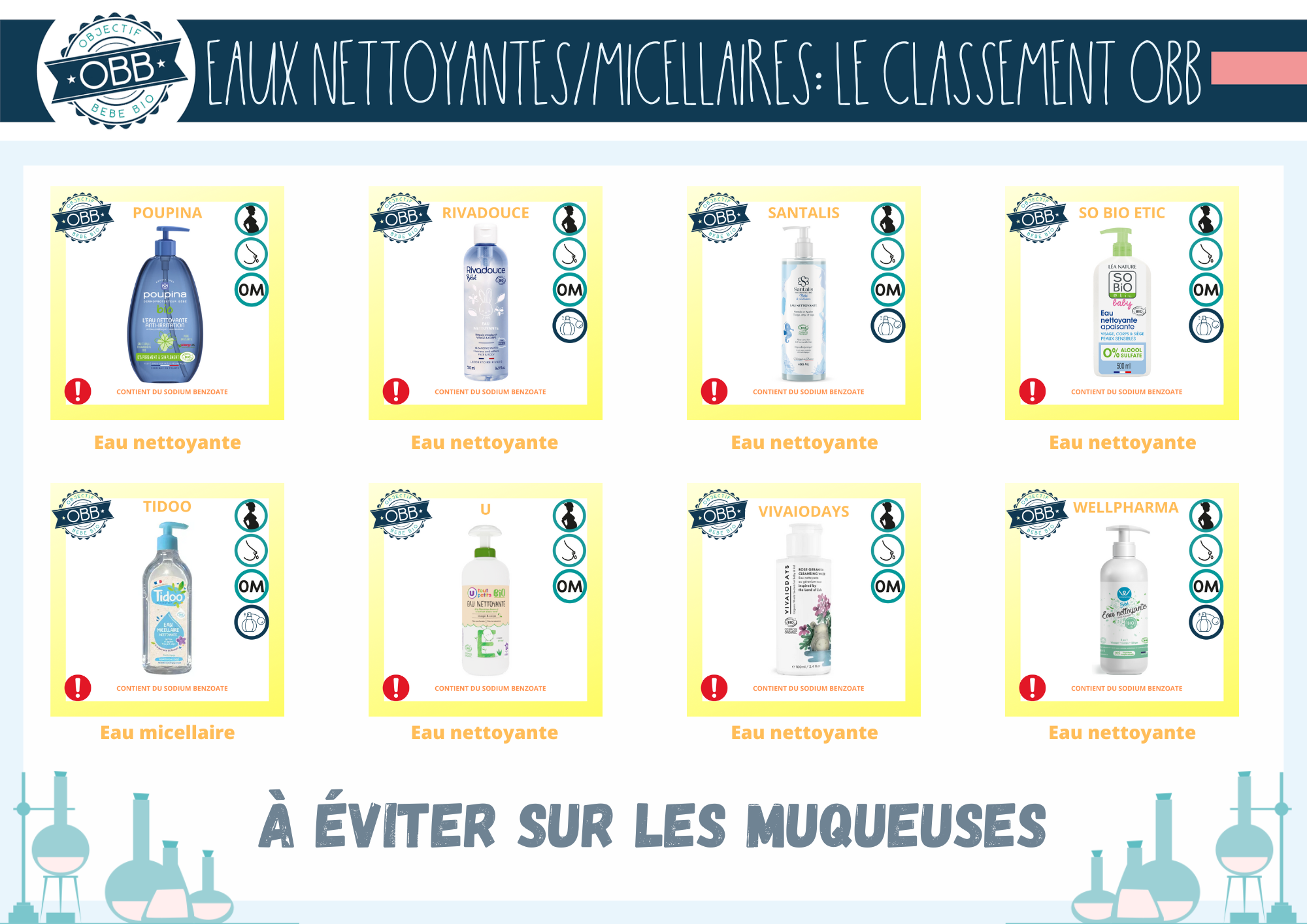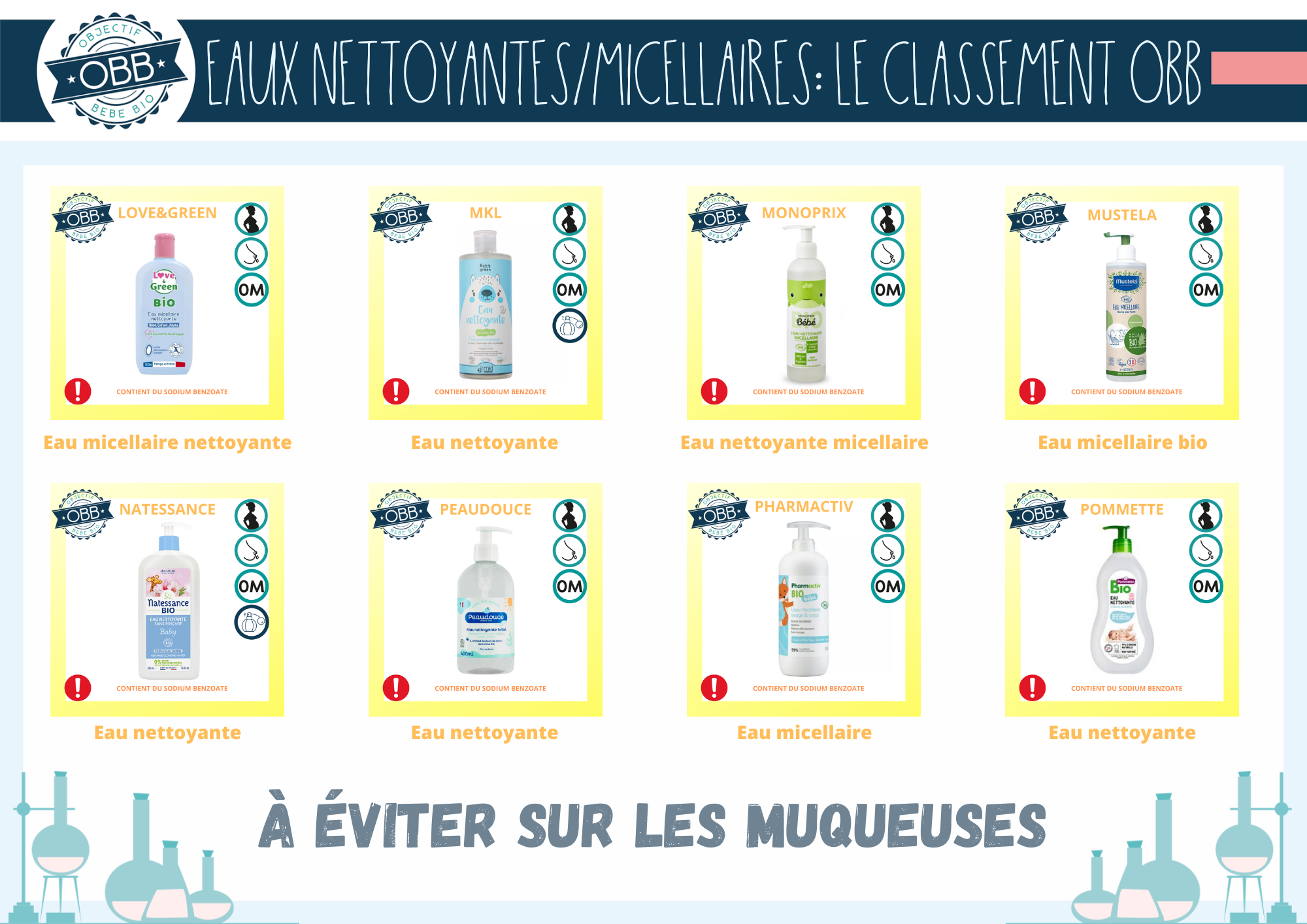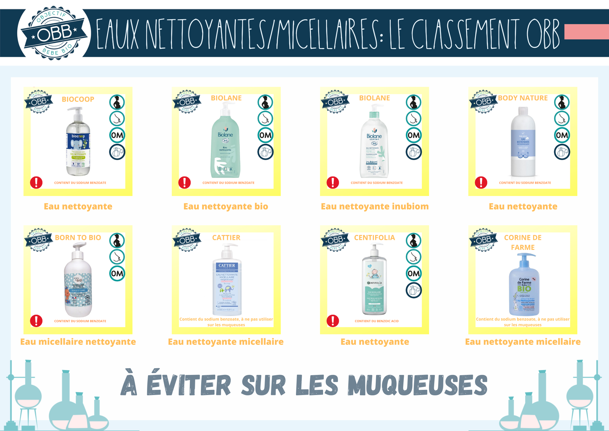 Eau nettoyante avec conservateurs synthétiques des marques acorelle, alphanova, auchan, baby look bio, babylena, beauterra, bébé au naturel, bio enjoy A éviter sur les muqueuses.