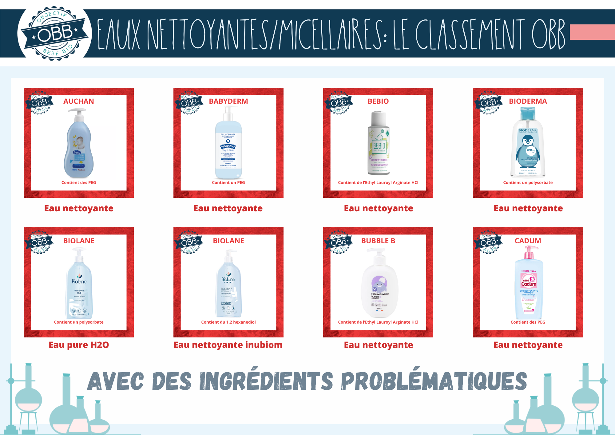 Eau nettoyante avec des ingrédients problématiques des marques auchan, babyderm, bebio, bioderma, biolane, bubble B, cadum. danger