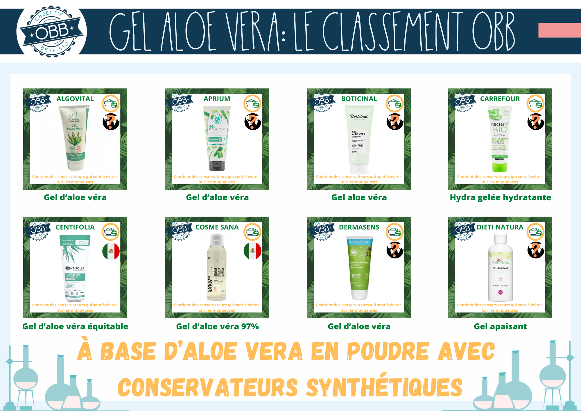 - Les gel d’aloe vera issus de poudre avec conservateurs synthétiques