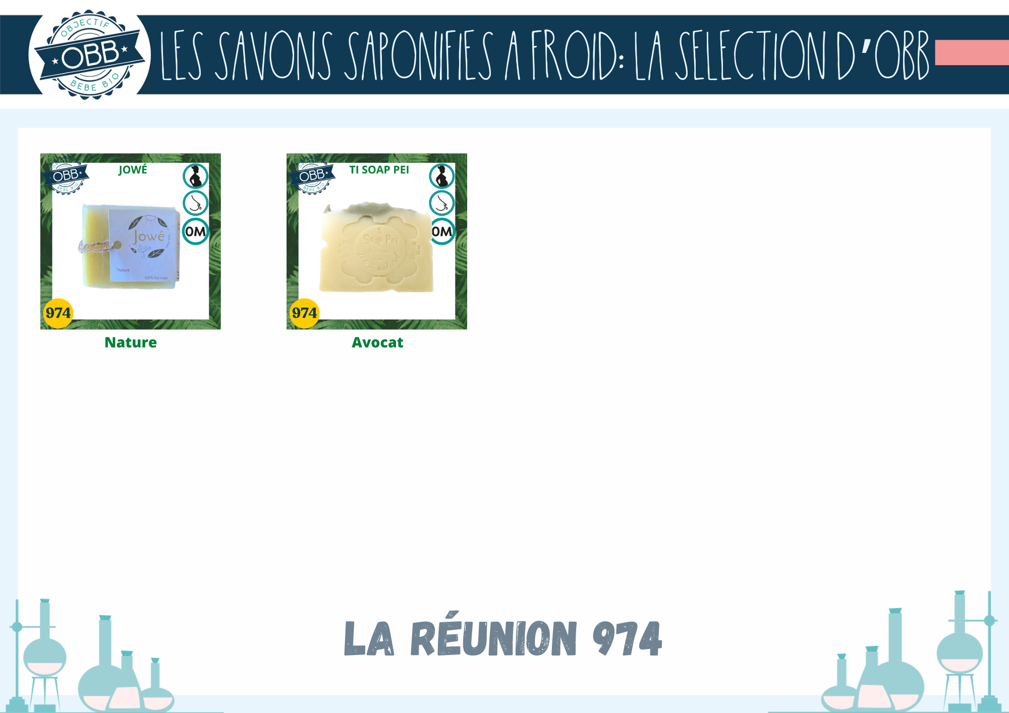 Nous savons qu’il est parfois difficile de trouver des références qui ne contiennent pas d’ingrédients problématiques en particulier dans les départements et régions d’outre-mer. Sans compter que les produits importés ont un coût plus élevés. Nous avons trouvé deux savonneries sur l’île de la Réunion qui proposent un savon solide compatible avec bébé. Si vous en connaissez d’autres n’hésitez pas à notre transmettre le nom et la composition INCI !