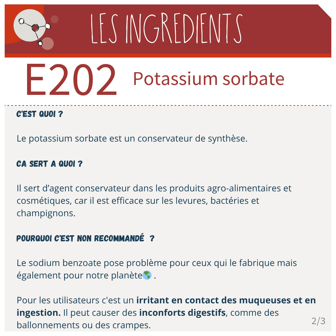 Le potassium sorbate, que l’on peut trouver sous le nom E202 dans les produits alimentaires, est un conservateur de synthèse.