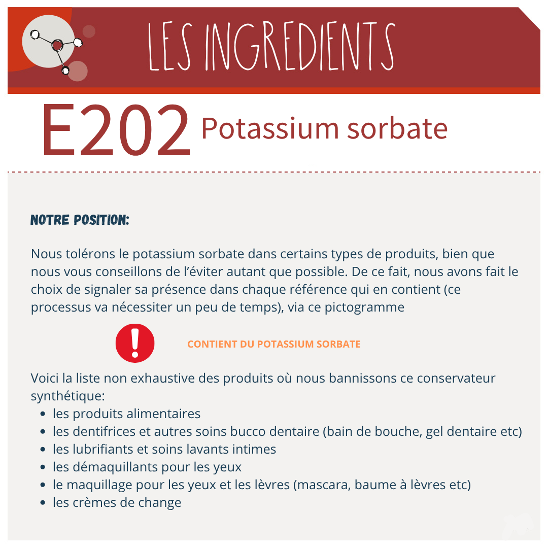 Nous tolérons le sorbate de potassium dans certains types de produits, bien que nous vous conseillons de l’éviter autant que possible. De ce fait, nous avons fait le choix de signaler sa présence dans chaque référence qui en contient (ce processus va nécessiter un peu de temps), via ce pictogramme.