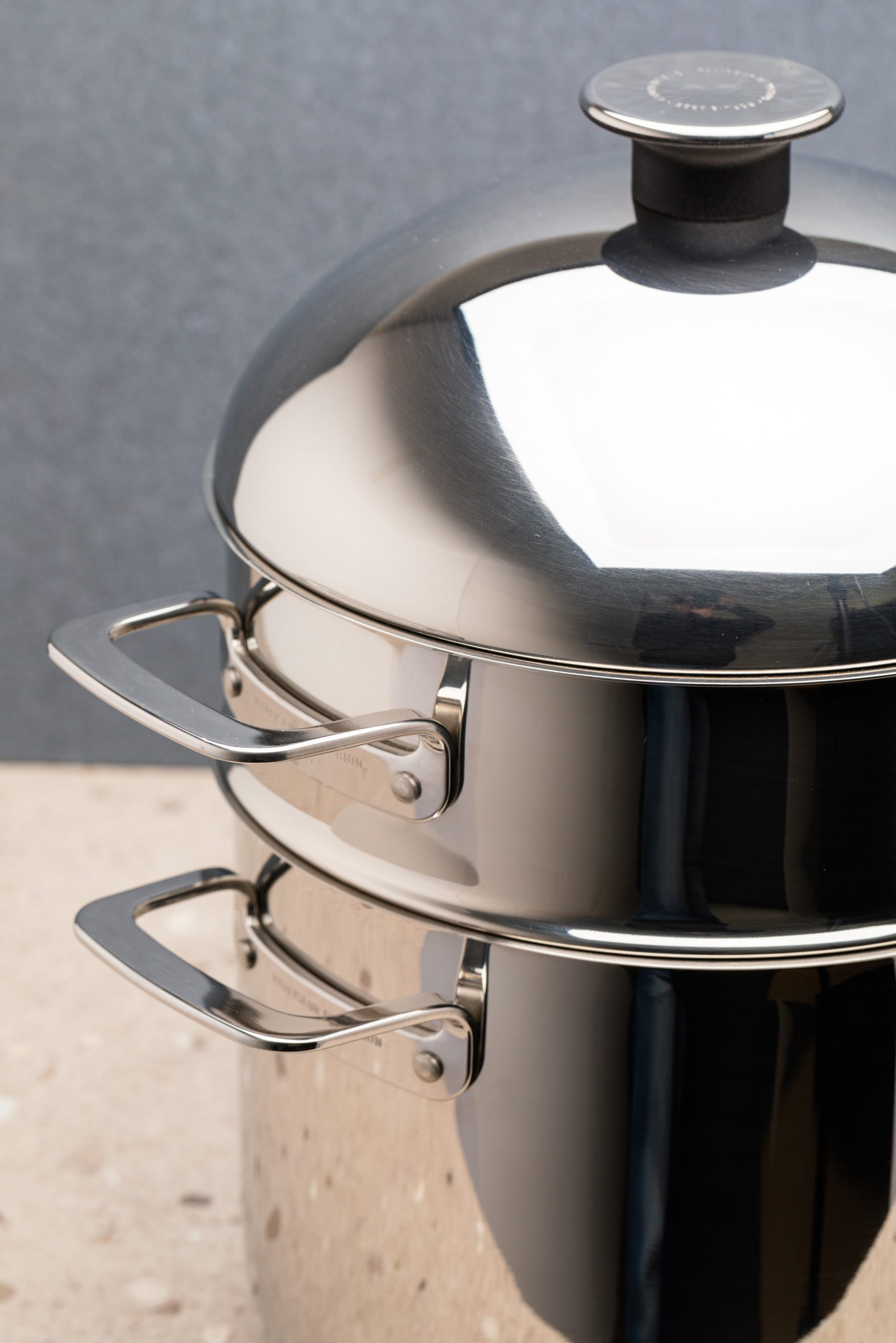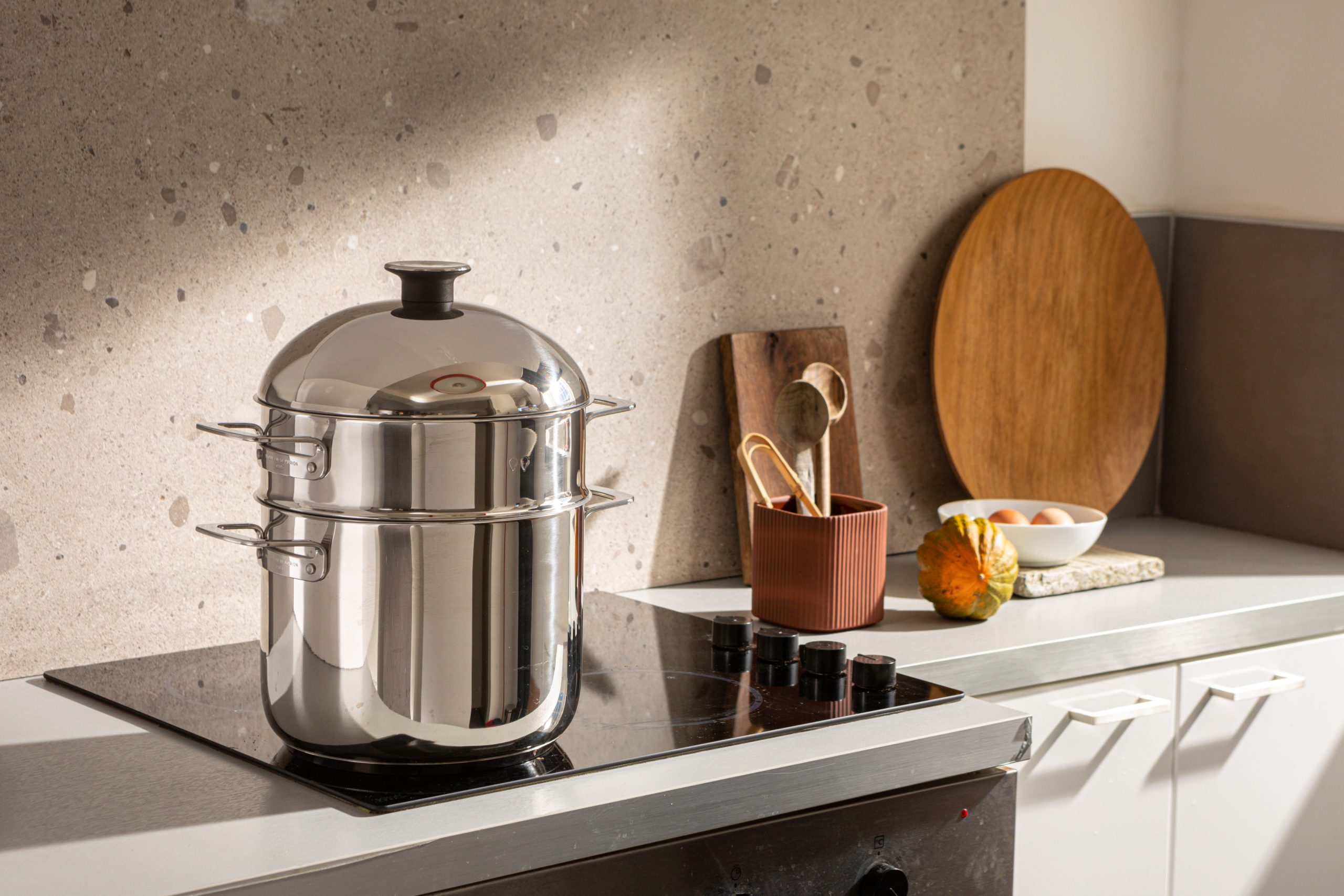 C’est un cuit-vapeur tout inox 18/10. Il est composé d’une cuve, d’un tamis et d’un couvercle en forme de dôme. Il produit une cuisson à la vapeur douce. La température reste constante à 95°C.
