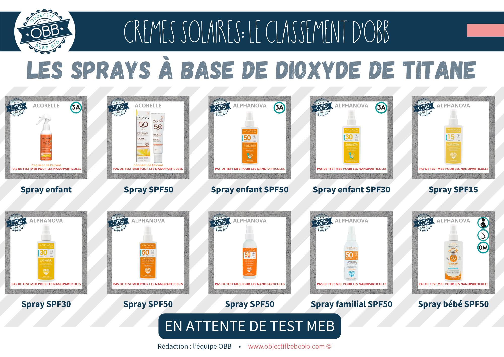 Nous savons que certains parents préférent le format spray, car il est plus facile à appliquer sur les enfants qui n’aiment pas mettre de creme solaire. Vous trouverez dans l’image ci dessous des références Acorelle, Laboratoire Biarritz, Alphanova, Lavera ou encore Bioregena qui ont ce type de format mais ils contiennent du dioxyde de titane.