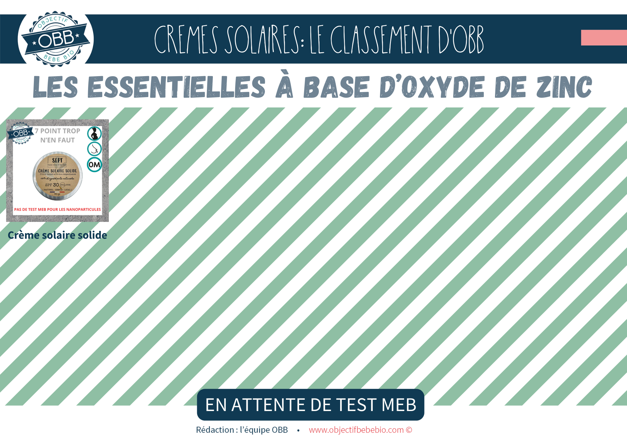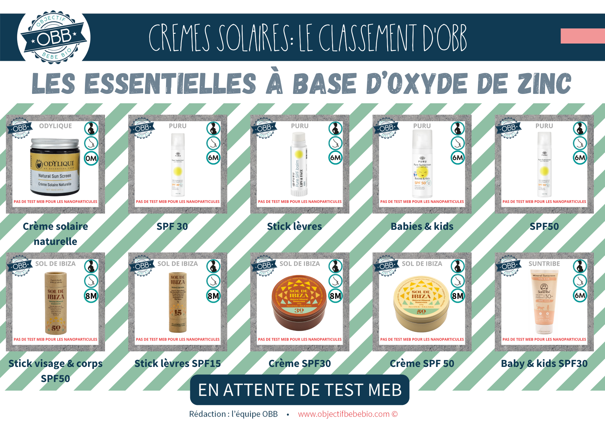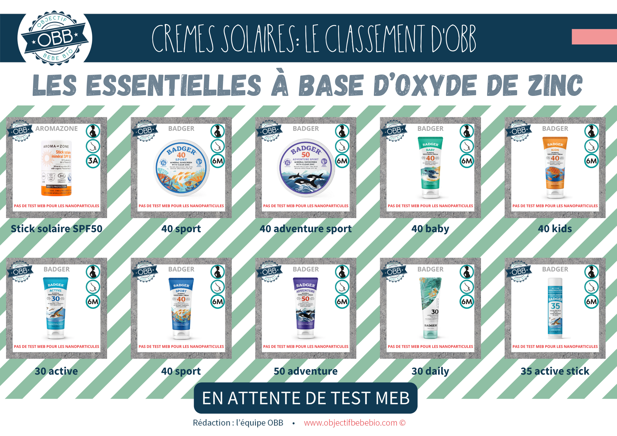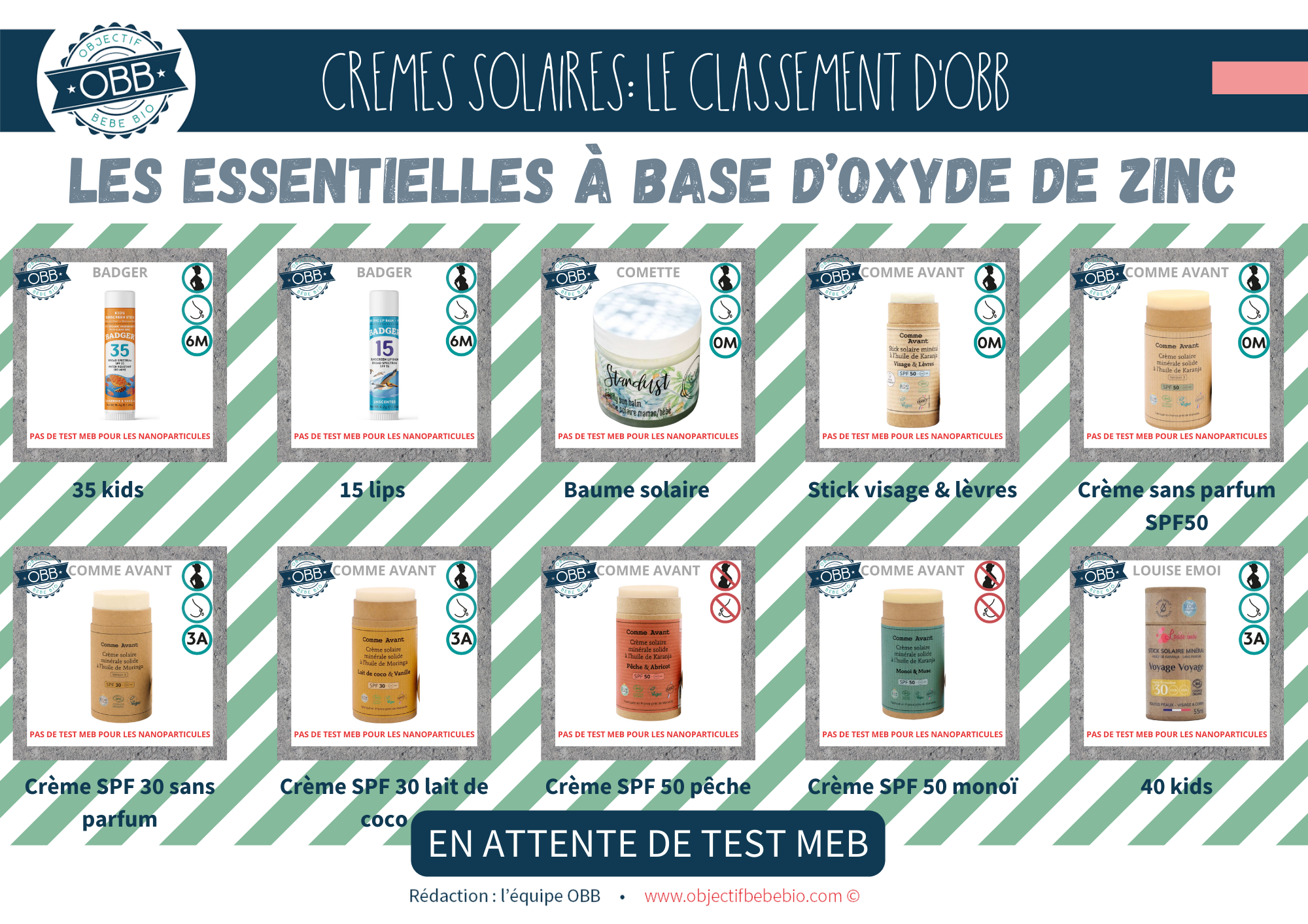 Vous trouverez dans cette catégorie des crèmes solaires avec le minium d’ingrédients possible. Nous n’avons pas encore eu de marque avec un test MEB négatif, donc on ne peut pas être sûr de la non présence de nanoparticules. Cependant nous vous conseillons de vous tourner plutôt vers une crème de cette catégorie, d’où notre choix de concevoir un fond rayé vert. En effet les marque comme Badger, Comme Avant, Aromazone, Comette Cosmétiques, Sol de Ibiza, Louise Emoi, 7 point trop n’en faut ou Suntribe propose des protections solaires à base d’oxyde de zinc avec peu d’ingrédients. Nous n’avons pas de garantie pour les nano mais nous savons que la base répond à nos critères.