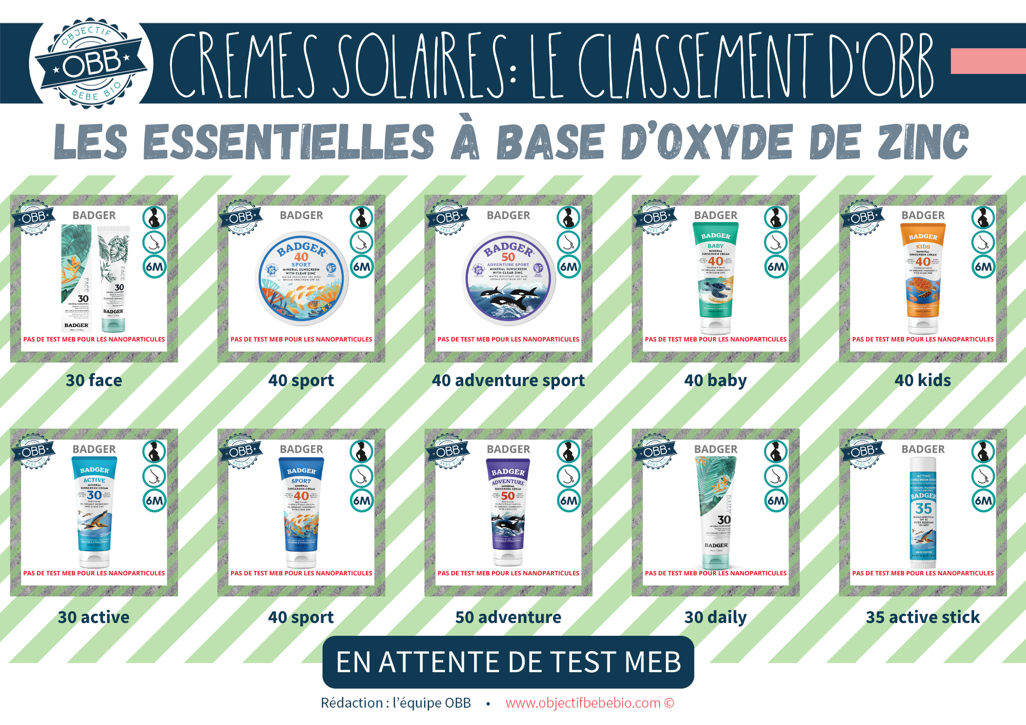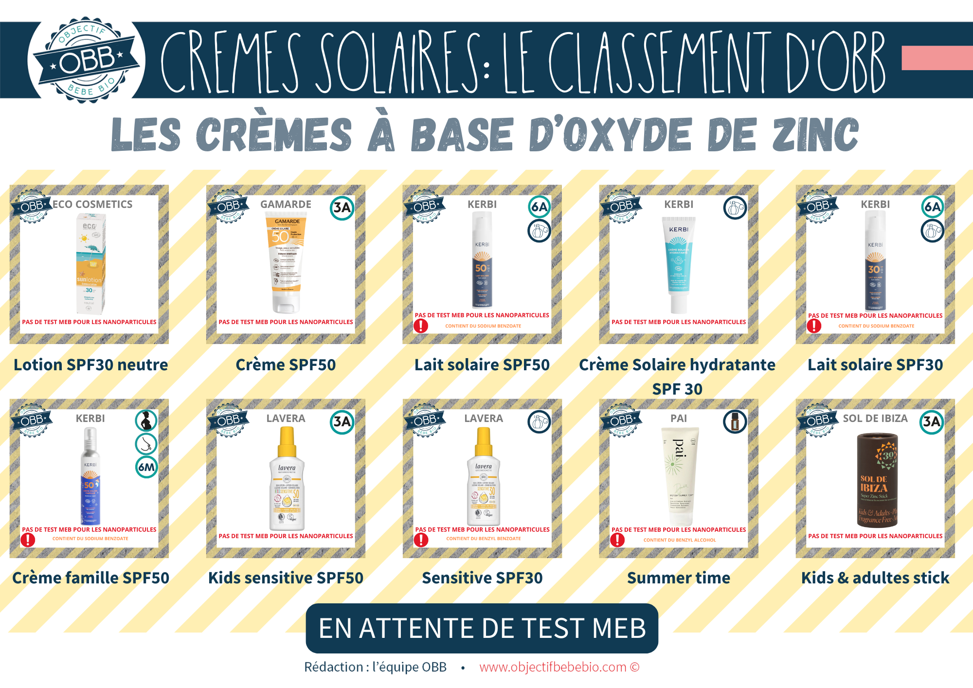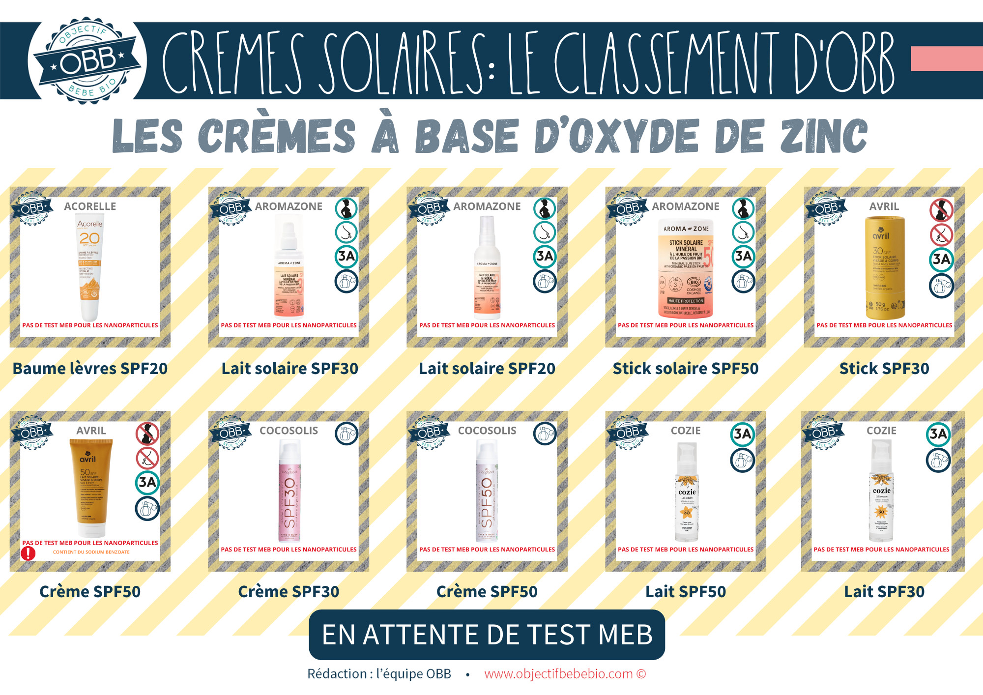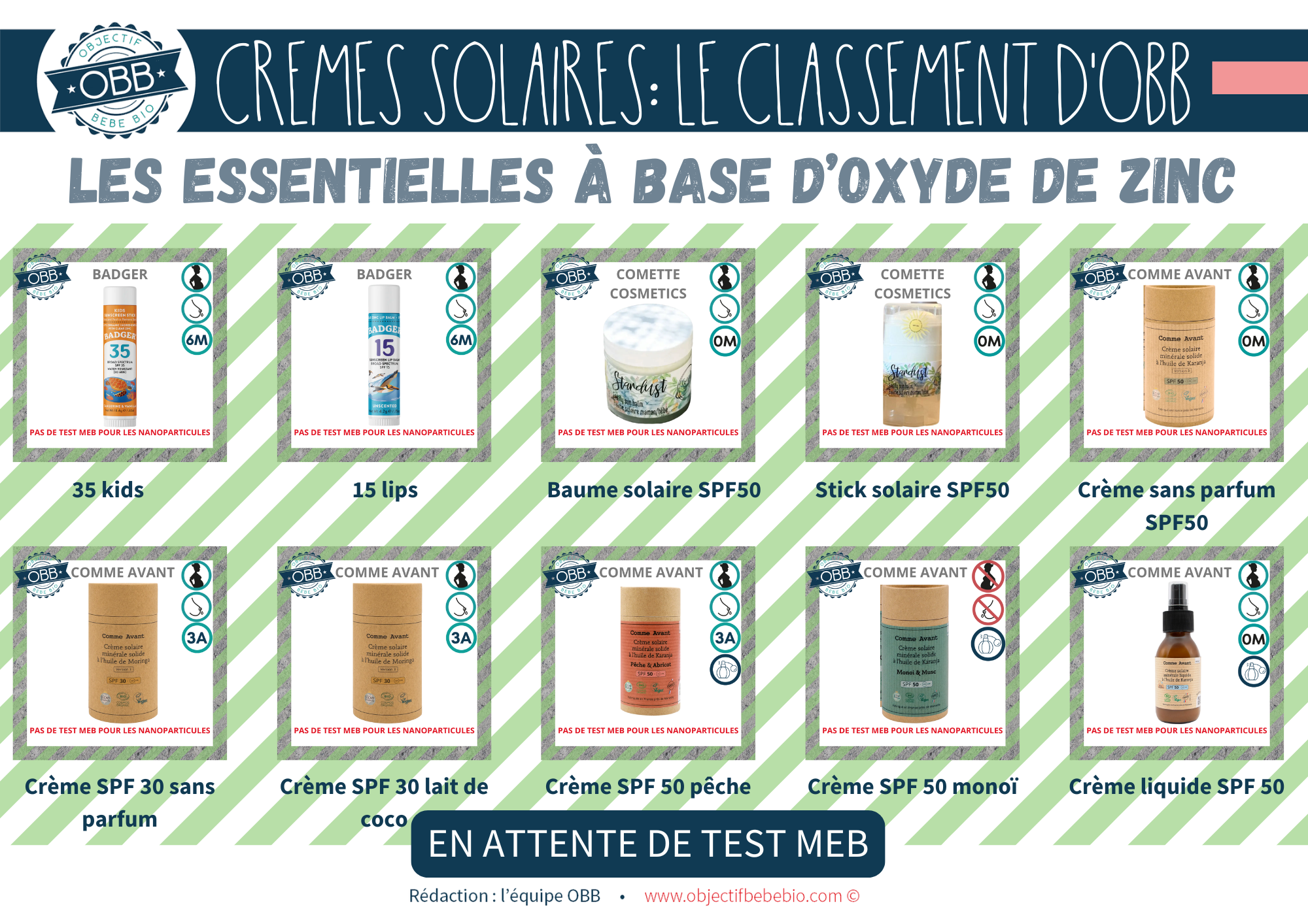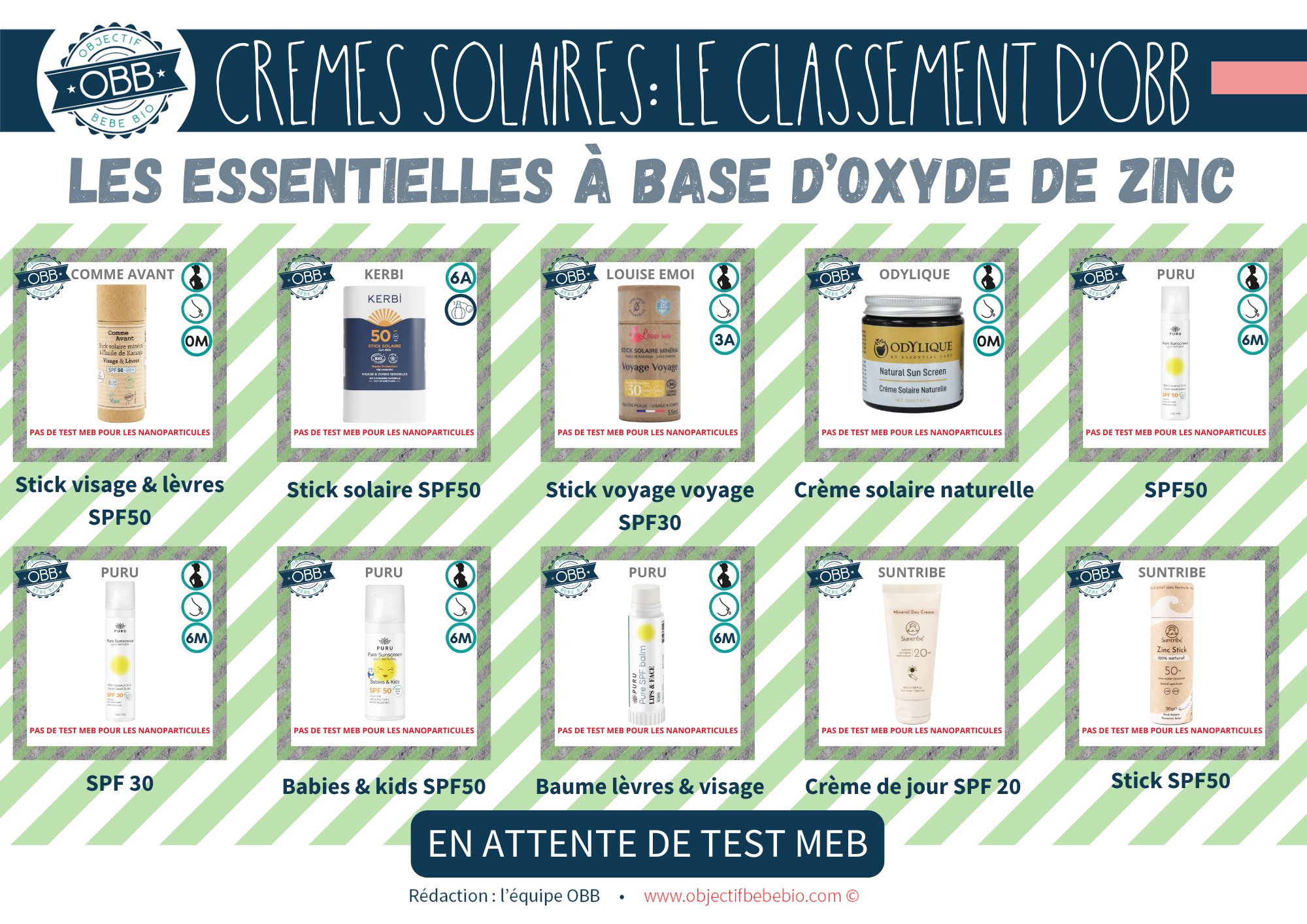 Concernant le choix de la crème solaire nous vous recommandons d’en choisir une à base de zinc avec le moins d’ingrédients possible. C’est pour cette raison que vous trouverez une catégorie oxyde de zinc et composition minimaliste rayée verte et grise. Bien qu’on n’ai pas de test MEB, ce sont des références qui correspondent le plus à notre cahier des charges.