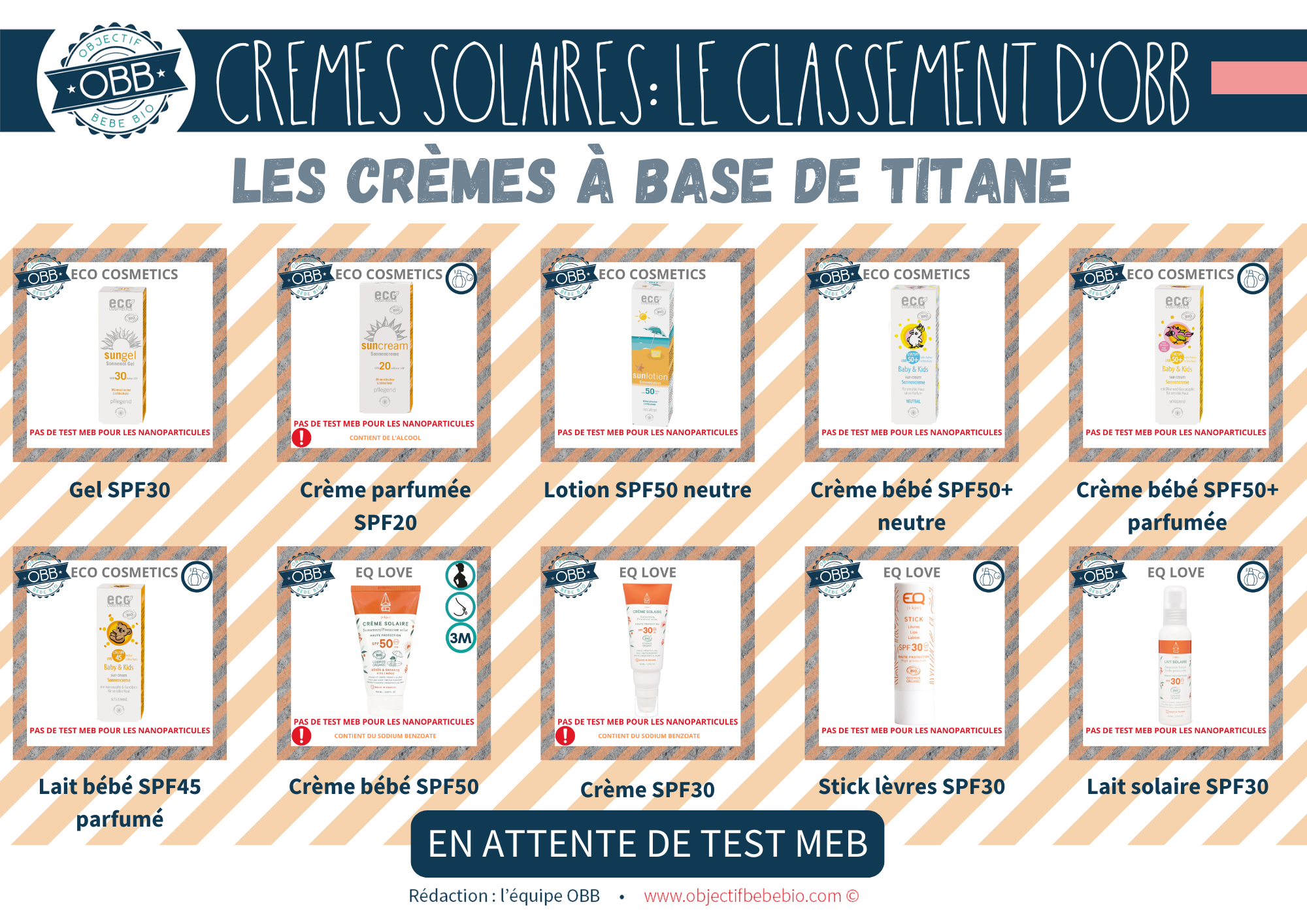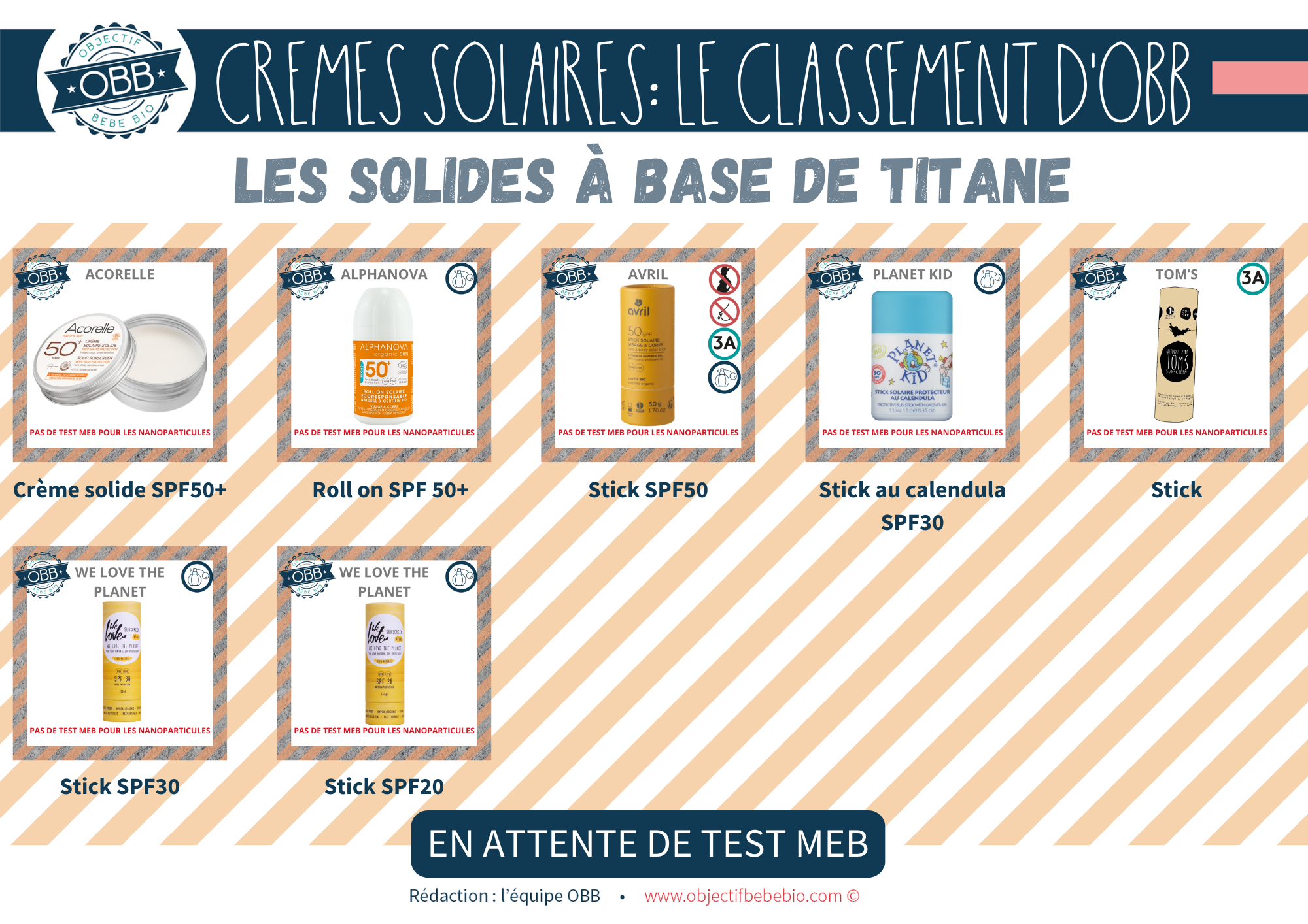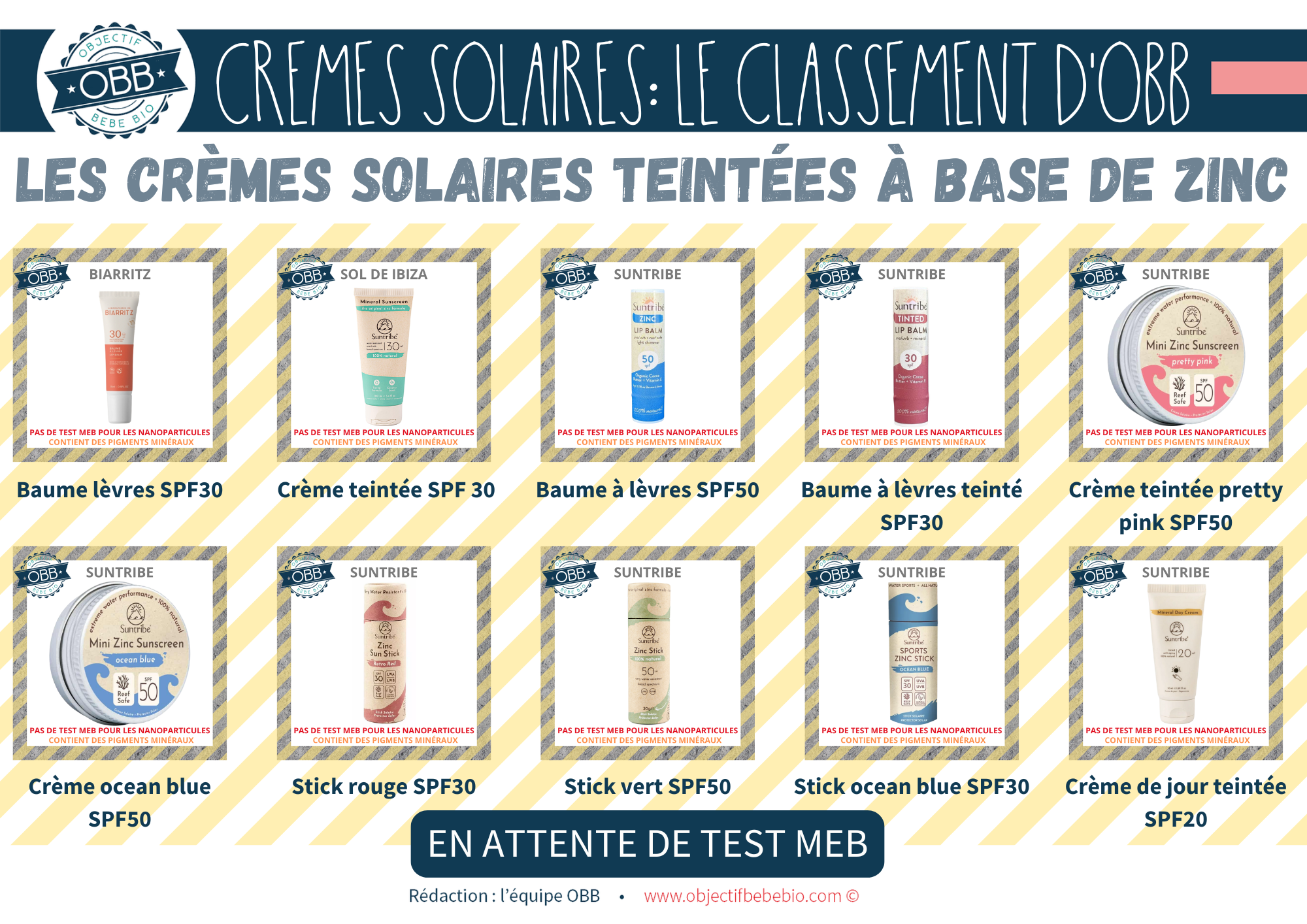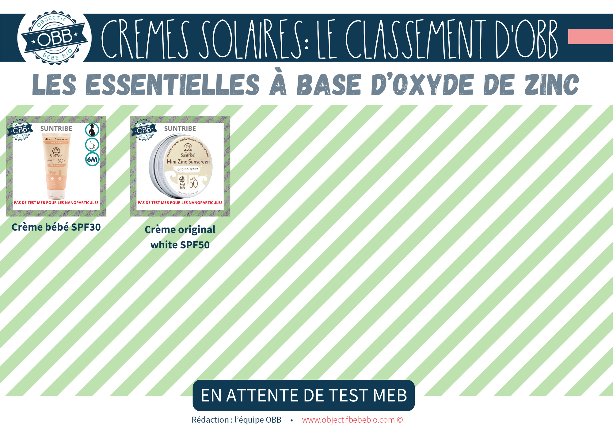 Concernant le choix de la crème solaire nous vous recommandons d’en choisir une à base de zinc avec le moins d’ingrédients possible. C’est pour cette raison que vous trouverez une catégorie oxyde de zinc et composition minimaliste rayée verte et grise. Bien qu’on n’ai pas de test MEB, ce sont des références qui correspondent le plus à notre cahier des charges.