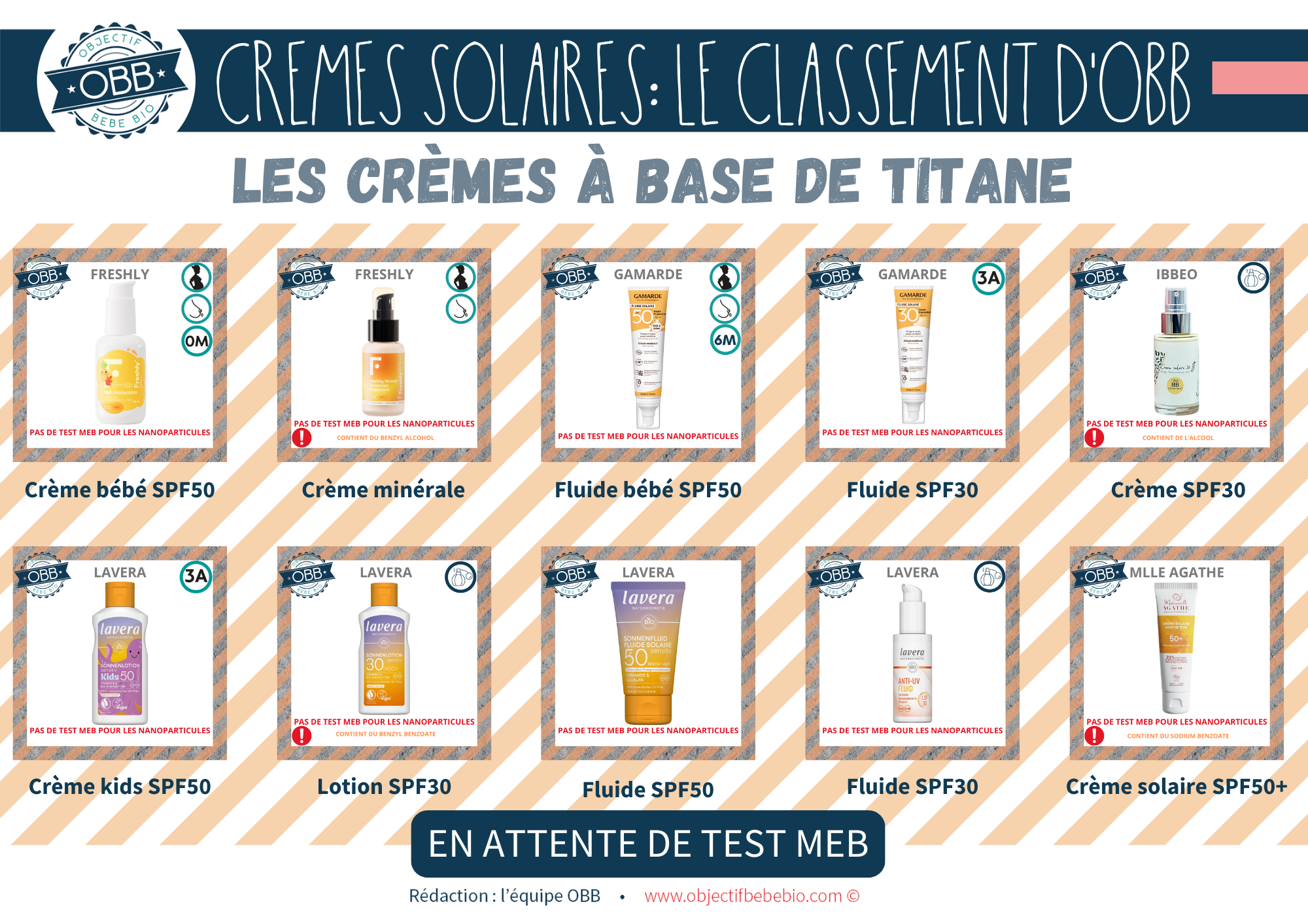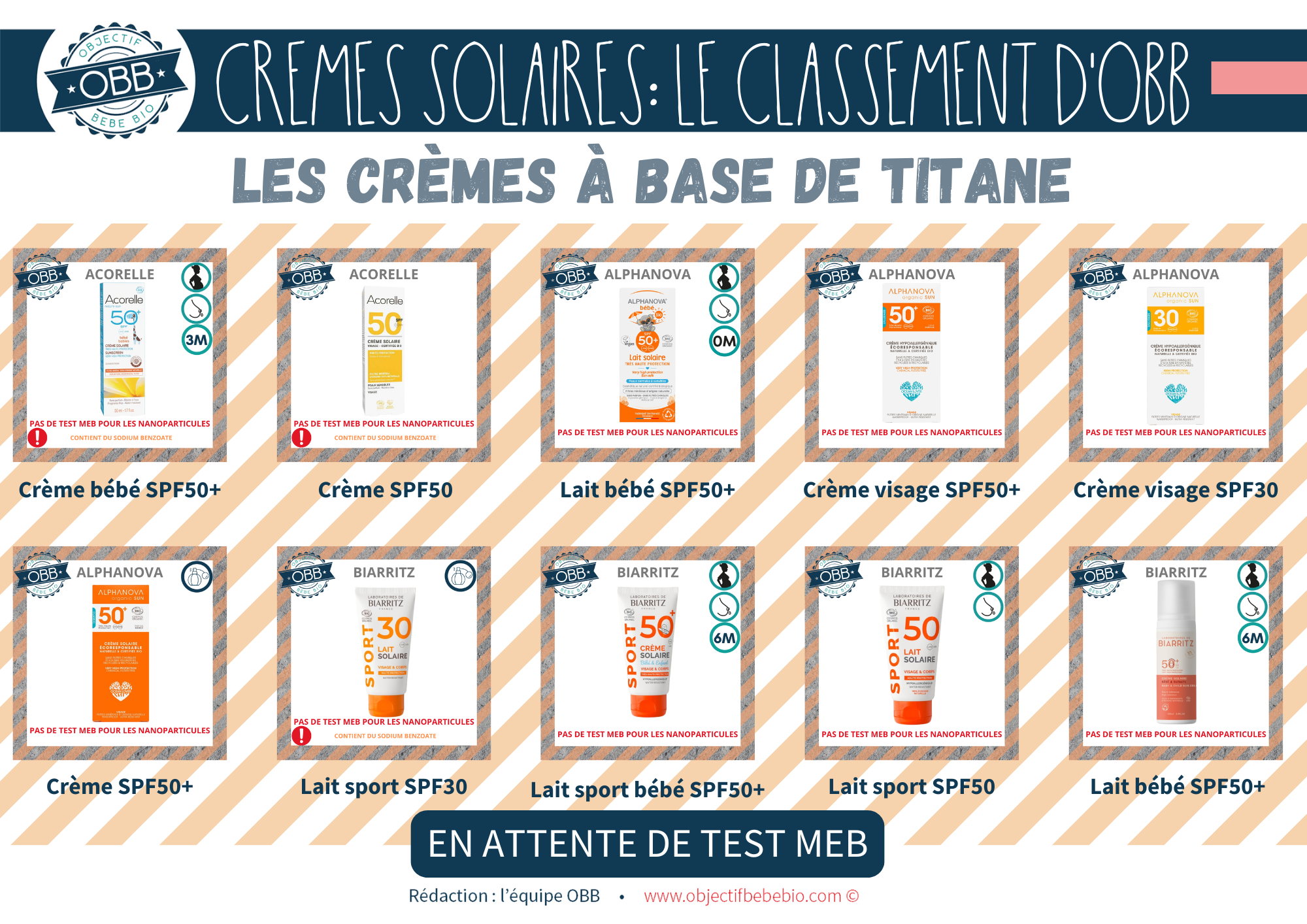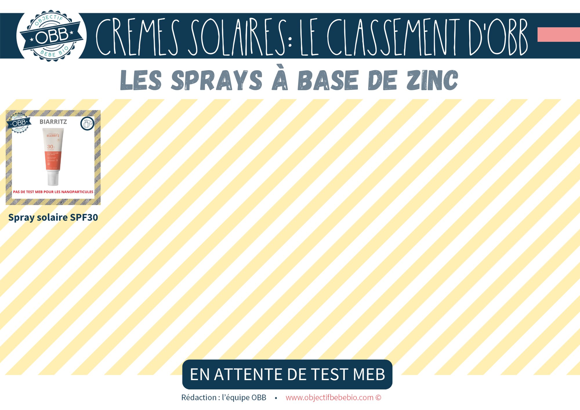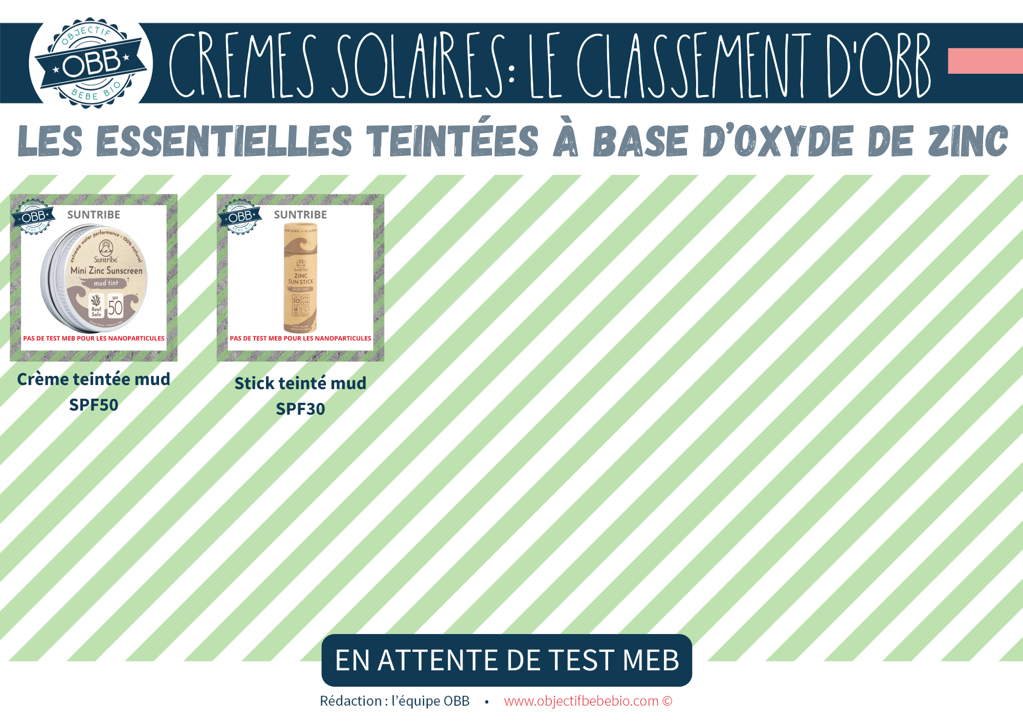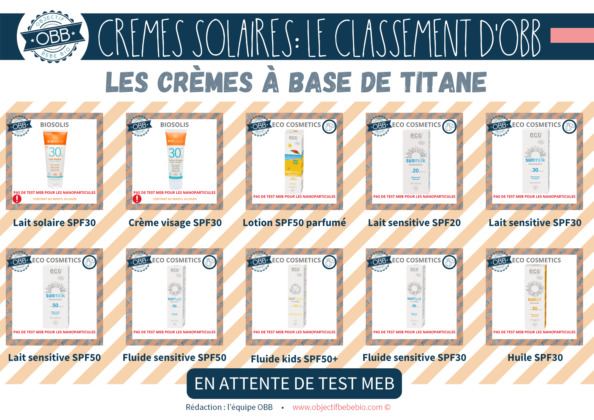 Concernant le choix de la crème solaire nous vous recommandons d’en choisir une à base de zinc avec le moins d’ingrédients possible. C’est pour cette raison que vous trouverez une catégorie oxyde de zinc et composition minimaliste rayée verte et grise. Bien qu’on n’ai pas de test MEB, ce sont des références qui correspondent le plus à notre cahier des charges.
