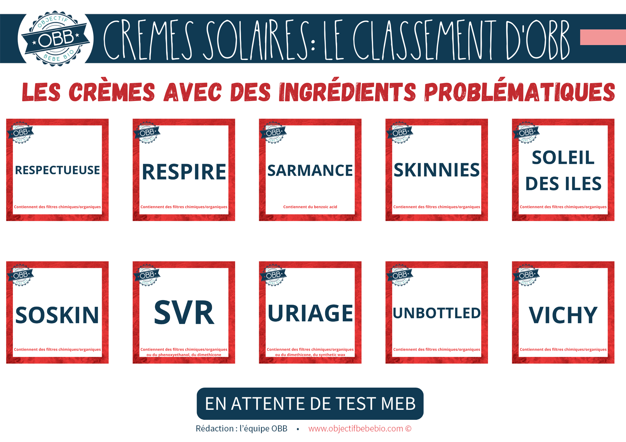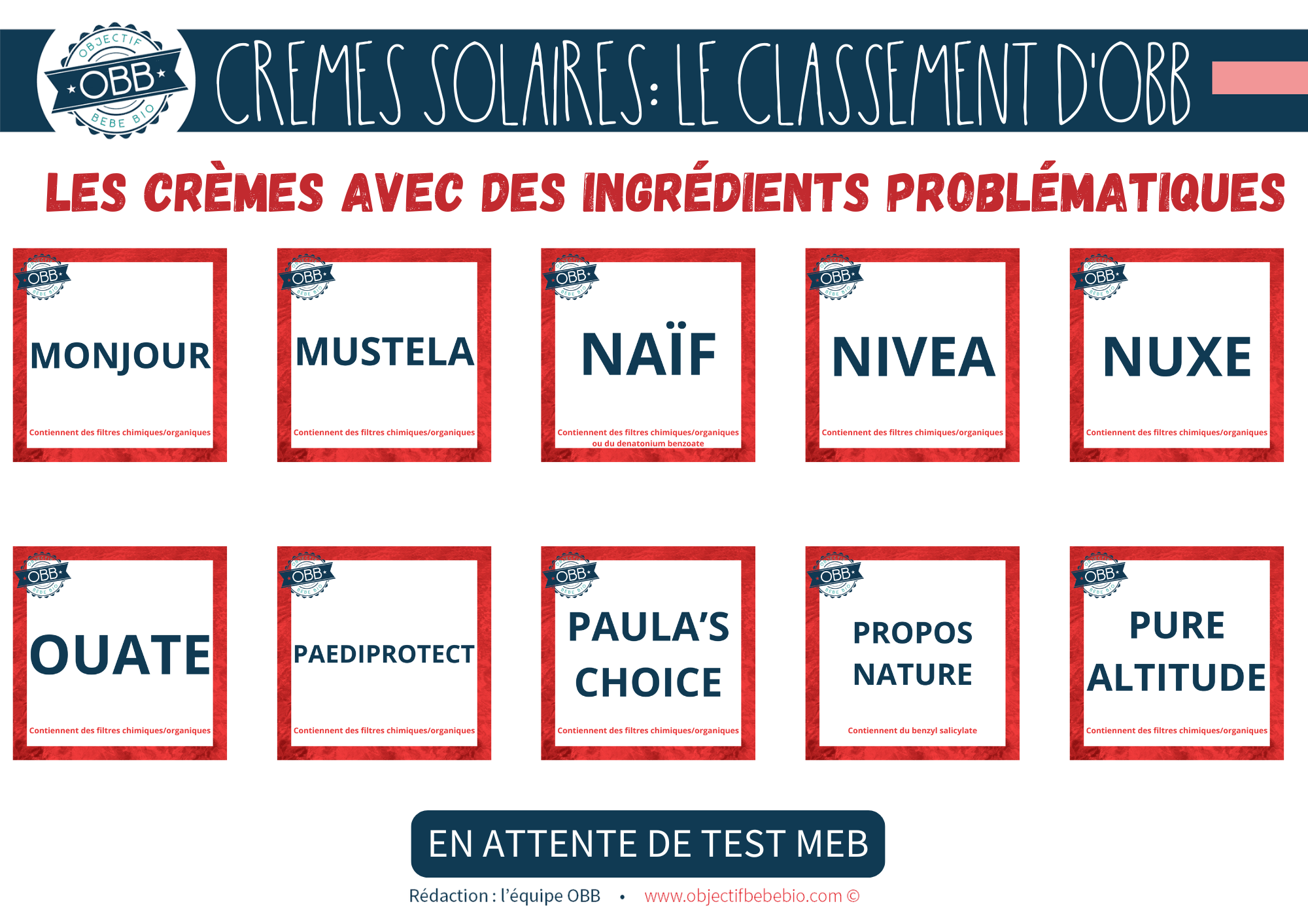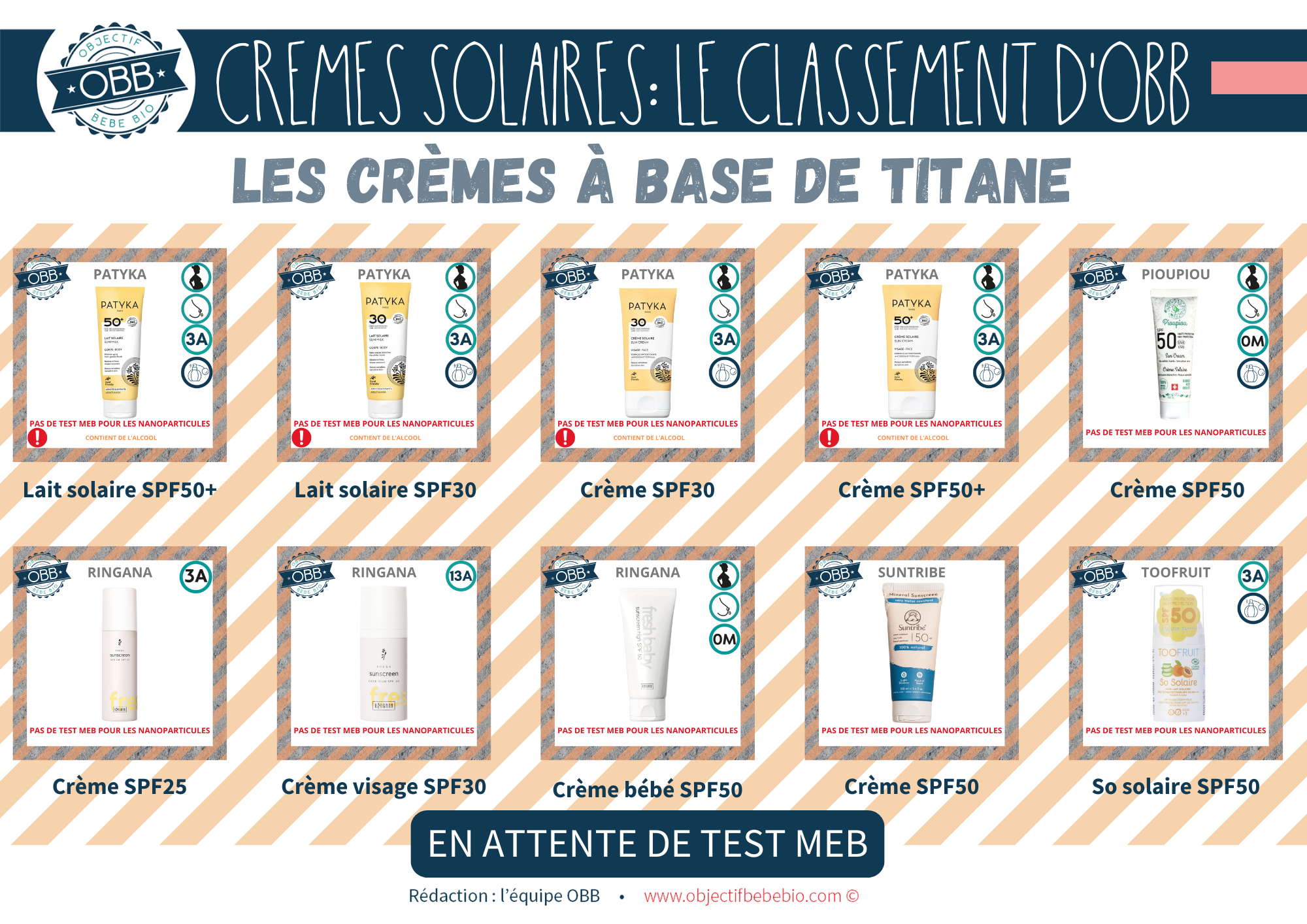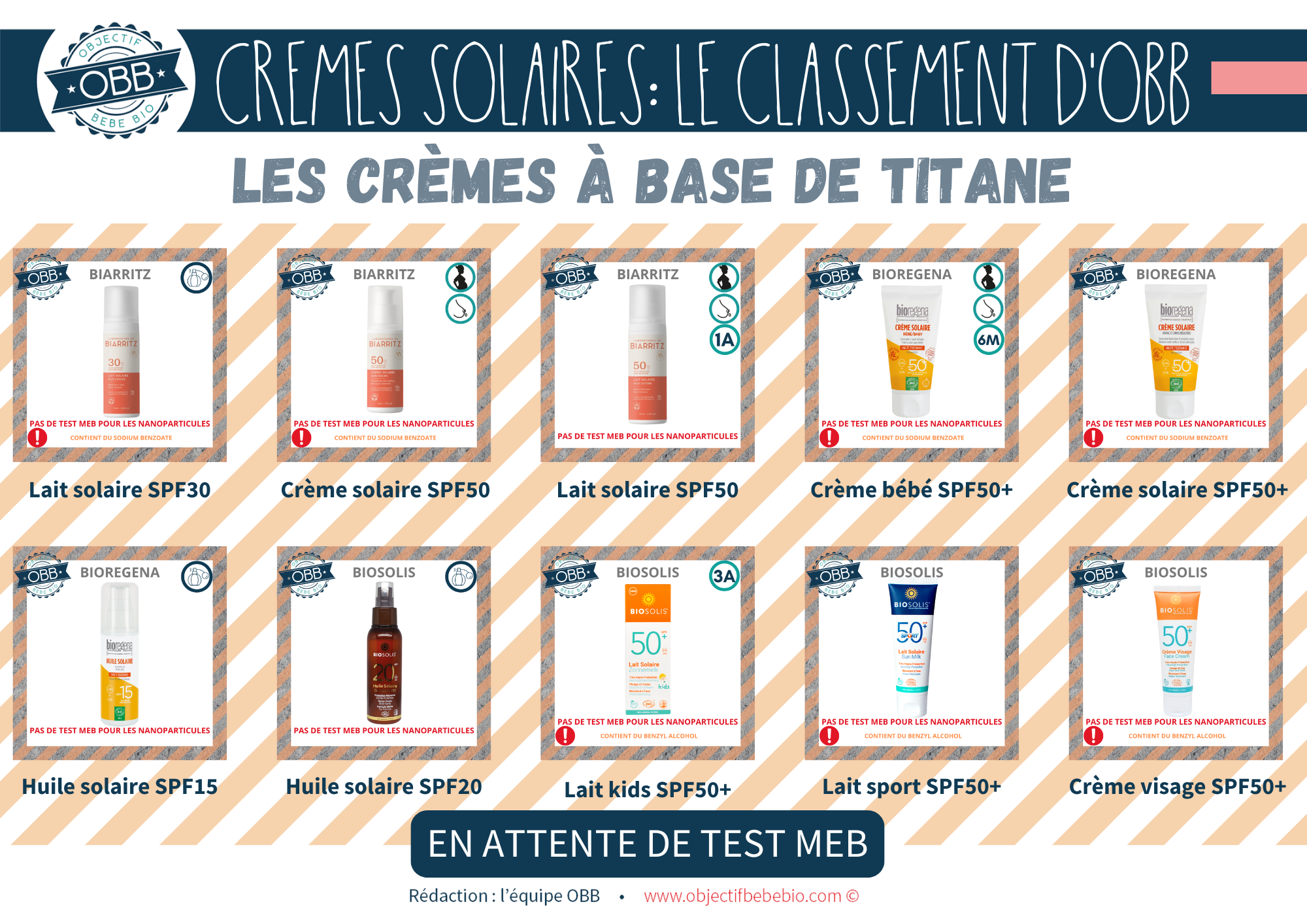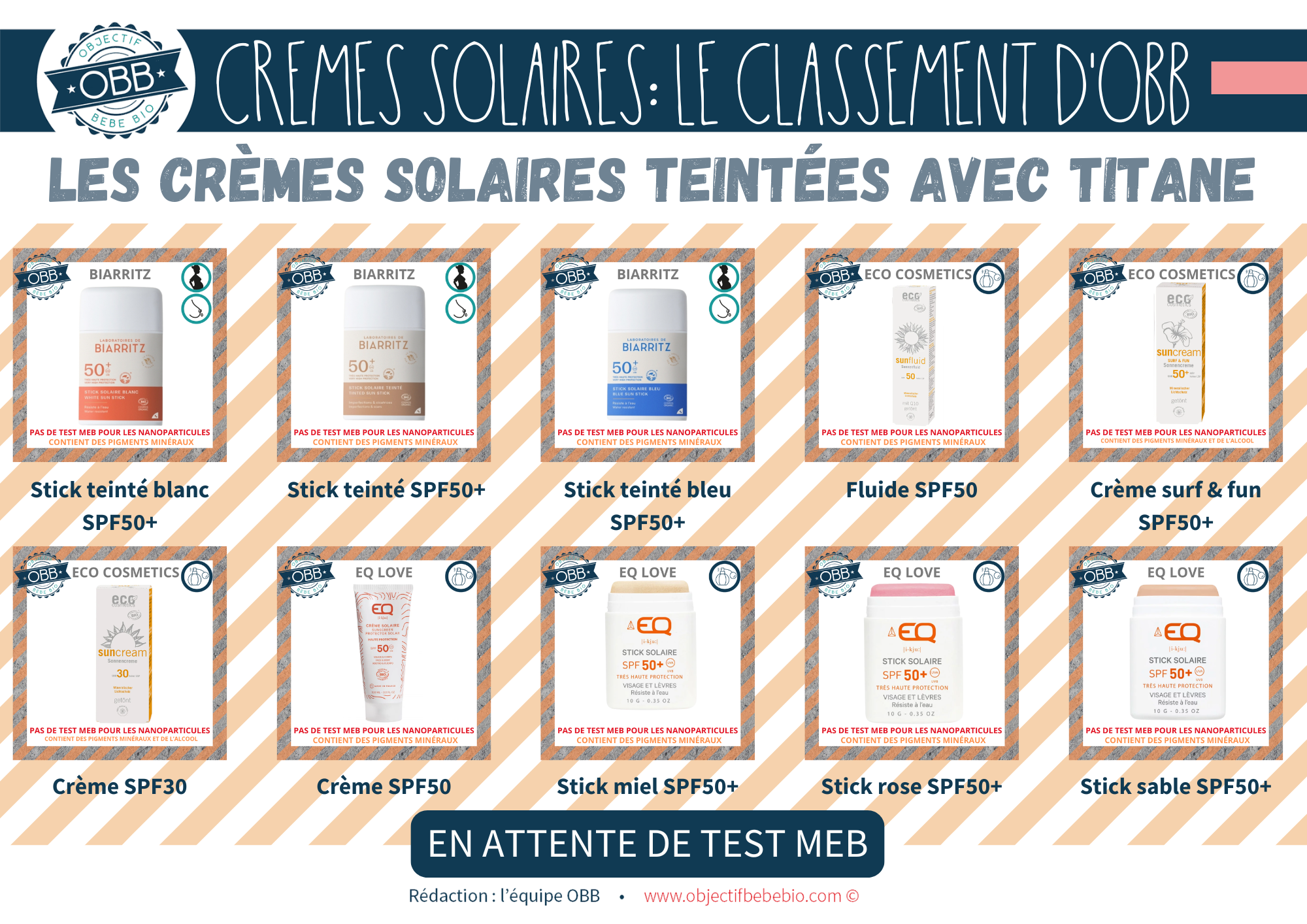 Concernant le choix de la crème solaire nous vous recommandons d’en choisir une à base de zinc avec le moins d’ingrédients possible. C’est pour cette raison que vous trouverez une catégorie oxyde de zinc et composition minimaliste rayée verte et grise. Bien qu’on n’ai pas de test MEB, ce sont des références qui correspondent le plus à notre cahier des charges.