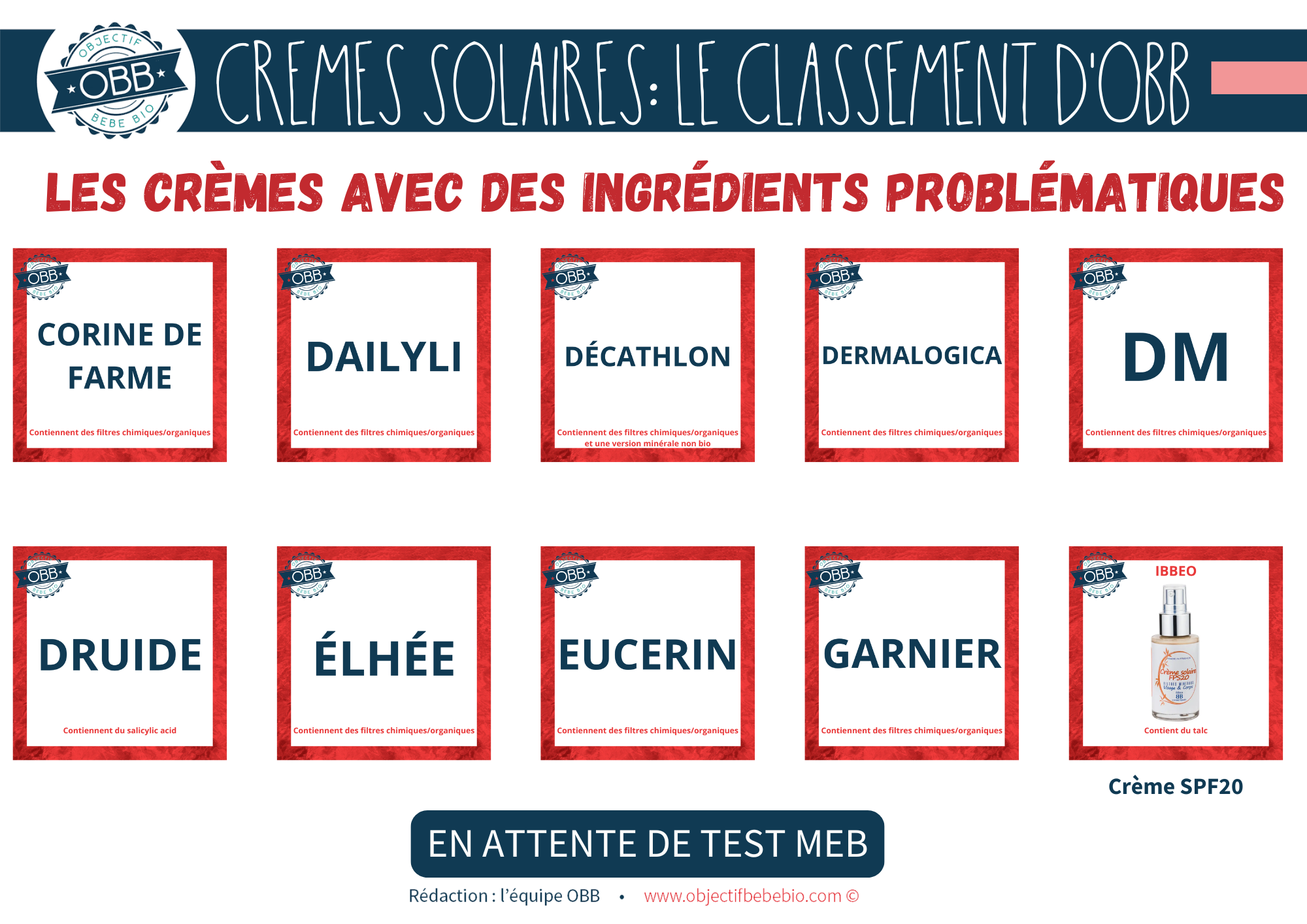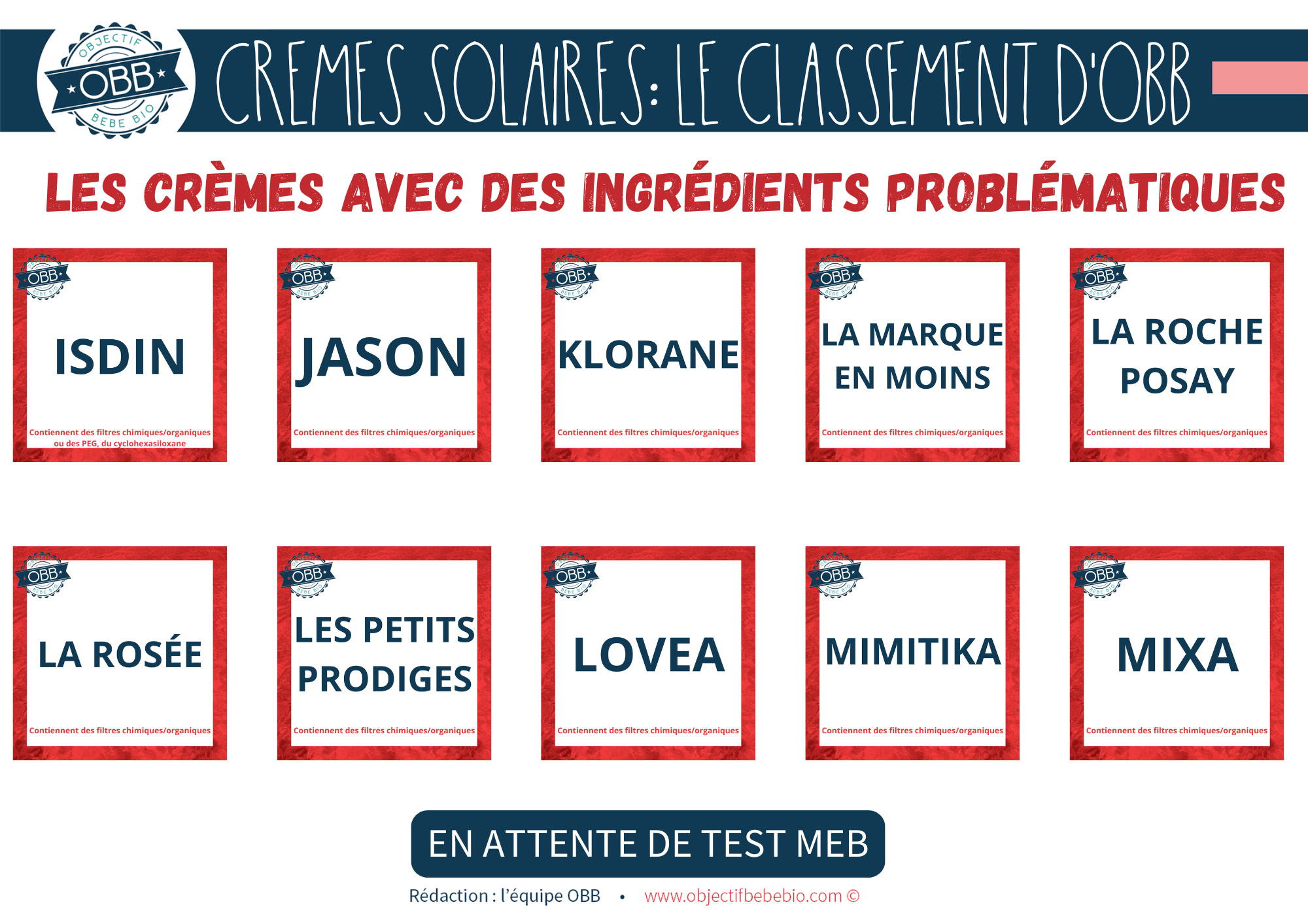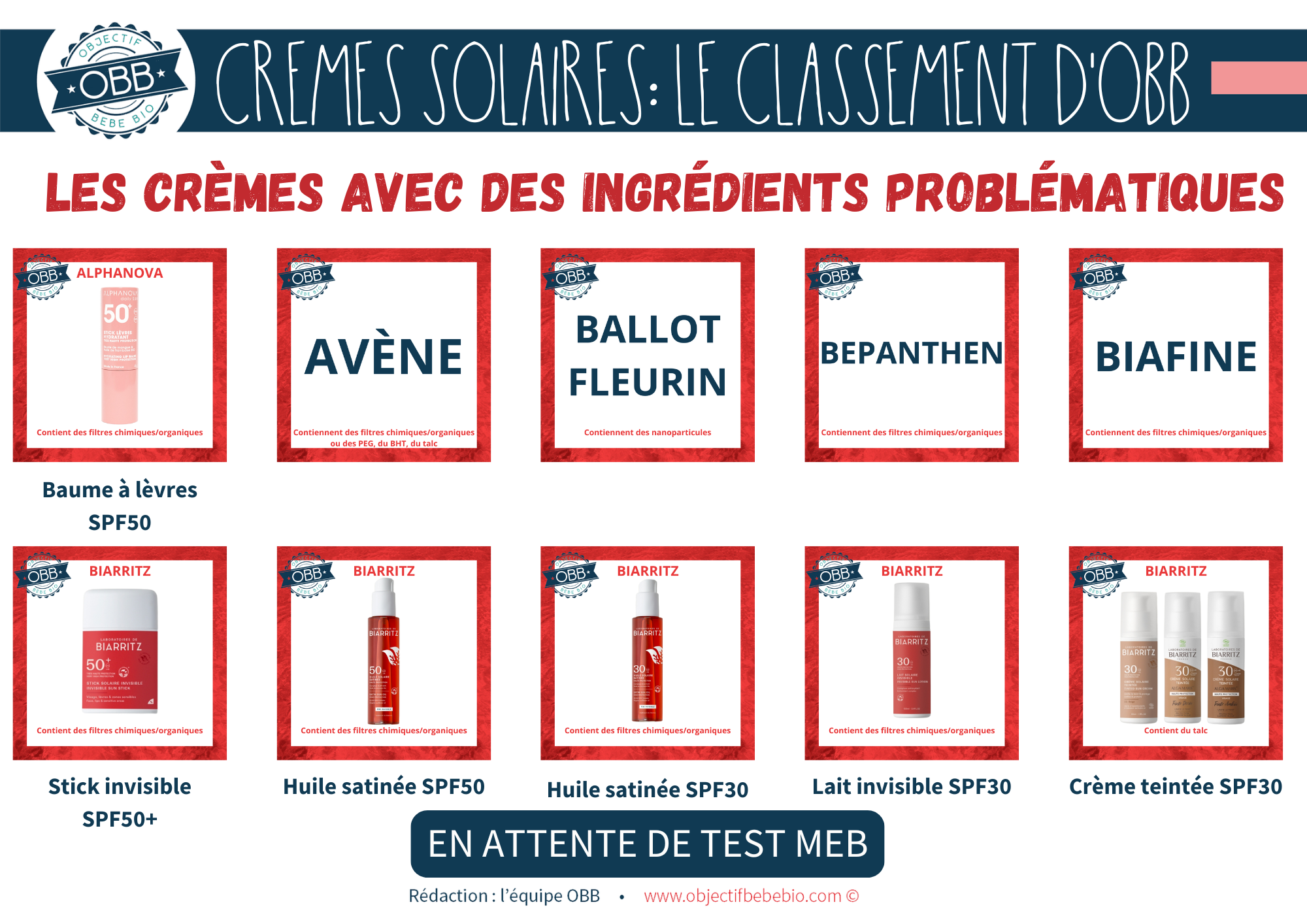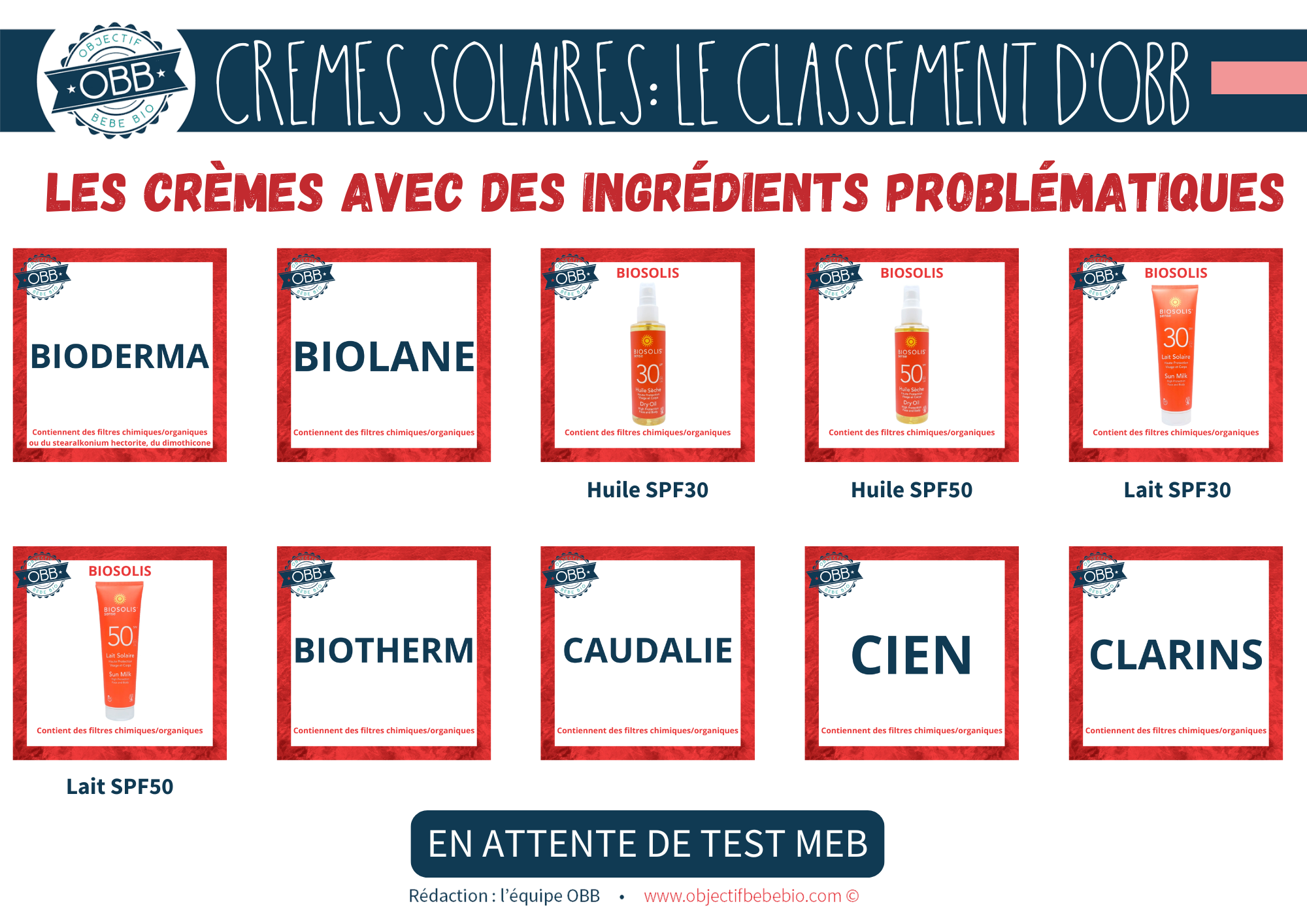 Comme vous pouvez le constater certaines marques proposent à la fois une crème solaire minérale et également des versions avec des filtres chimiques, c’est le cas par exemple des marque Alphanova et Biarritz. D’autres marques ont fait le choix de fabriquer uniquement des crèmes avec des filtres organiques comme Mustela, Lidl, Avene, La rosée, Biolane, La Roche Posay, Respire, Clarins, Klorane etc.
