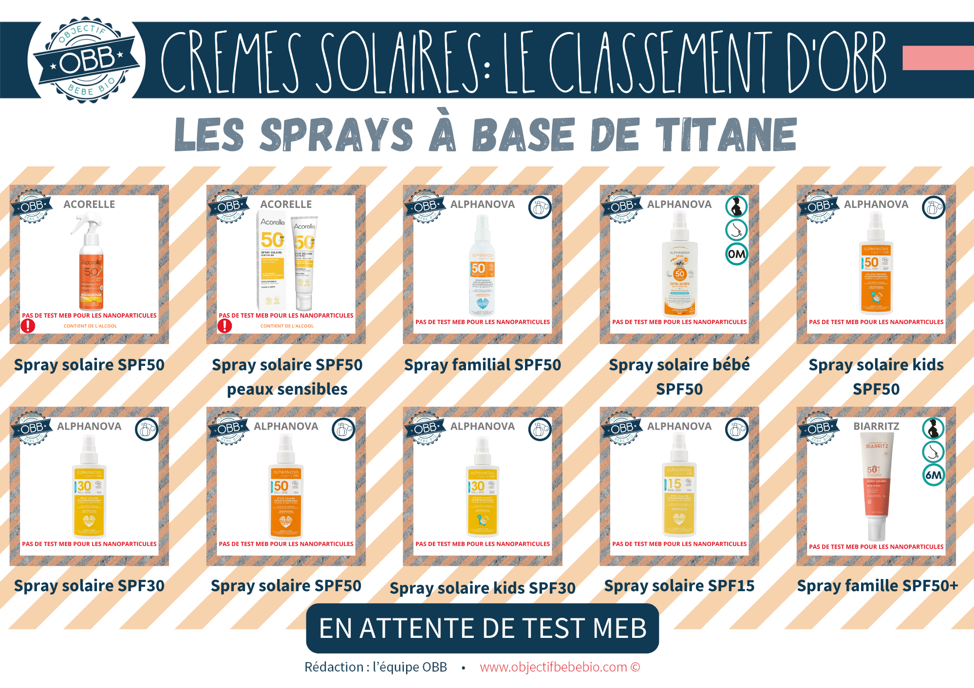 Nous savons que certains parents préférent le format spray, car il est plus facile à appliquer sur les enfants qui n’aiment pas mettre de creme solaire. Vous trouverez dans l’image ci dessous des références Acorelle, Laboratoire Biarritz, Alphanova, Lavera ou encore Bioregena qui ont ce type de format mais ils contiennent du dioxyde de titane.