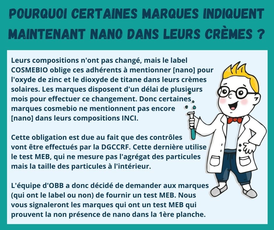 Nous en avons contacté certaines, par téléphone, et leur réponse est la suivante : Suite a la table ronde du 22 mars 2022 « les rencontres règlementaires » organises par Cosmed La règlementation aurait change … On nous explique que dorénavant toutes les compo INCI de produits solaires « certifiés bio » contenant du dioxyde de titane et/ou de l’oxyde de zinc doivent inscrire [nano] même si la présence de nanoparticules n’est pas avérée.