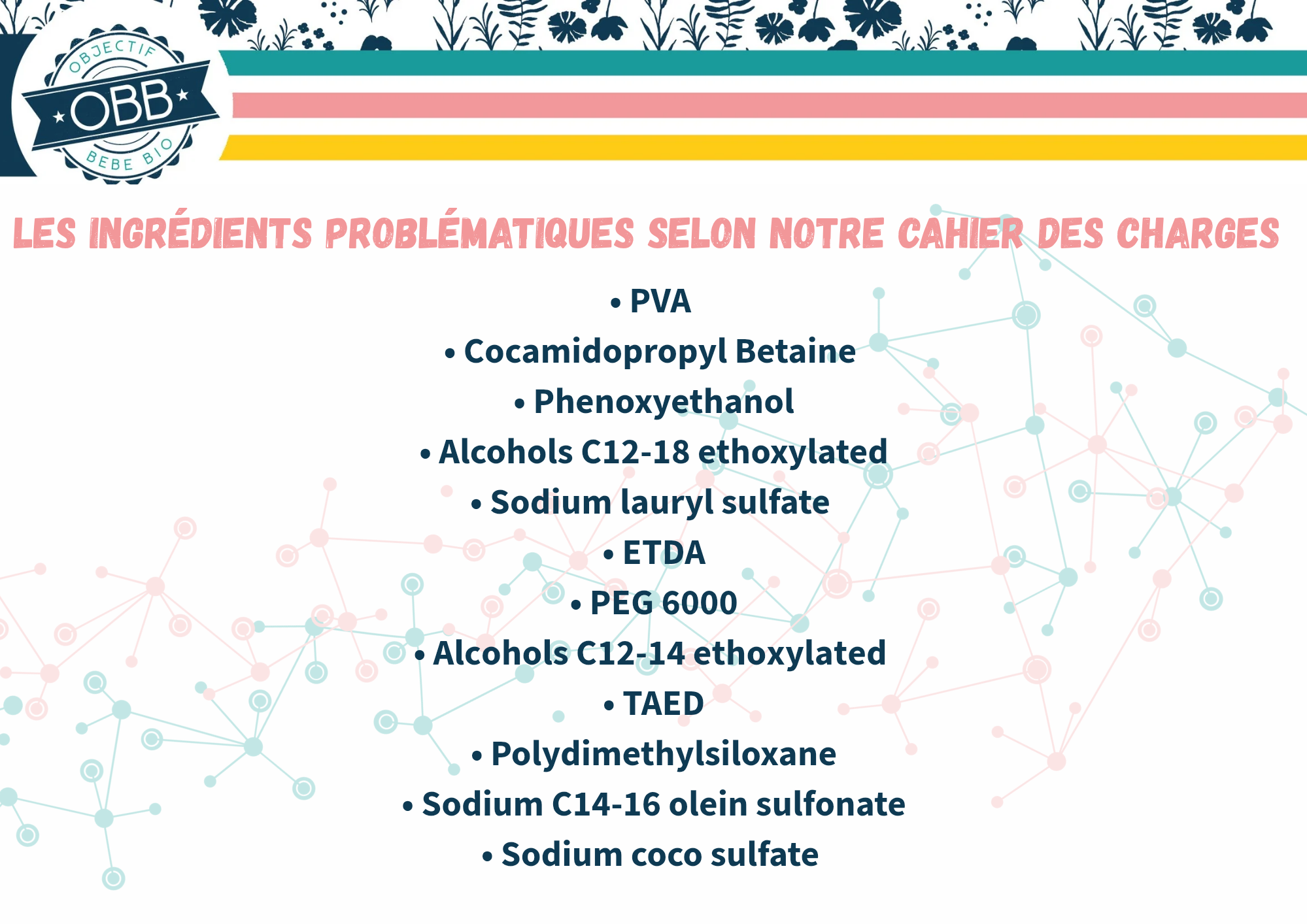 Voici la liste des molécules qui ne répondent pas à notre cahier des charges, que nous avons pu trouver dans ce type de produit. Cette liste peut être amené à évoluer si d’autres produits sont rajoutés au classement ou si par exemple de nouvelles études sont publiées.