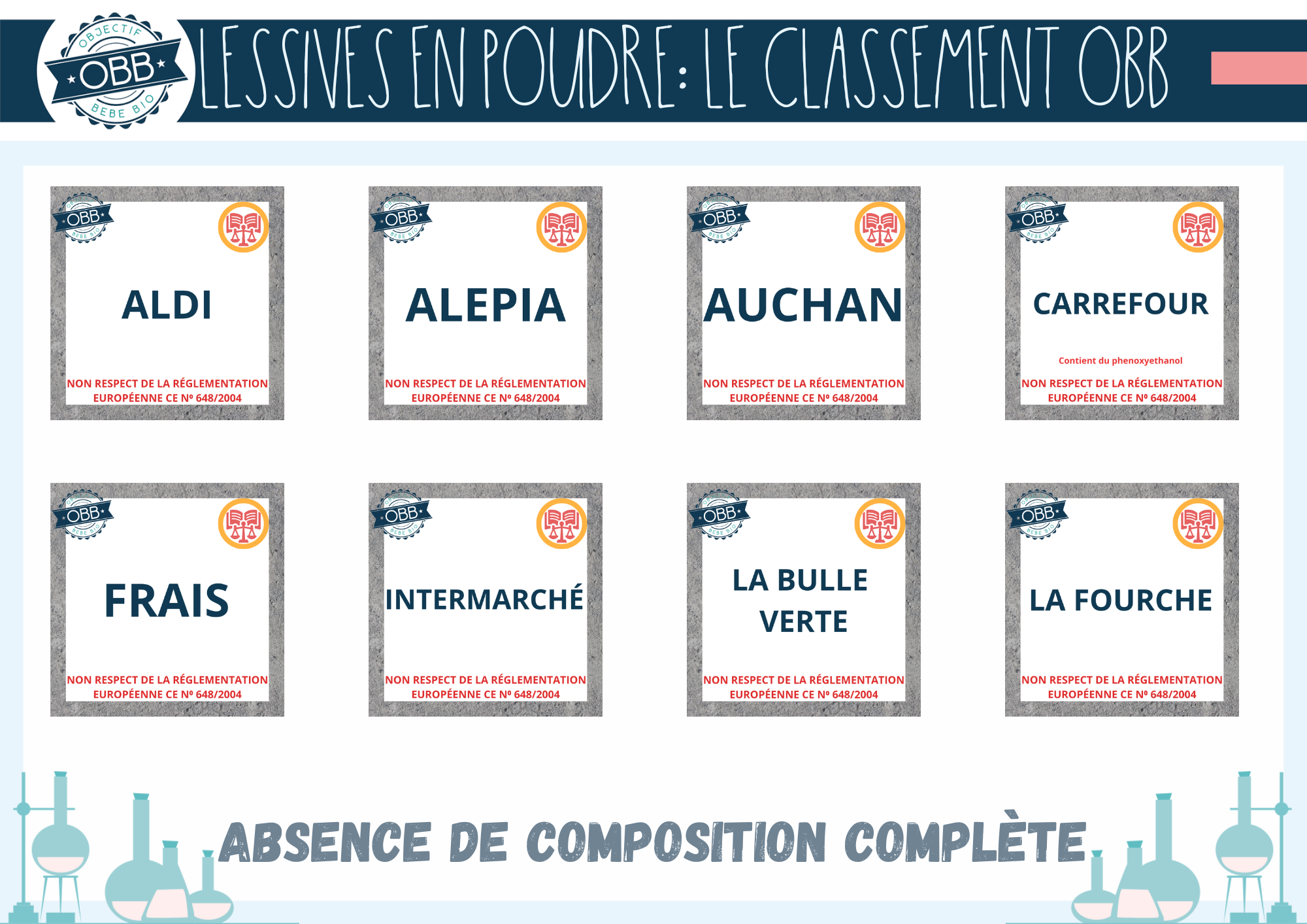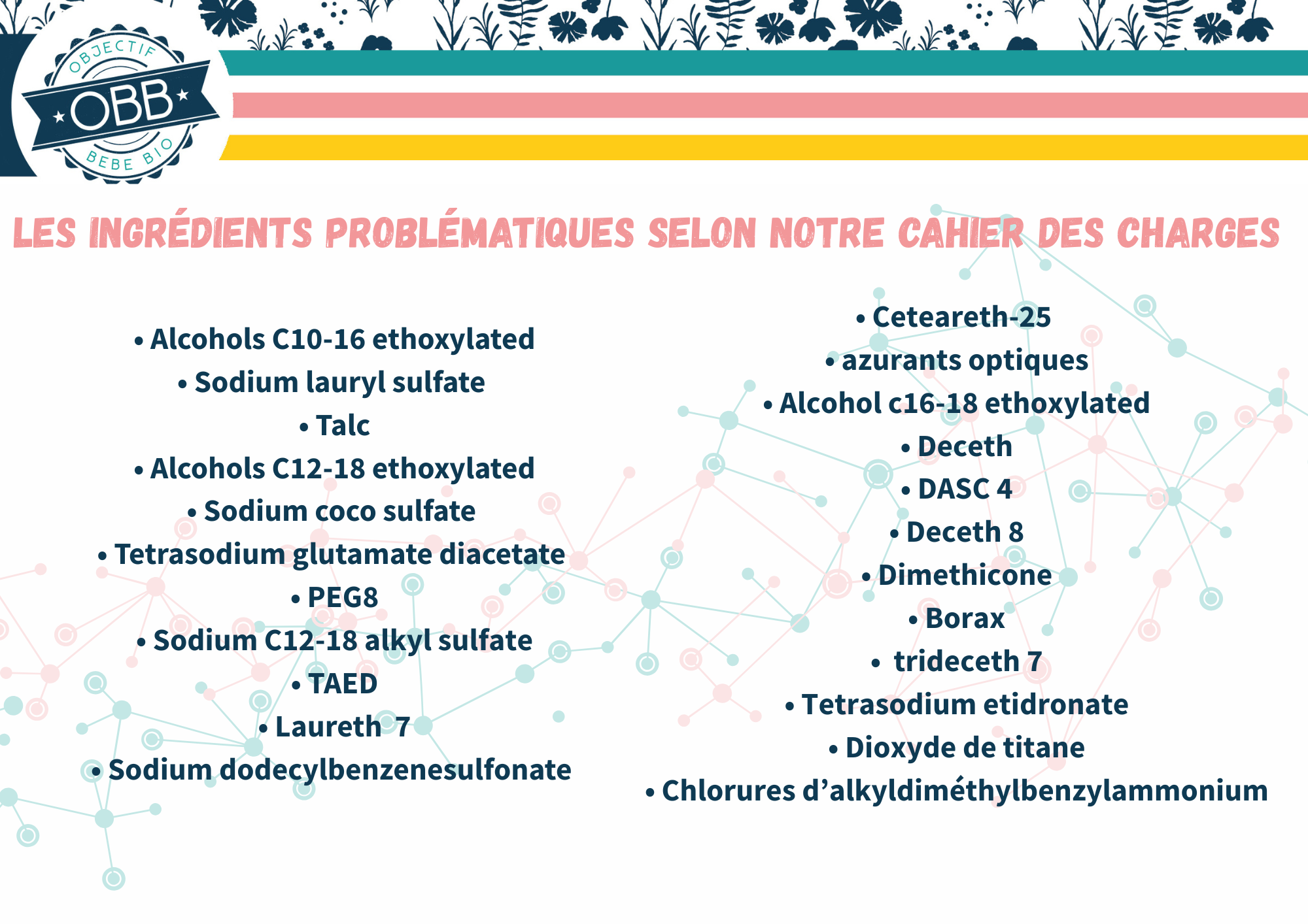Voici la liste des molécules qui ne répondent pas à notre cahier des charges, que nous avons pu trouver dans ce type de produit. Cette liste peut être amené à évoluer si d’autres produits sont rajoutés au classement ou si par exemple de nouvelles études sont publiées.