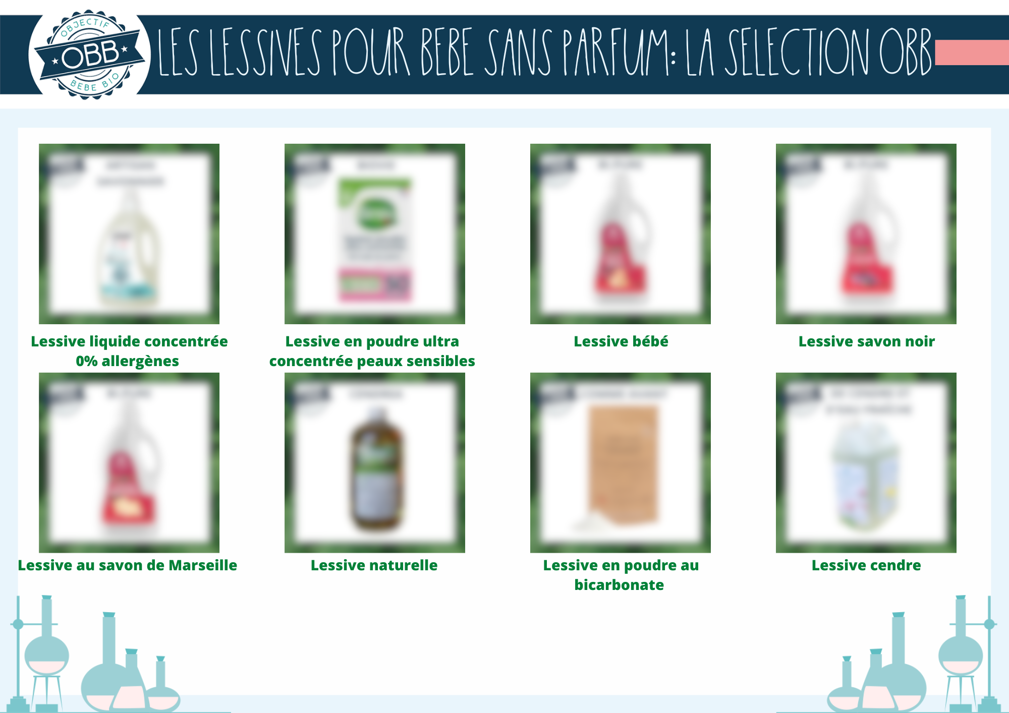 En cliquant sur les images, vous aurez accès aux différents guides d’achat. Les lessives sont classées par format: liquides, poudres, feuilles et capsules/tablettes. Vous trouverez également notre sélection spéciale bébé, avec des lessives sans parfum !