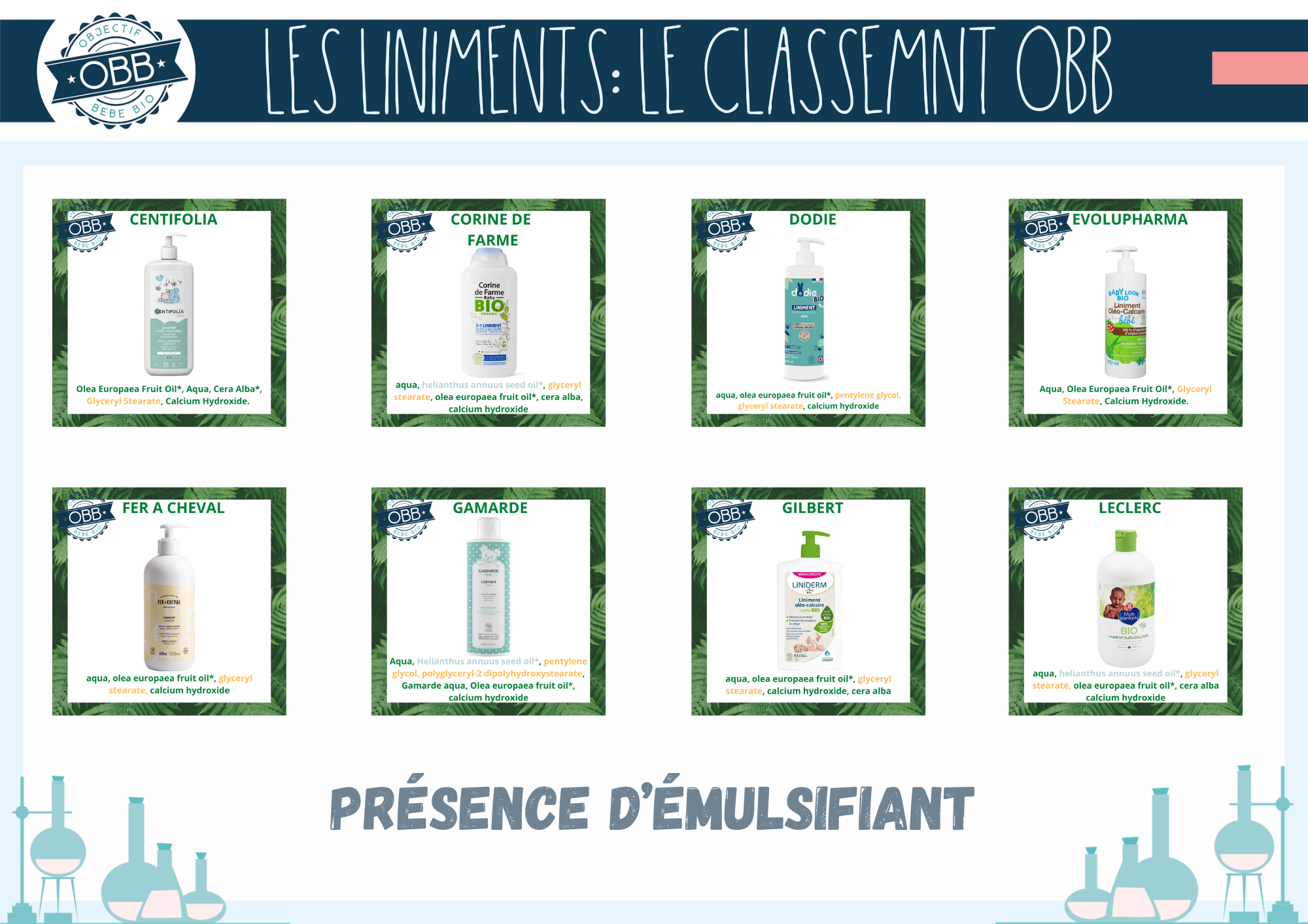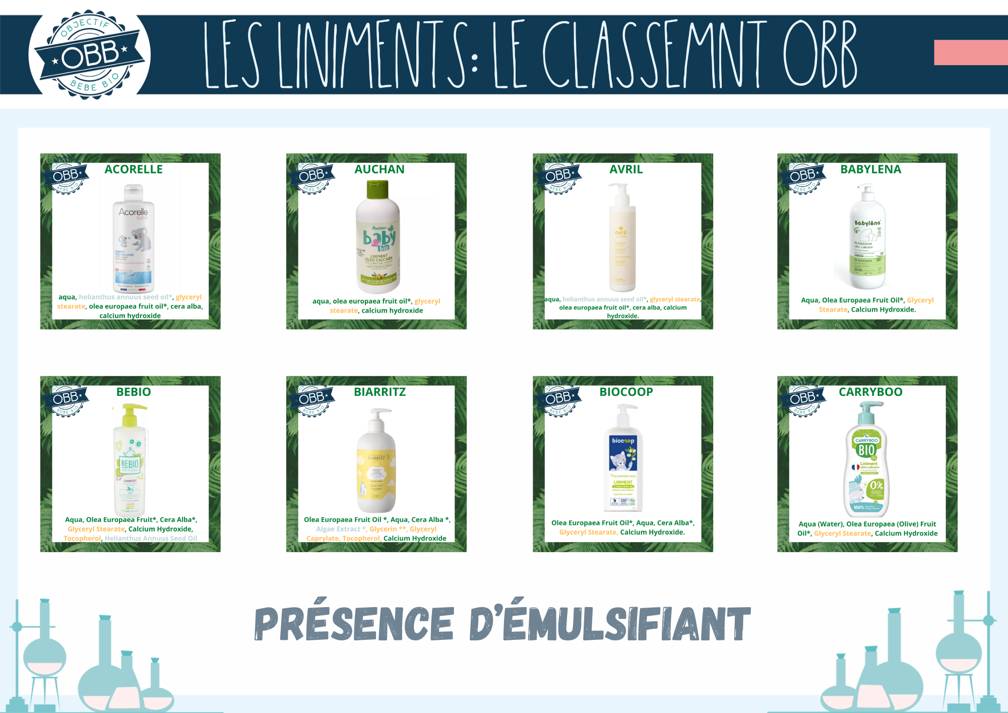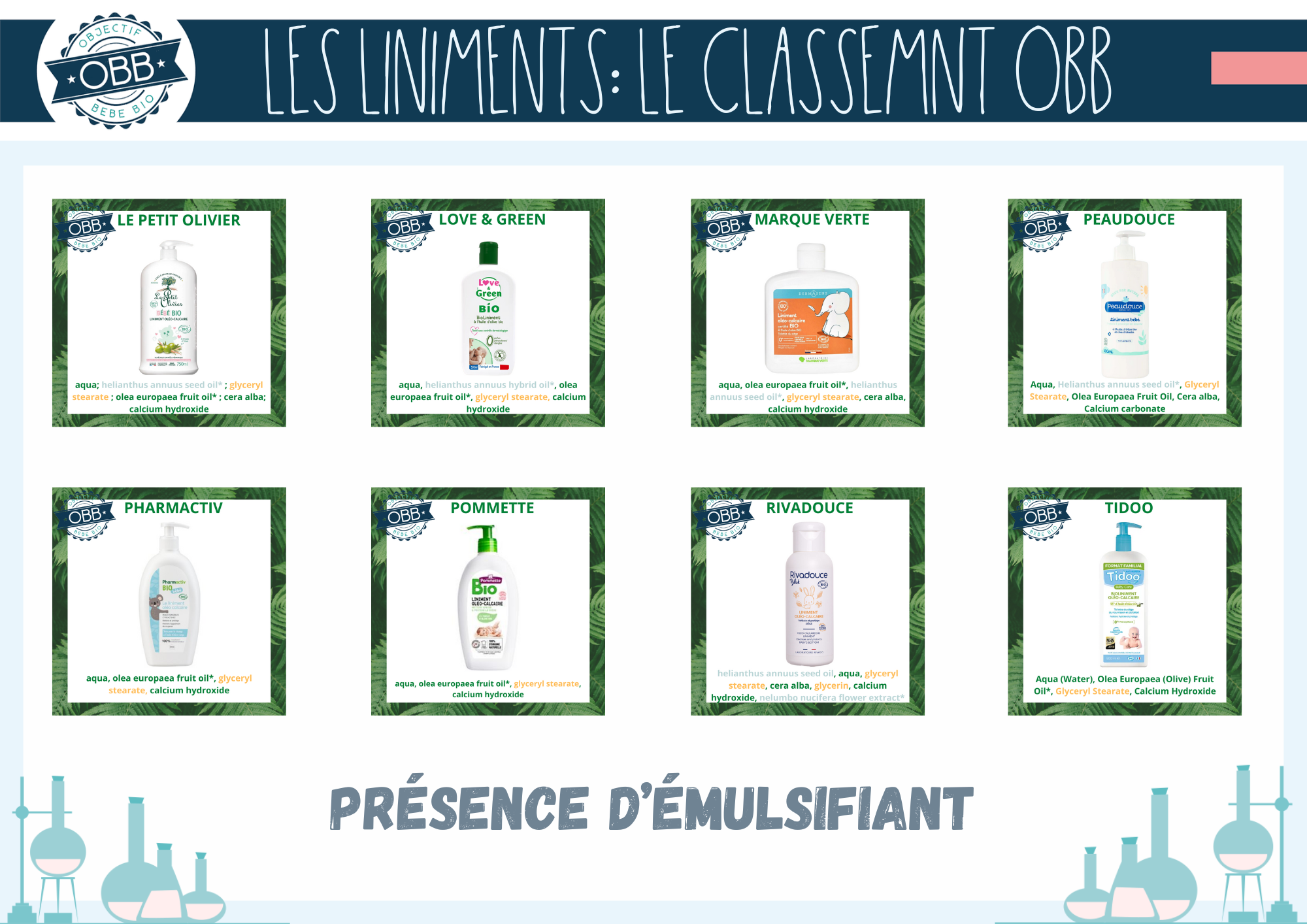 Pour les trois premières catégories, nous avons ajouté la composition INCI de chaque liniment sur les vignettes. Ce choix vous permet de mieux visualiser la présence d’ingrédients supplémentaires. En jaune les conservateurs et émulsifiants. Bien que ces ingrédients de soient pas problématiques pour votre bébé ils ne sont pas indispensables. En bleu gris il s’agit des autres extrait de végétaux, en dehors de l’huile d’olive comme par exemple l’huile de tournesol ou le macérat de calendula.