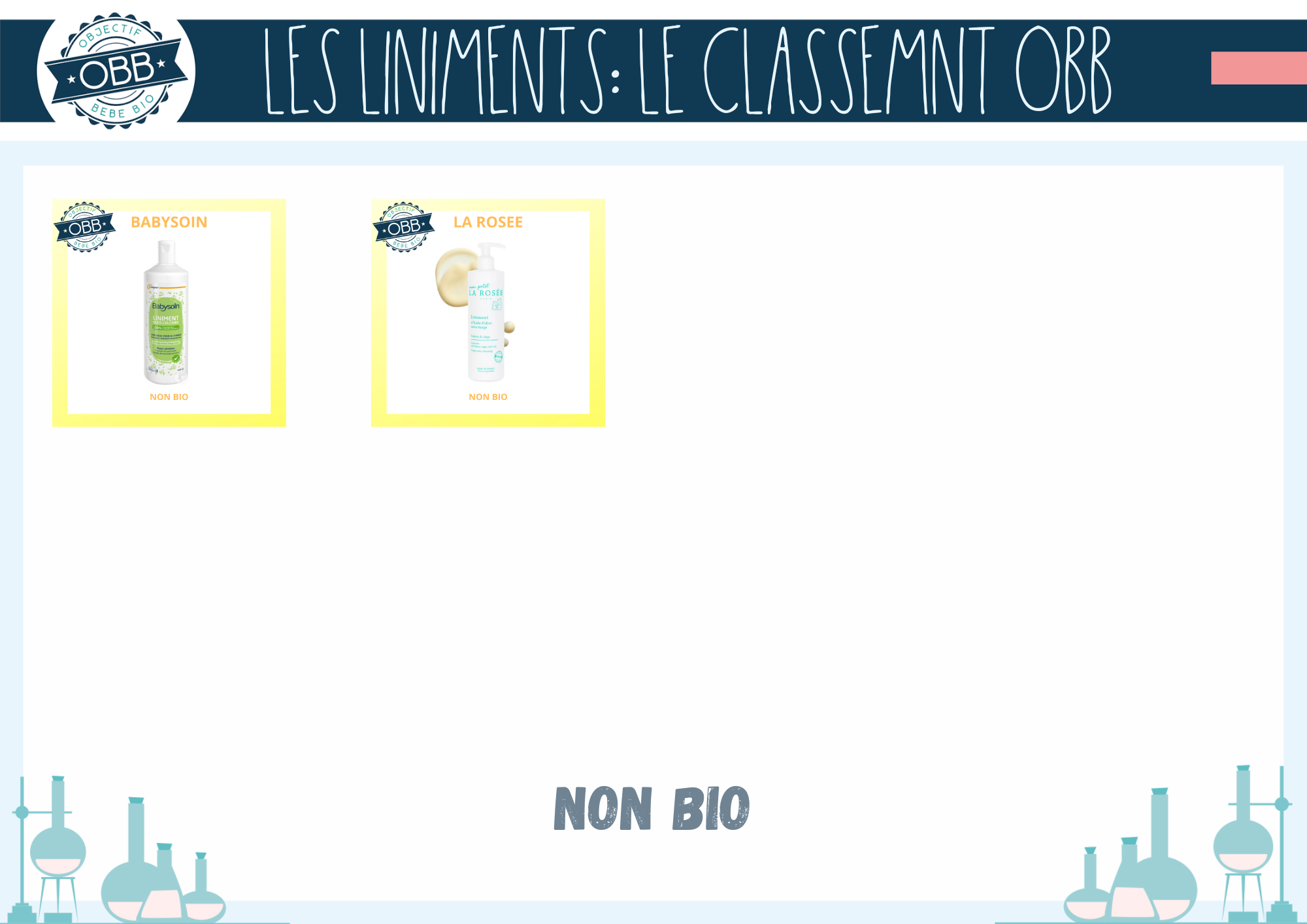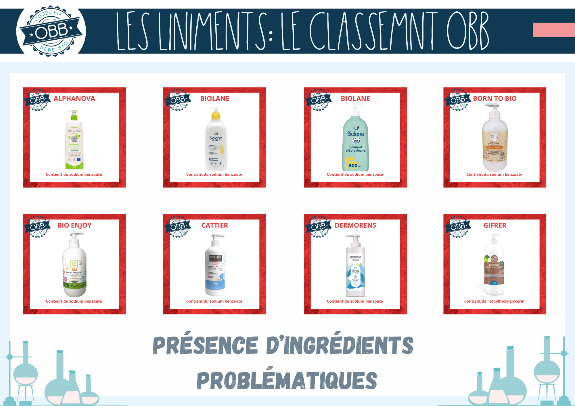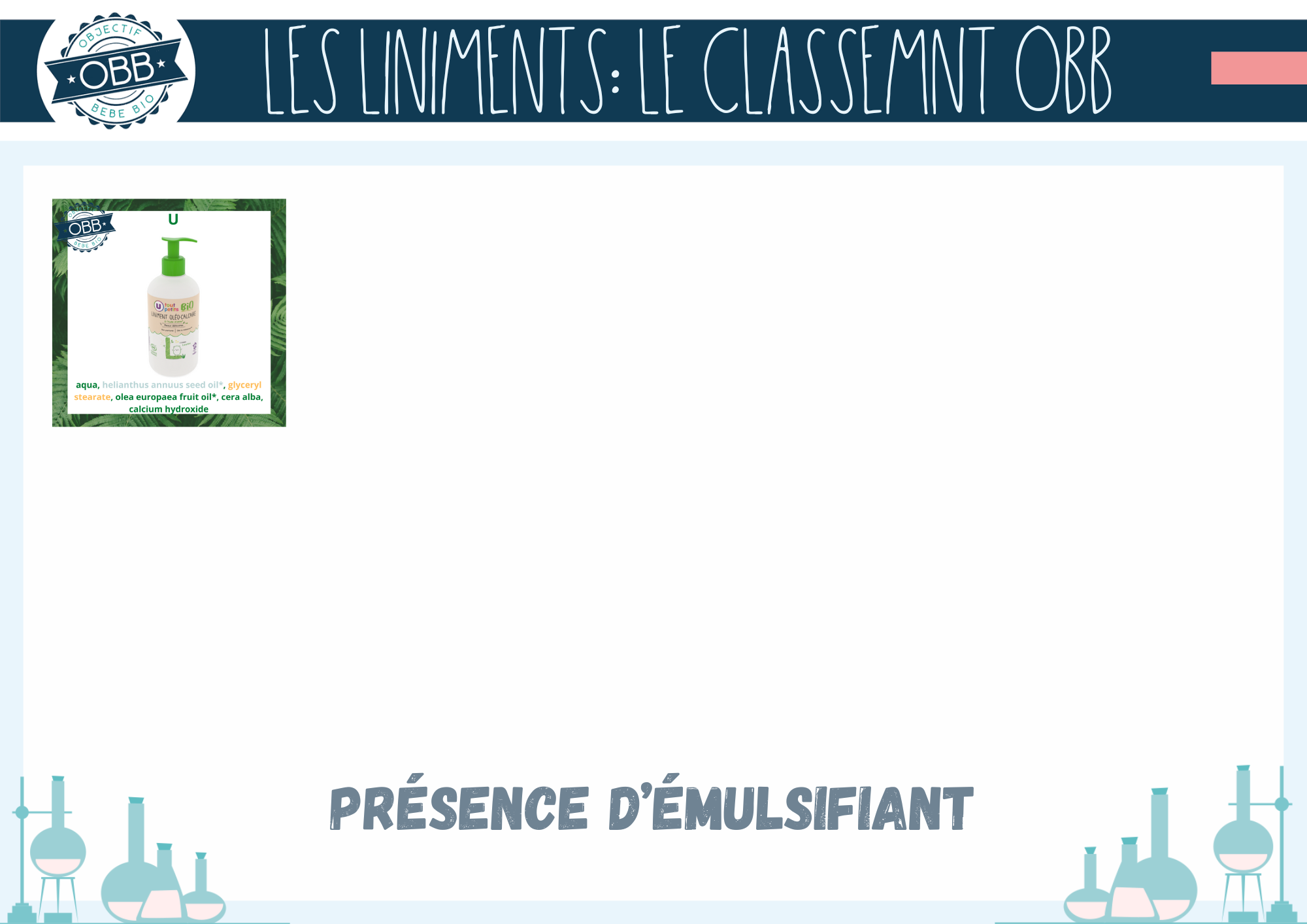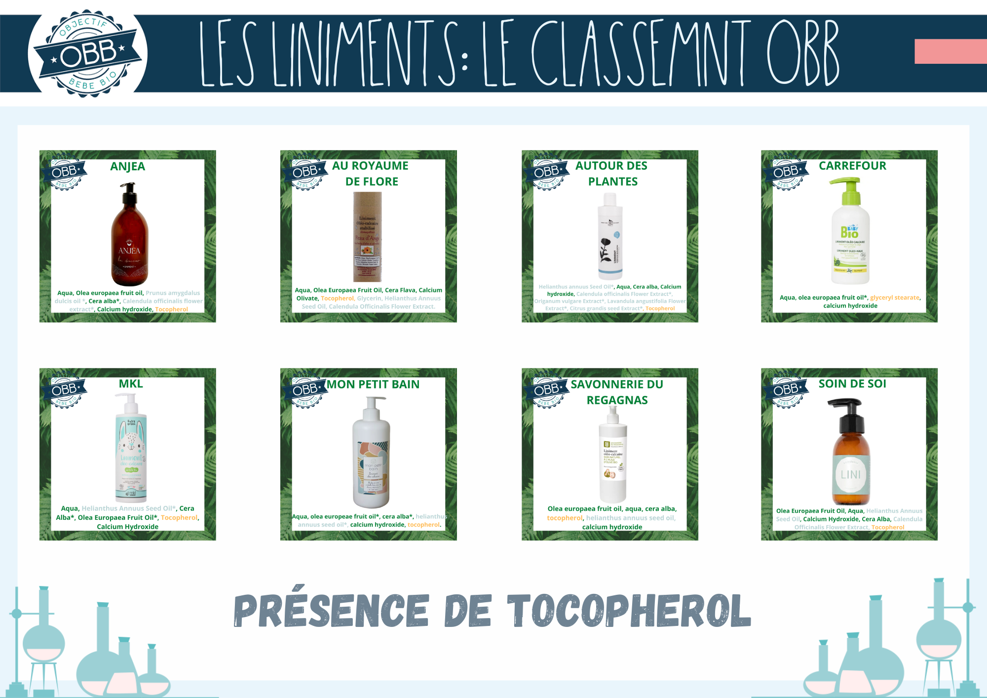 Pour les trois premières catégories, nous avons ajouté la composition INCI de chaque liniment sur les vignettes. Ce choix vous permet de mieux visualiser la présence d’ingrédients supplémentaires. En jaune les conservateurs et émulsifiants. Bien que ces ingrédients de soient pas problématiques pour votre bébé ils ne sont pas indispensables. En bleu gris il s’agit des autres extrait de végétaux, en dehors de l’huile d’olive comme par exemple l’huile de tournesol ou le macérat de calendula.