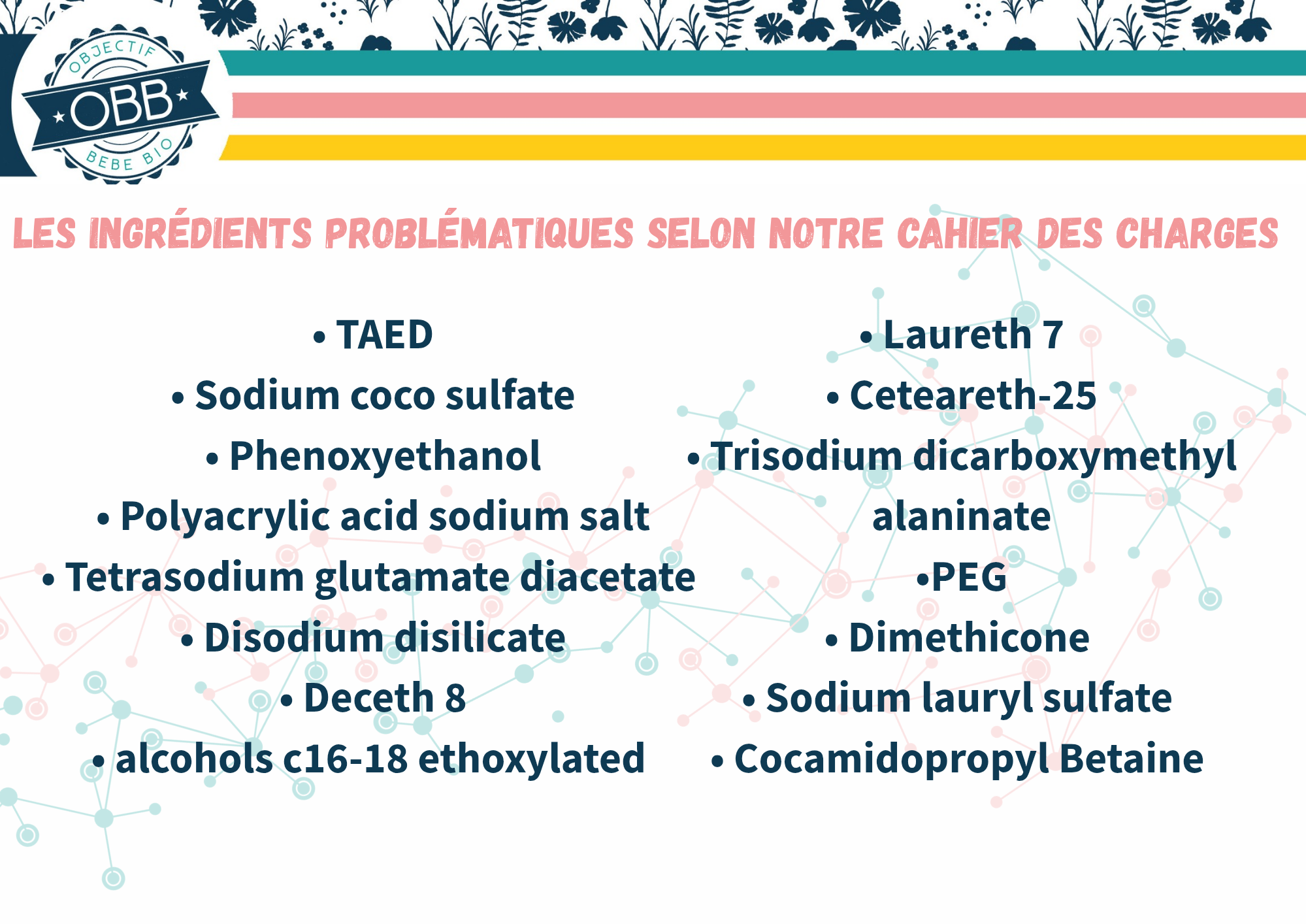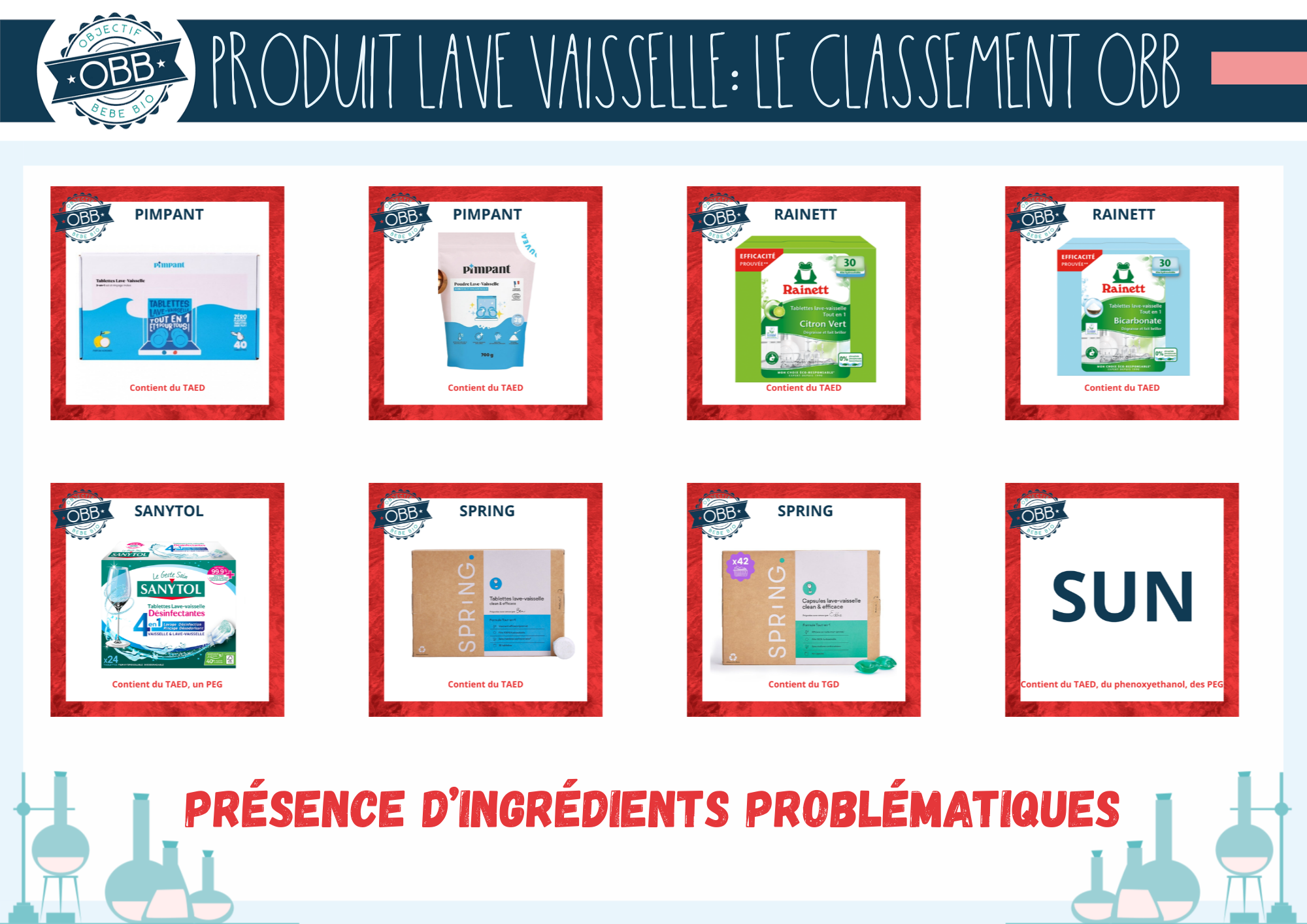 Voici la liste des molécules qui ne répondent pas à notre cahier des charges, que nous avons pu trouver dans ce type de produit. Cette liste peut être amené à évoluer si d’autres produits sont rajoutés au classement ou si par exemple de nouvelles études sont publiées.
