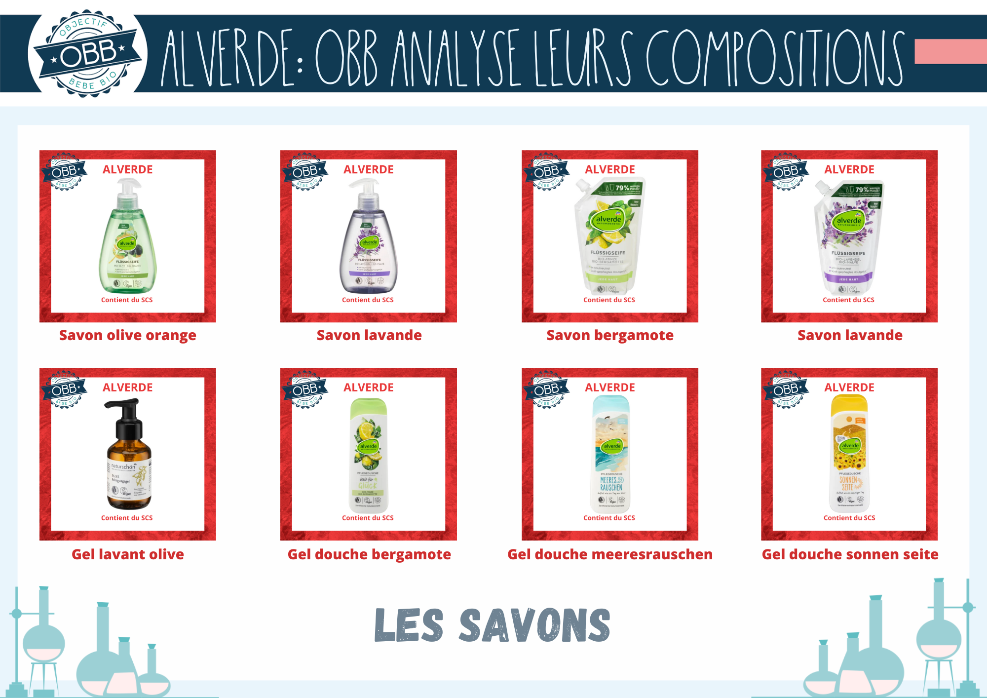 On commence par les différents savons conçus par Alverde. Vous trouverez des savons solides, des crèmes de douche, des savons liquides ou encore des gels douche. La plupart des références contiennent un tensioactif irritant: le sodium coco sulfate.
