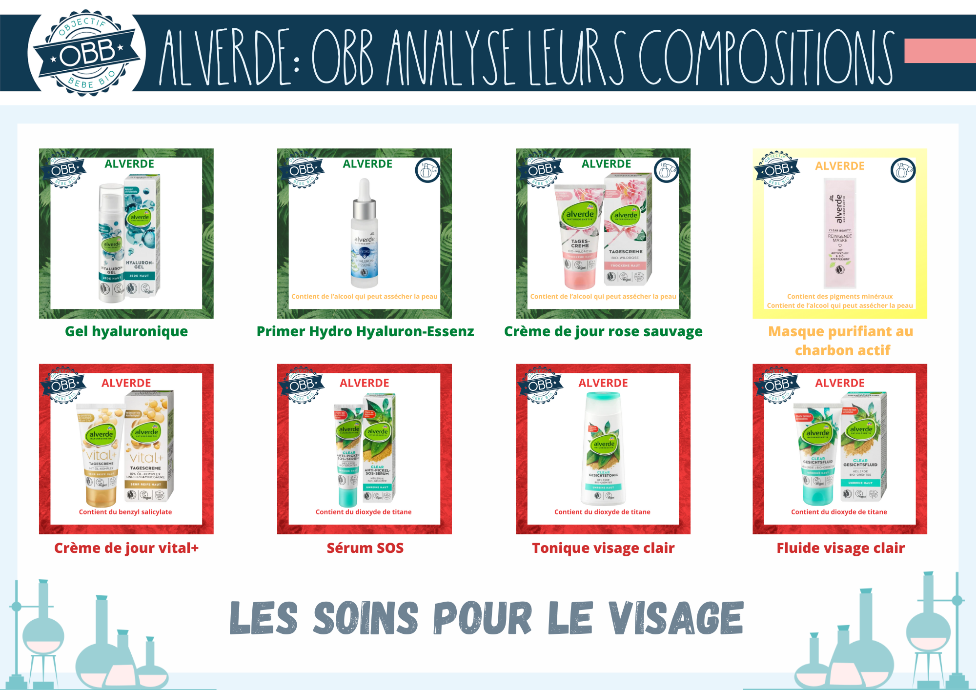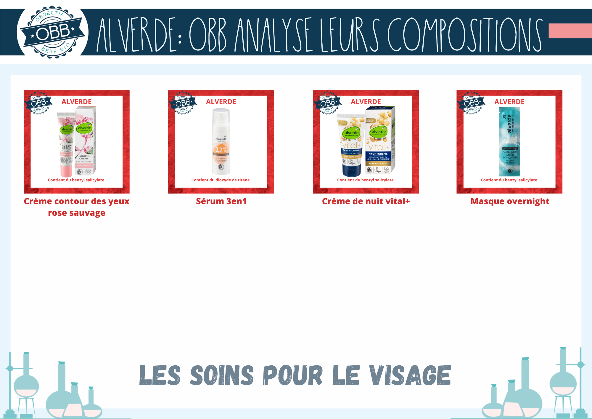 Avec plus de 40 références de soins pour le visage, cette gamme représente 10% des produits Alverde. Vous y trouverez des crèmes de jour, des crèmes de nuit, des sérums, des crèmes contour des yeux ou des masques. Parmi les références qui contiennent des ingrédients problématiques on retrouve une nouvelle fois le benzyl salicylate, mais aussi du dioxyde de titane. Le CIRC le classe comme cancérigène possible par inhalation, donc nous vous conseillons d’éviter les cosmétiques qui en contiennent.