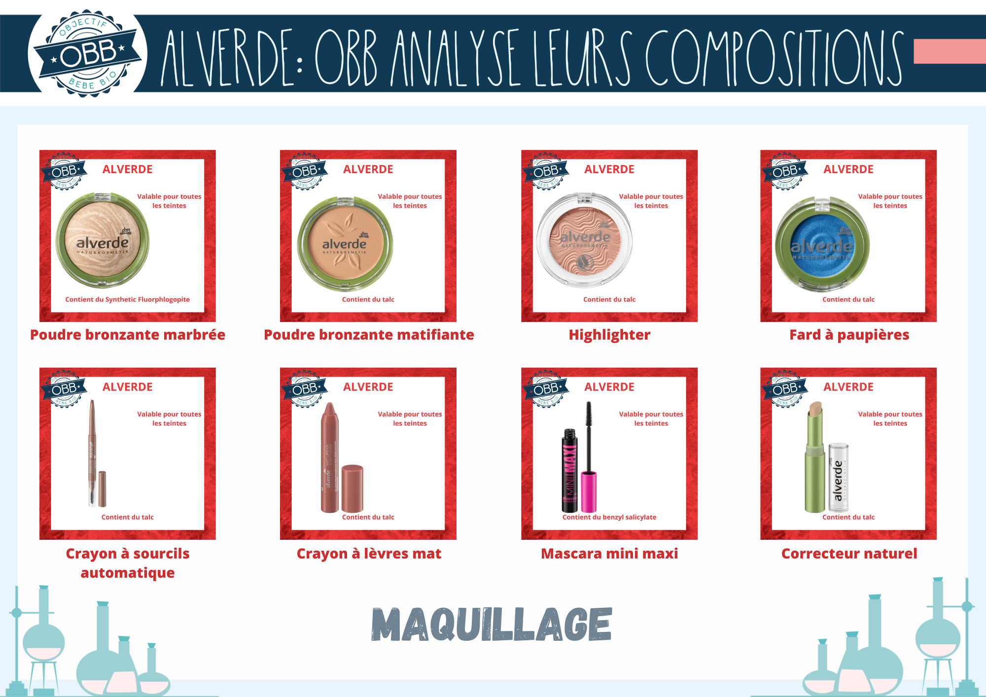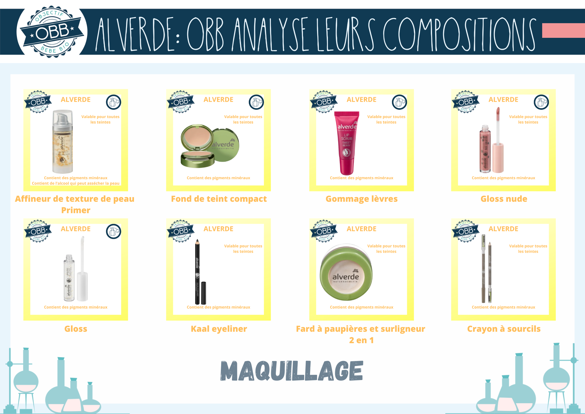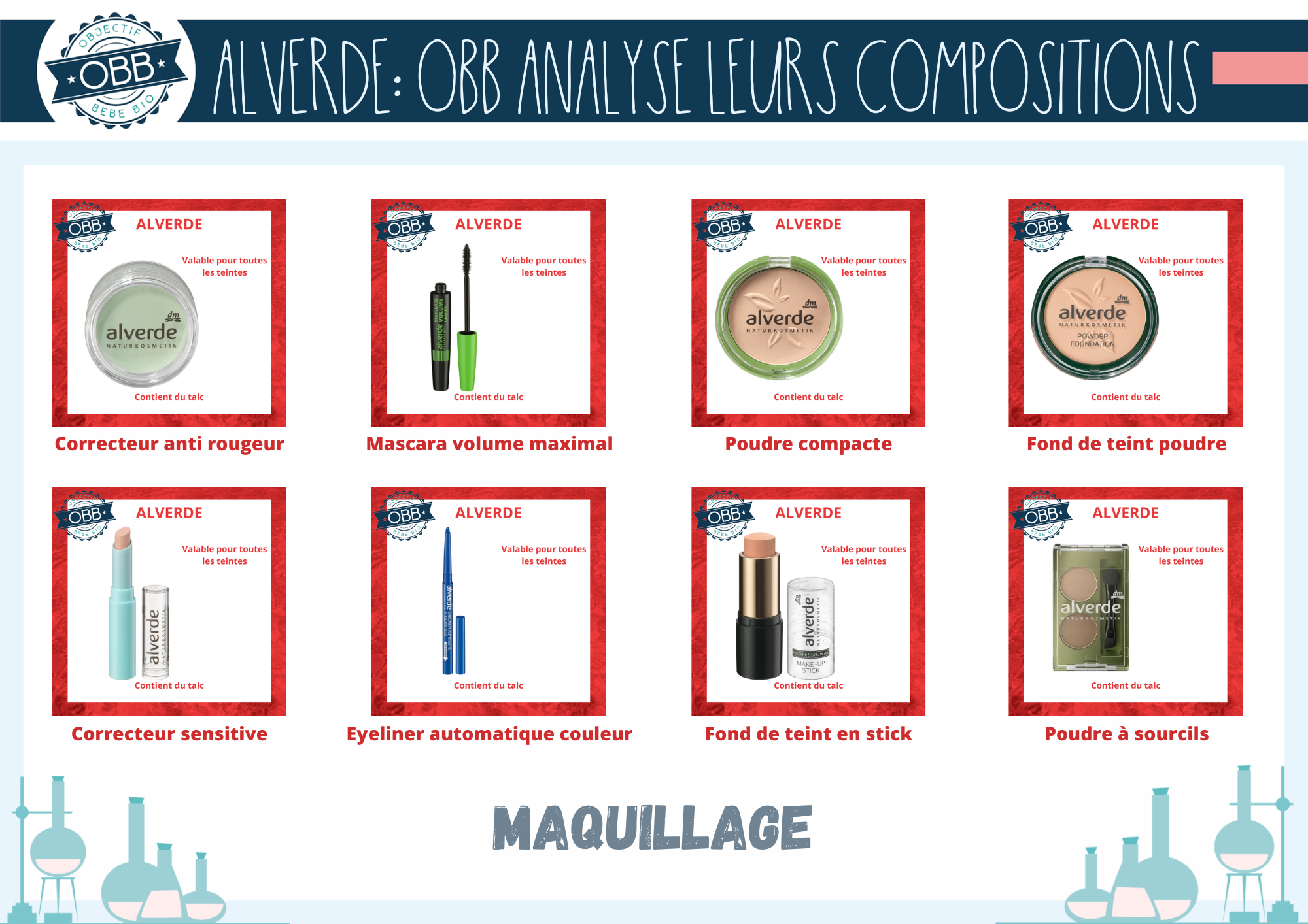 Il s’agit de la catégorie de produits la plus vaste de la marque. Si vous nous suivez, vous savez surement qu’il n’existe pas de maquillage sans ingrédient problématique. En effet, on y retrouve du dioxyde de titane qui sert à obtenir une base blanche qui sera plus facile à teinter après. Comme nous l’avons dit plus haut cet ingrédient est un cancérigène suspecté. Si vous souhaitez utiliser du maquillage nous vous conseillons de favoriser les formats non poudreux pour éviter les particules volatiles.