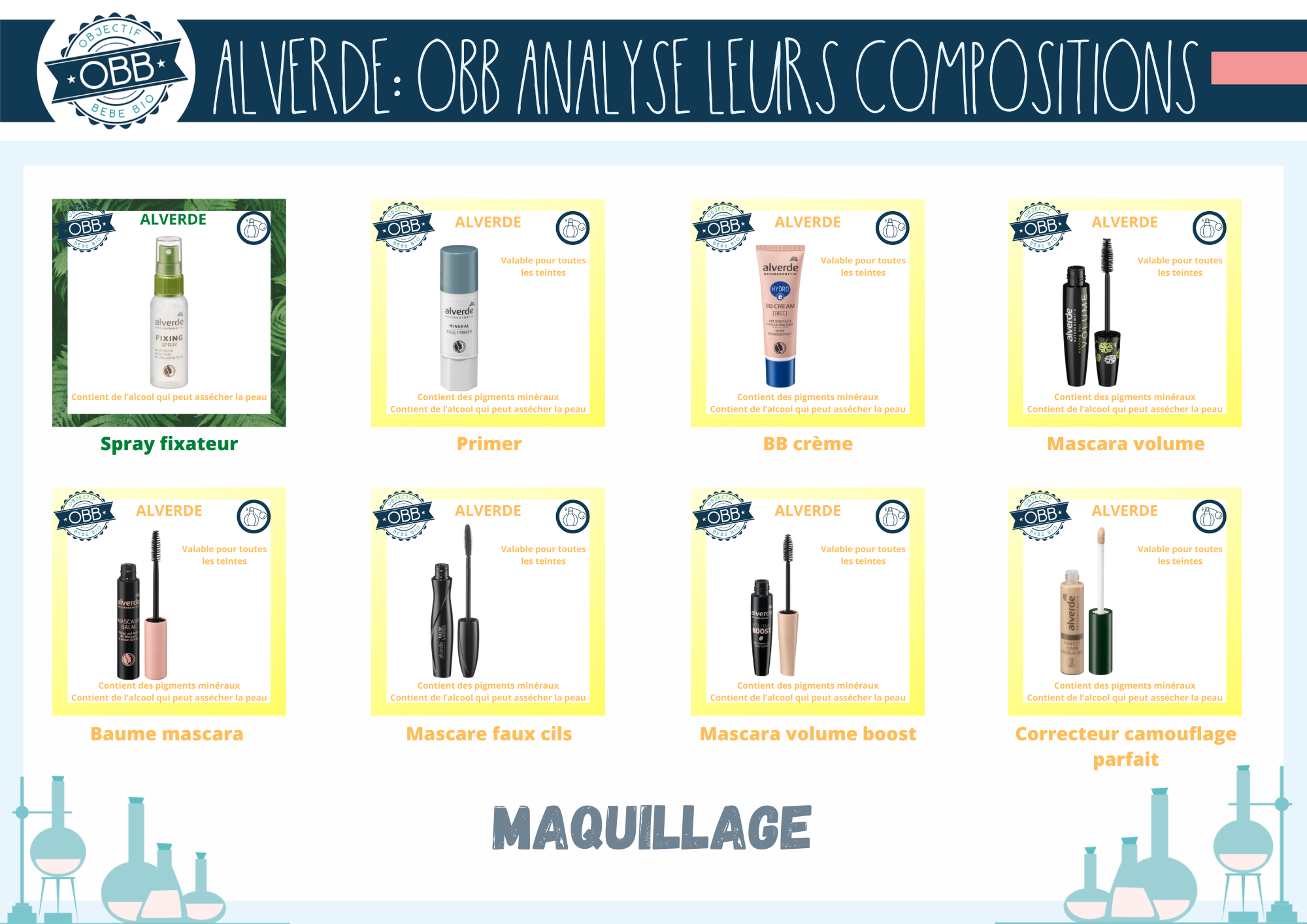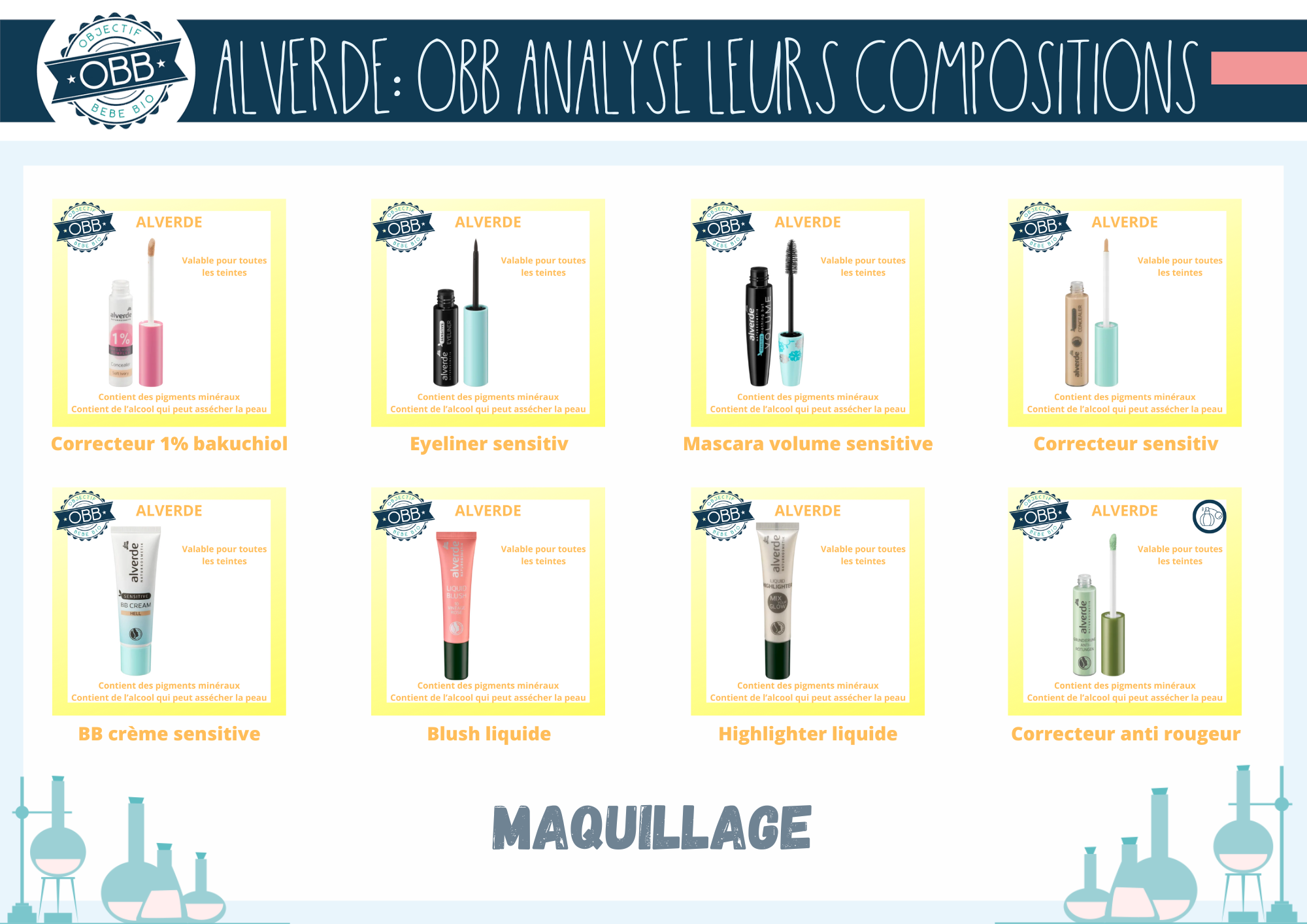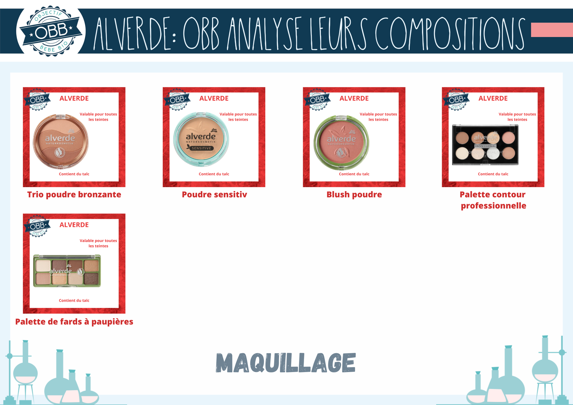 Il s’agit de la catégorie de produits la plus vaste de la marque. Si vous nous suivez, vous savez surement qu’il n’existe pas de maquillage sans ingrédient problématique. En effet, on y retrouve du dioxyde de titane qui sert à obtenir une base blanche qui sera plus facile à teinter après. Comme nous l’avons dit plus haut cet ingrédient est un cancérigène suspecté. Si vous souhaitez utiliser du maquillage nous vous conseillons de favoriser les formats non poudreux pour éviter les particules volatiles.