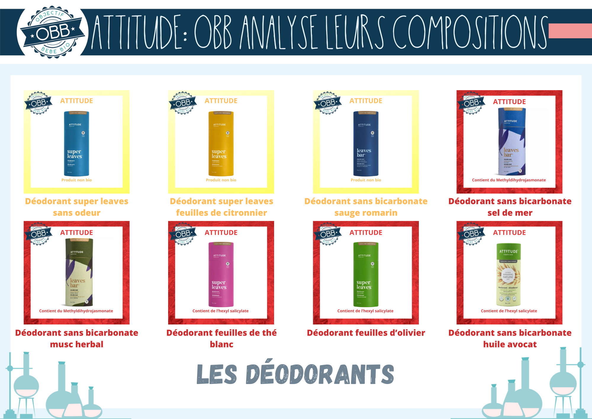 Attitude propose une large gamme de déodorants en stick, avec ou sans bicarbonate. Cet ingrédient n’est pas problématique mais selon votre sensibilité il se peut que sous ne supportiez pas le bicarbonate, surtout si vous avez une peau sensibilisée par le rasage. Dans certaines références on retrouve les deux agents parfumants que nous avons déjà mentionnés plus haut: l’hexyl salicylate et le methyldihydrojasmonate.