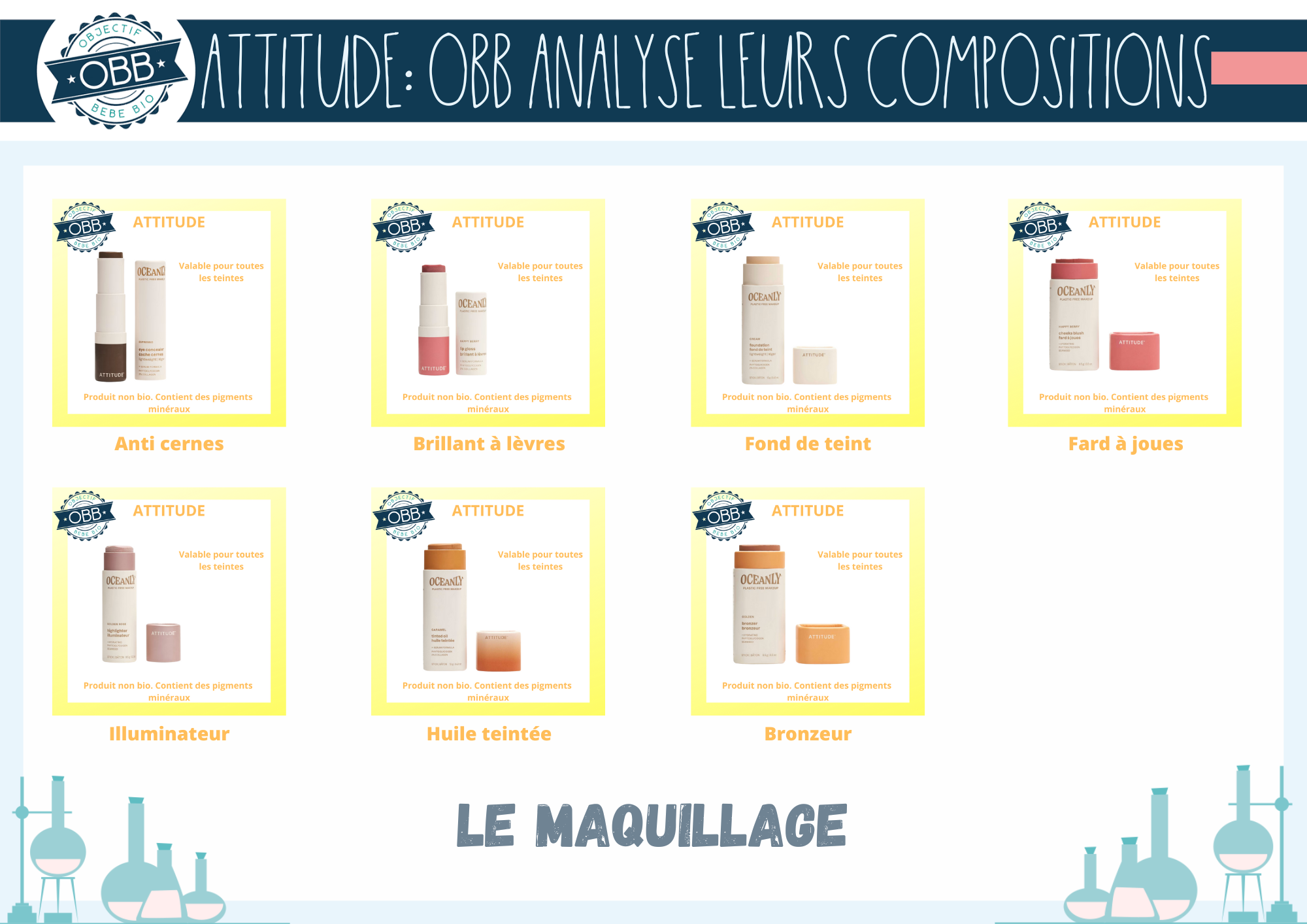 Attitude a également développé des stick de maquillage. Ils contiennent tous, des pigments minéraux comme le dioxyde de titane. Cet ingrédient est quasiment inévitable dans les produits de maquillage, car il permet d’obtenir une base blanche pour ensuite teinter le produit.