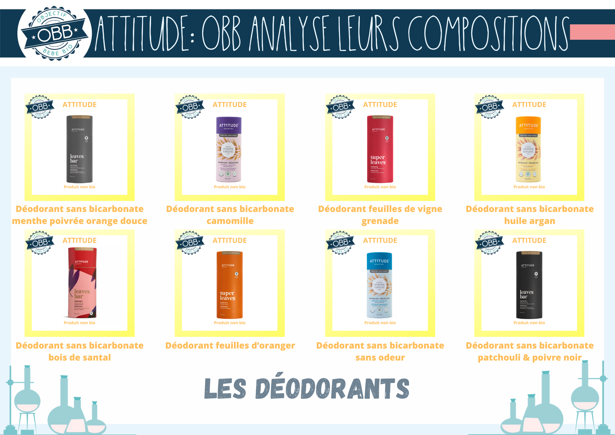 Attitude propose une large gamme de déodorants en stick, avec ou sans bicarbonate. Cet ingrédient n’est pas problématique mais selon votre sensibilité il se peut que sous ne supportiez pas le bicarbonate, surtout si vous avez une peau sensibilisée par le rasage. Dans certaines références on retrouve les deux agents parfumants que nous avons déjà mentionnés plus haut: l’hexyl salicylate et le methyldihydrojasmonate.
