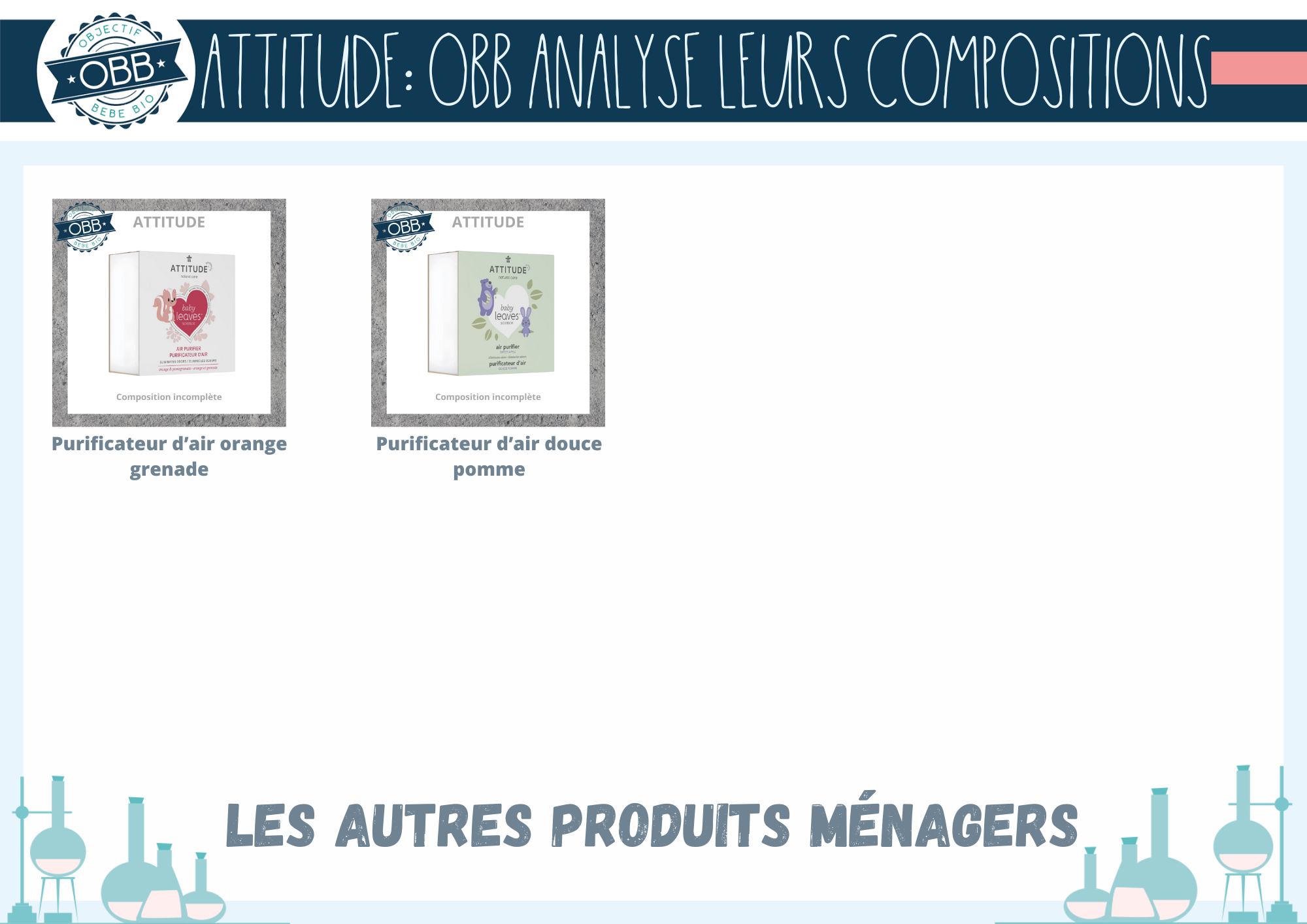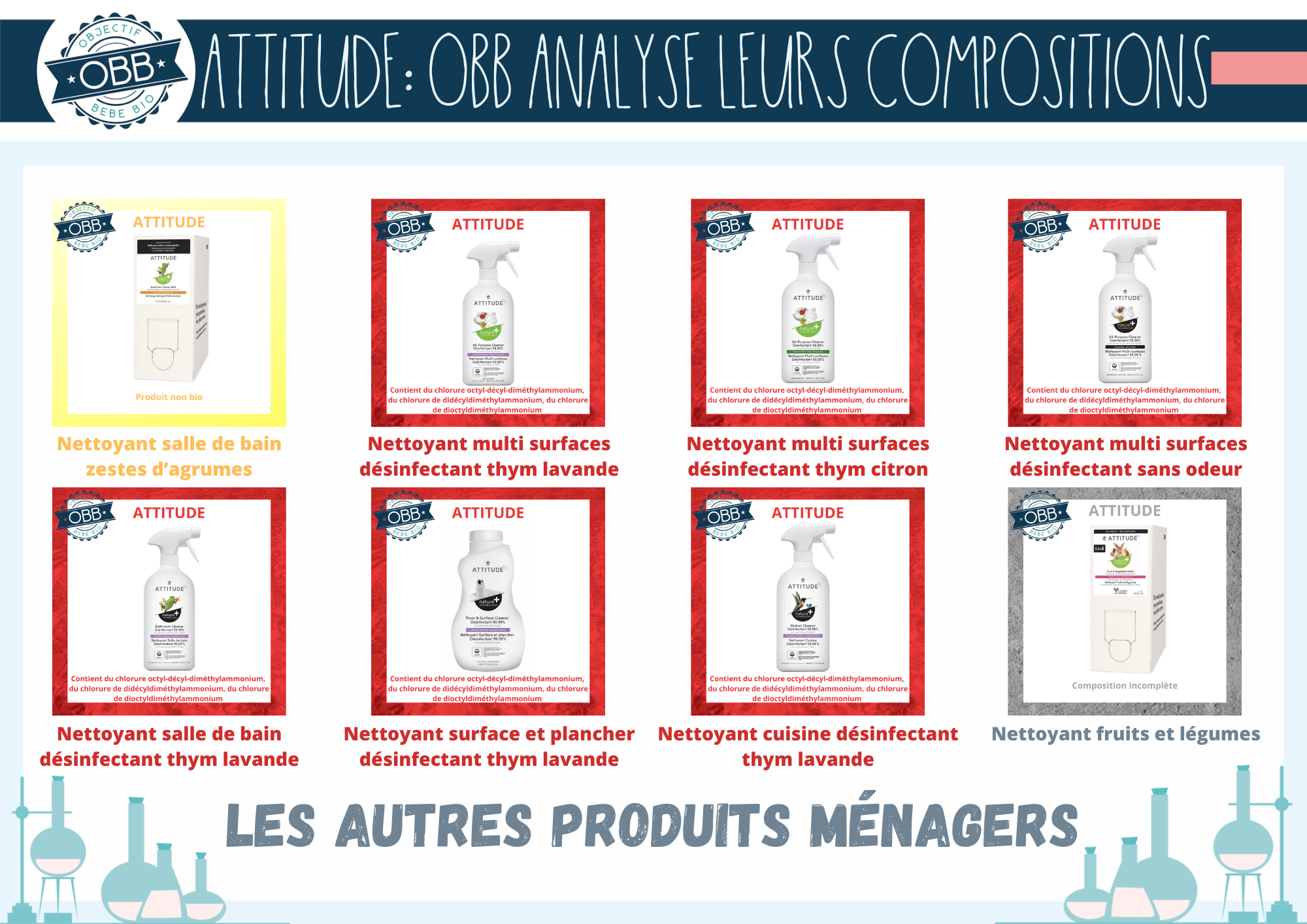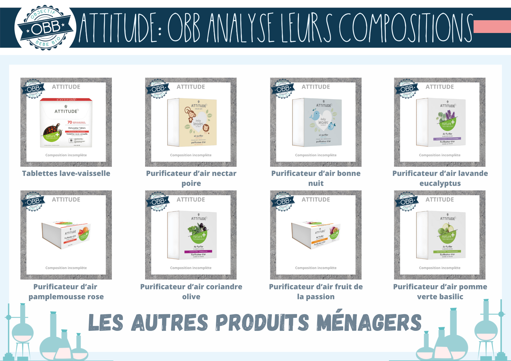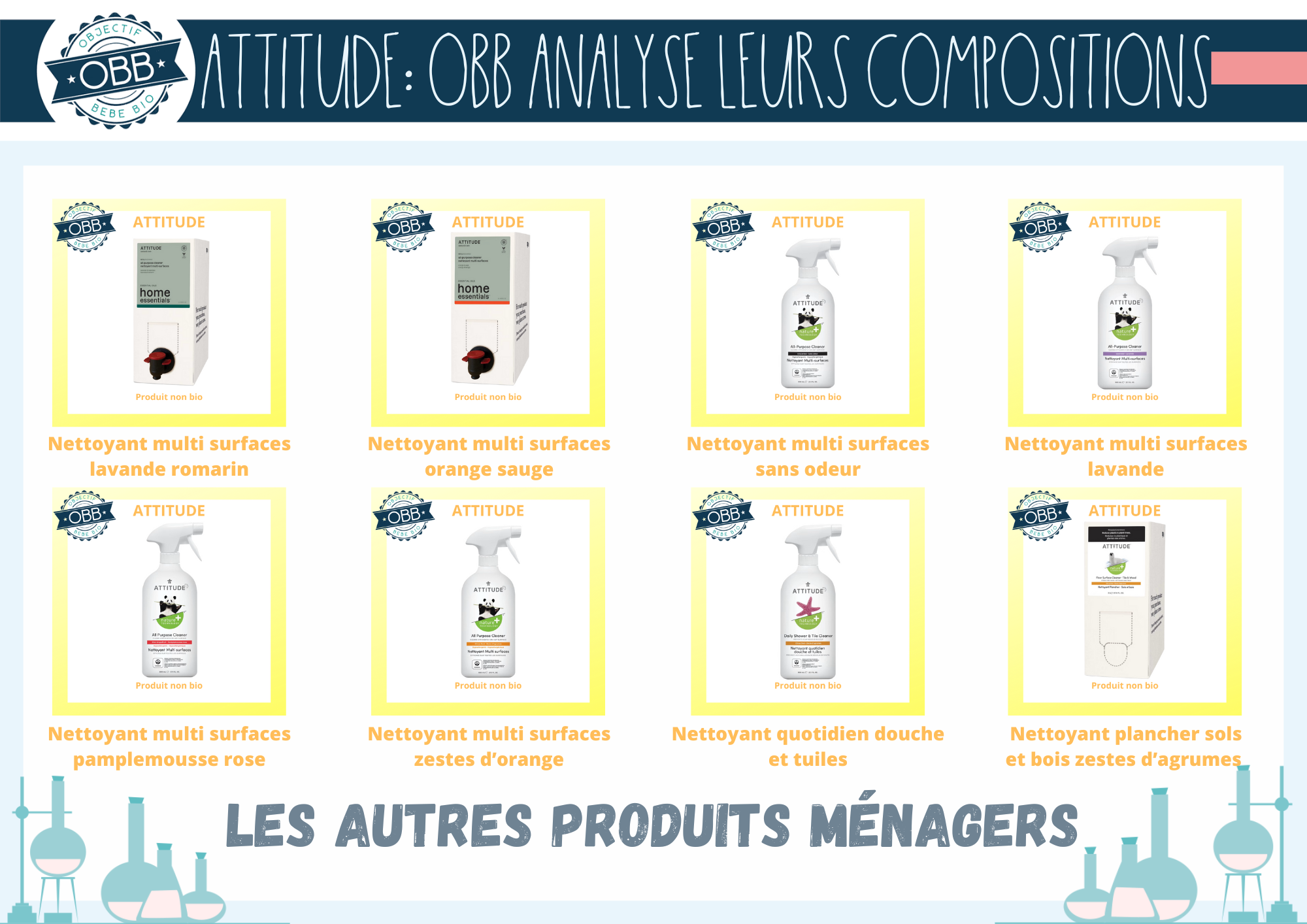 En plus des lessives, adoucissants et liquides vaisselles, Attitude propose de nombreux autres produits ménagers. C’est d’ailleurs l’essence même de la marque. Vous y trouverez des nettoyants multi-surfaces, des détachants, des sprays pour les vitres, des purificateurs d’air etc. Nous vous conseillons de plutôt vous tourner vers des références biologiques.
