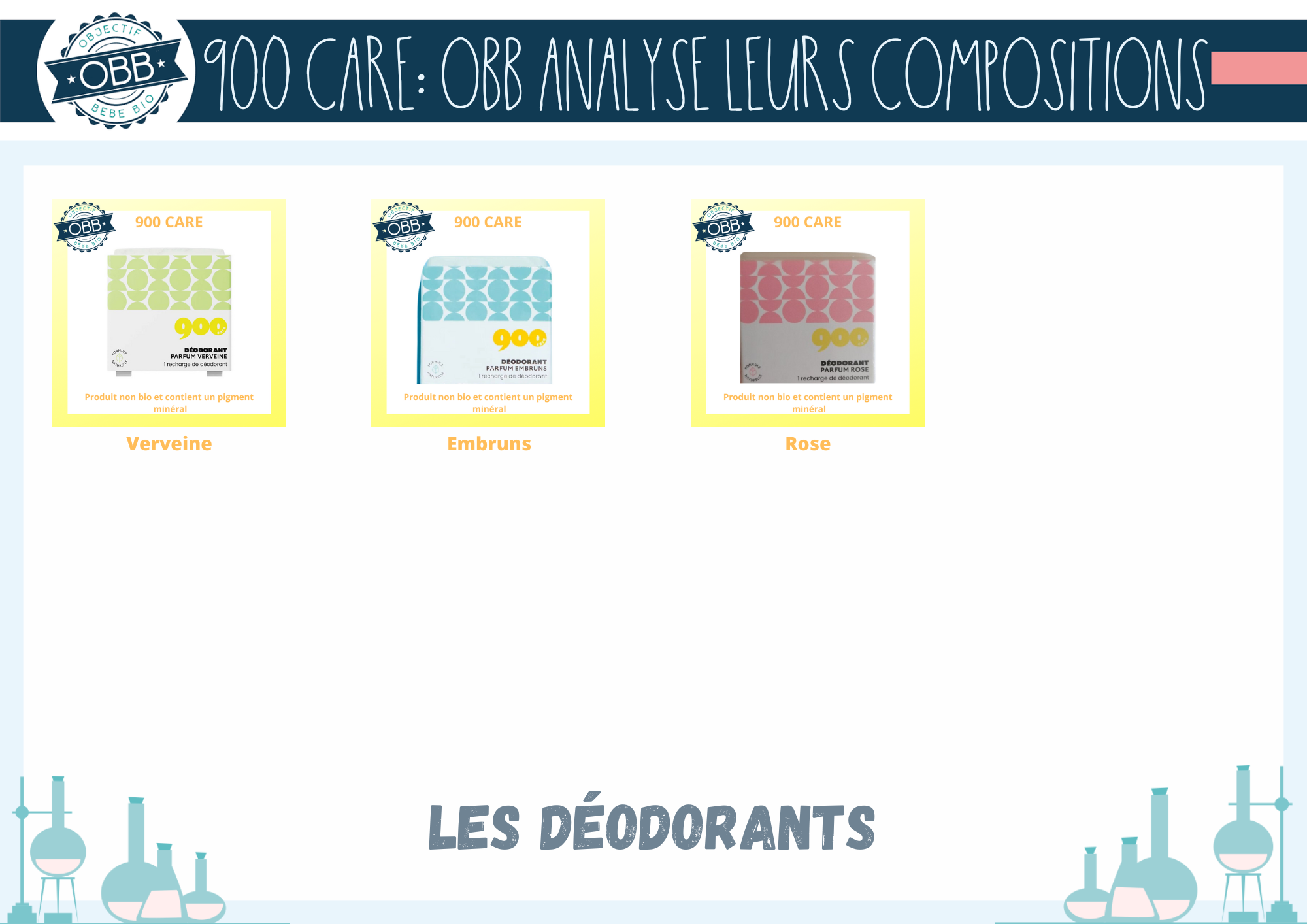 900 care propose également une gamme de soin, dont des déodorants. Ces derniers ne sont pas biologiques et contiennent des pigments minéraux. Ces derniers sont là seulement pour colorer les produits, ce qui est loin d’être indispensable pour un déo…
