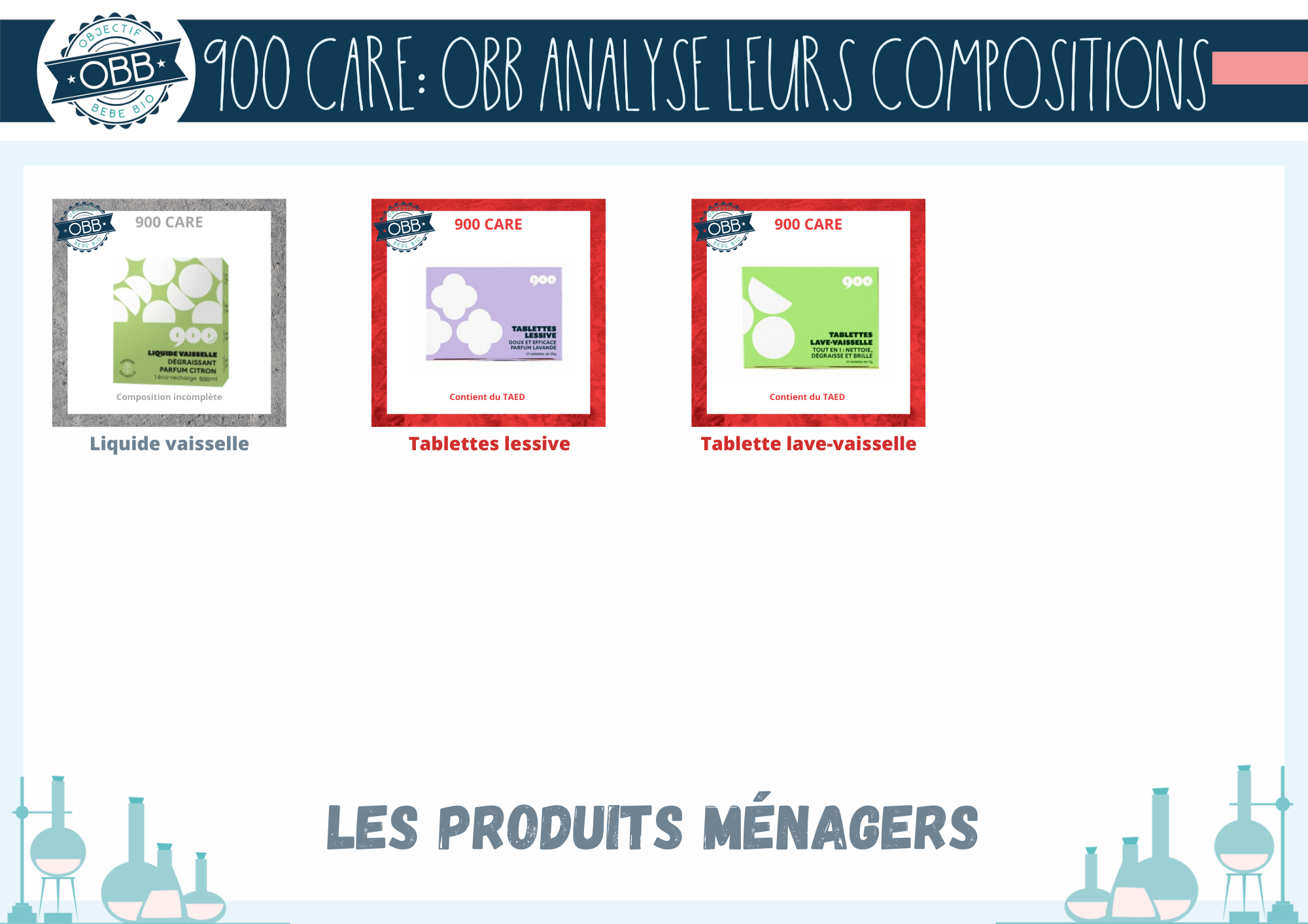 On termine par les produits ménagers qui sont venus agrandir la famille des produits 900 care. La marque n’indique pas la composition du liquide vaisselle donc nous ne pouvons pas vous en dire plus. Les compositions des tablettes sont incomplètes mais la marque affiche quelques informations dont la présence de TAED.