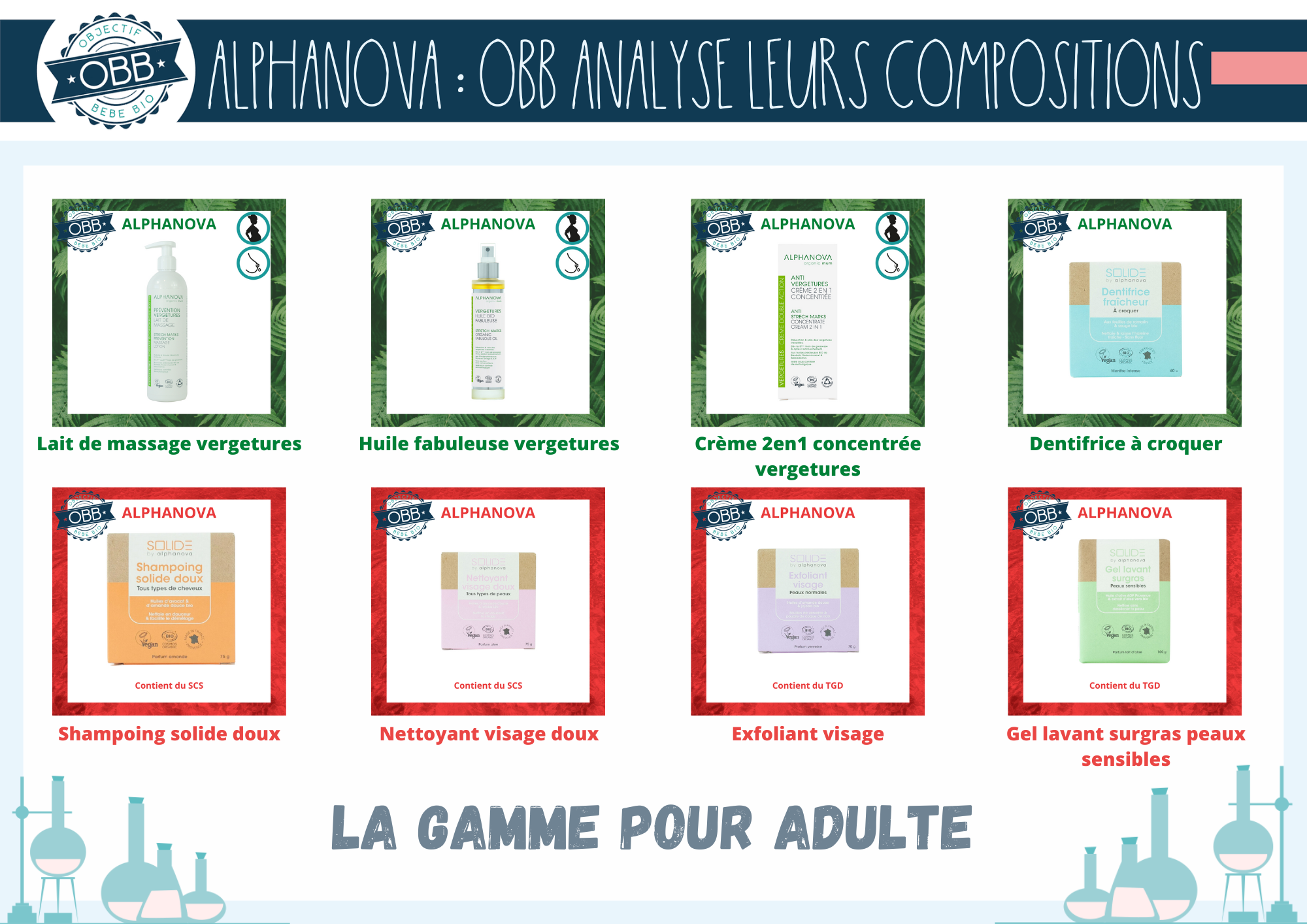Depuis peu, Alphanova a développé une gamme de produits solides afin de répondre à la recherche de produits zéro déchet de ces clients. Cependant mis à part le dentifrice on retrouve dans les compositions du SCS ou du TGD. La marque propose aussi des produits pour lutter contre l’apparition des vergetures, ils sont compatibles avec la grossesse et l’allaitement. Concernant l’allaitement vous pouvez trouver des alternatives à la lanoline dans les albums de notre groupe Facebook.