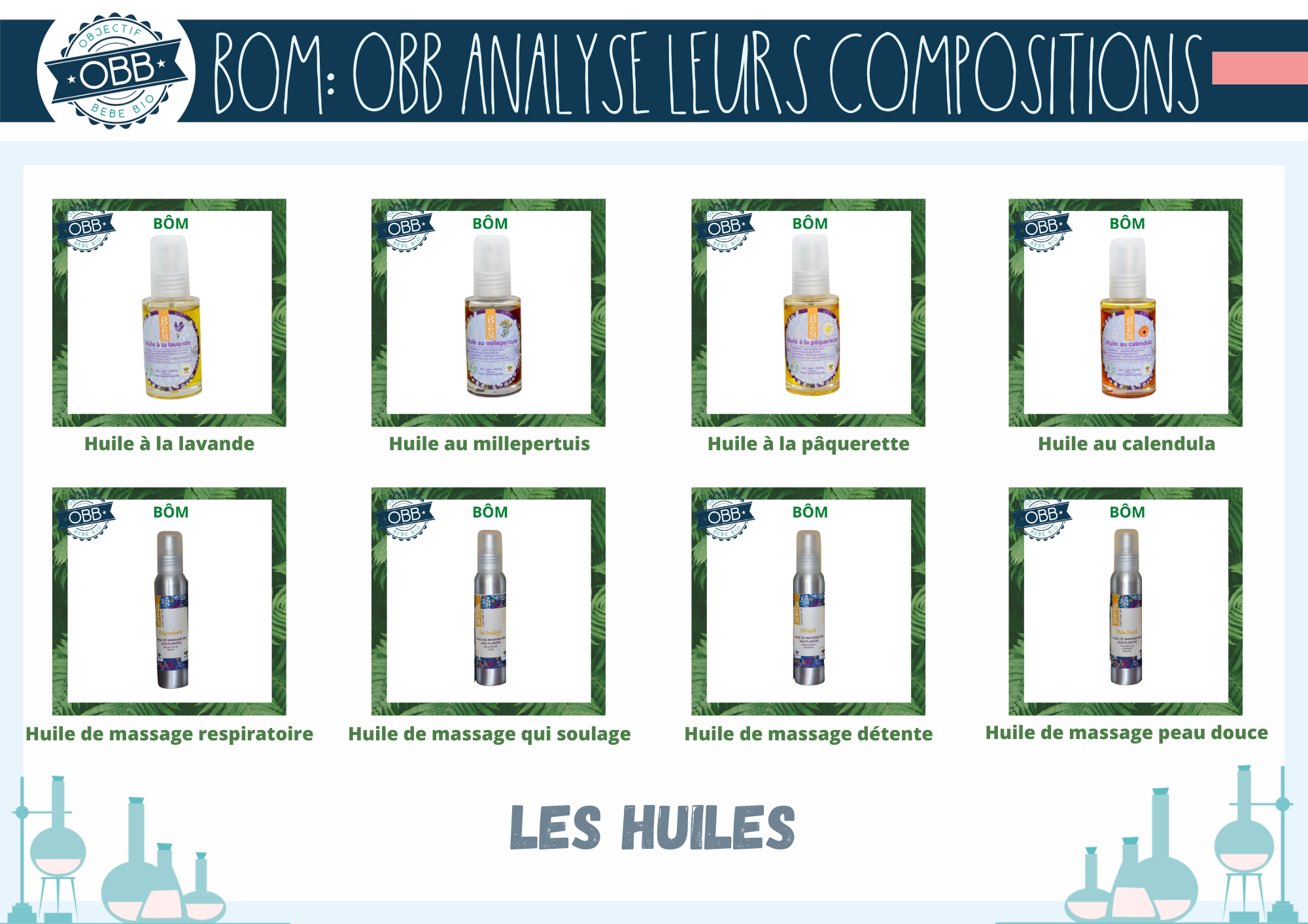 Bôm propose des huiles « brutes » et des huiles de massages. Elles sont issues de la macération solaires dans plantes cultivées par France, dans de l’huile d’olive bio de 1ère pression à froid. C’est un excellent moyen écologique d’extraire les principes actifs d’une plante. Les flacons sont proposés avec un spray pour faciliter l’utilisation et l’application.