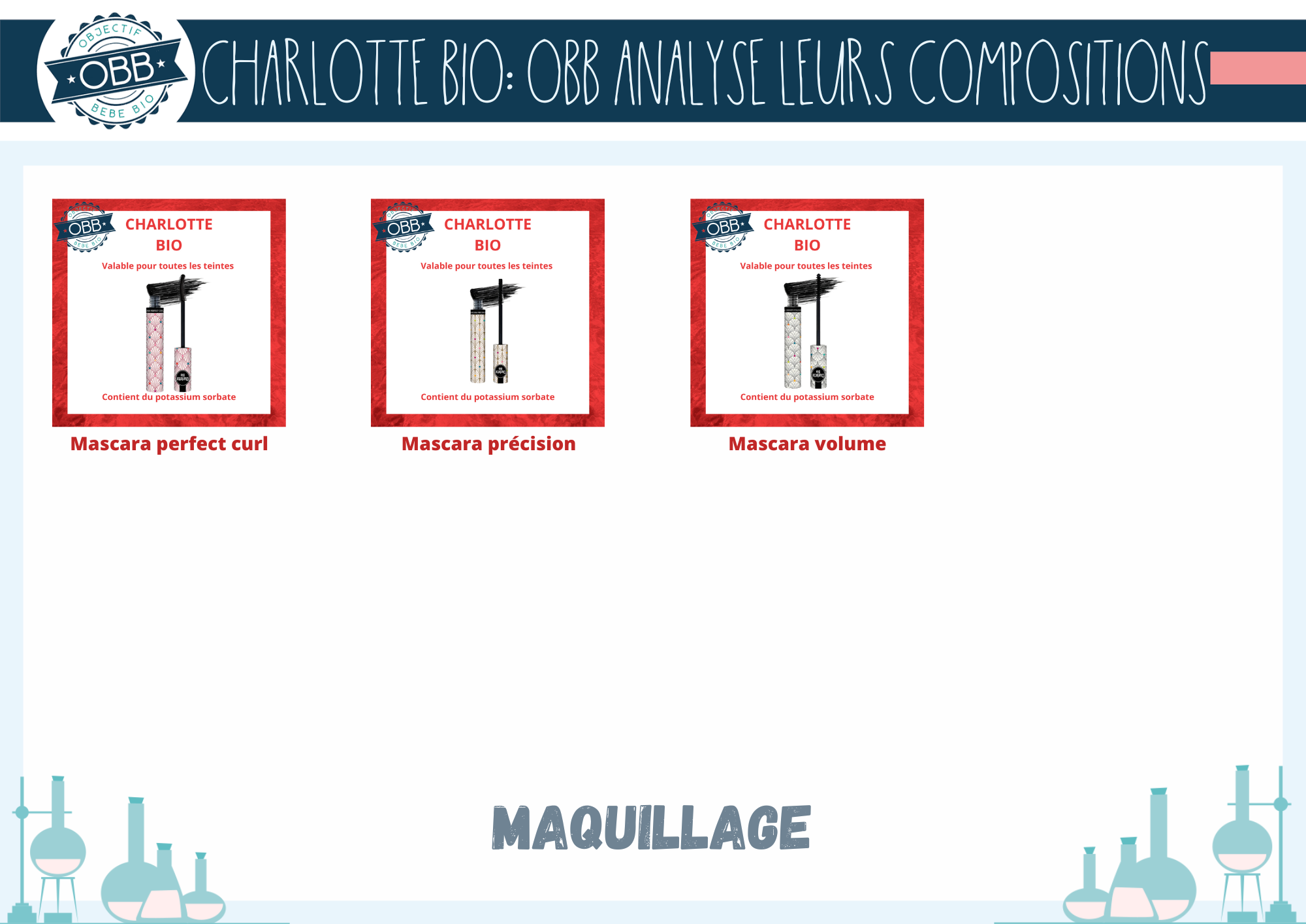 Les mascaras et les vernis Charlotte bio contiennent d’autres ingrédients problématiques comme le potassium sorbate qui est irritant pour les muqueuses. Les vernis eux contiennent par exemple de la nitrocellulose, du phosphoric acid.