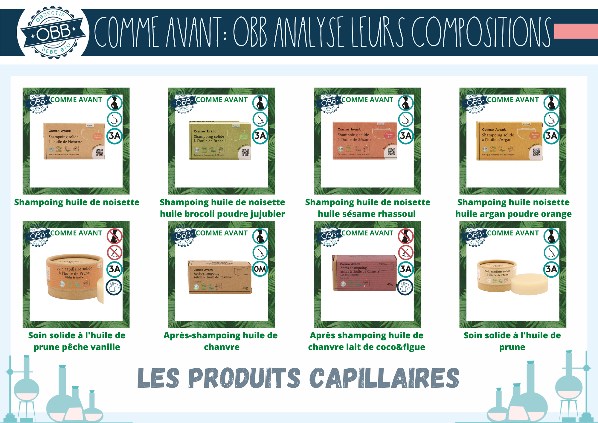 Vous cherchez des shampoings solides qui sont de bonne composition sans pourtant être issus d’une saponification à froid ? La marque comme avant, vous en propose 4 , tous compatible avec la grossesse et l’allaitement ! Ils contiennent un  tensioactifs doux: le Sodium Cocoyl Glutamate. Pour compléter, vous trouverez plusieurs soins capillaires.
