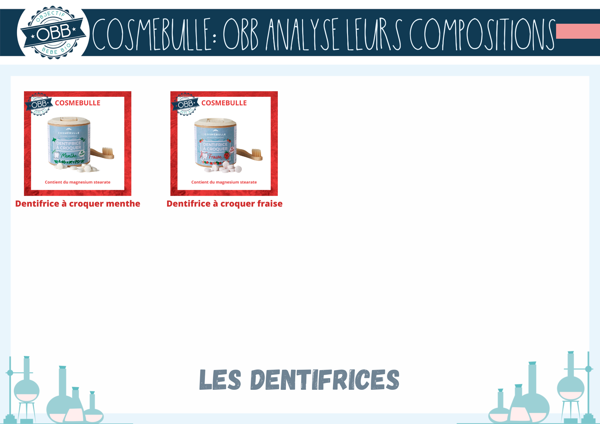 Pour conclure voici les deux dentifrices solides de la marque. Les deux contiennent du magnesium stearate qui est utilisé pour ses fonctions d’antiagglomérant, d’émulsifiant et d’épaississant. Cependant il est connu pour donner des troubles digestifs comme des diarrhées.