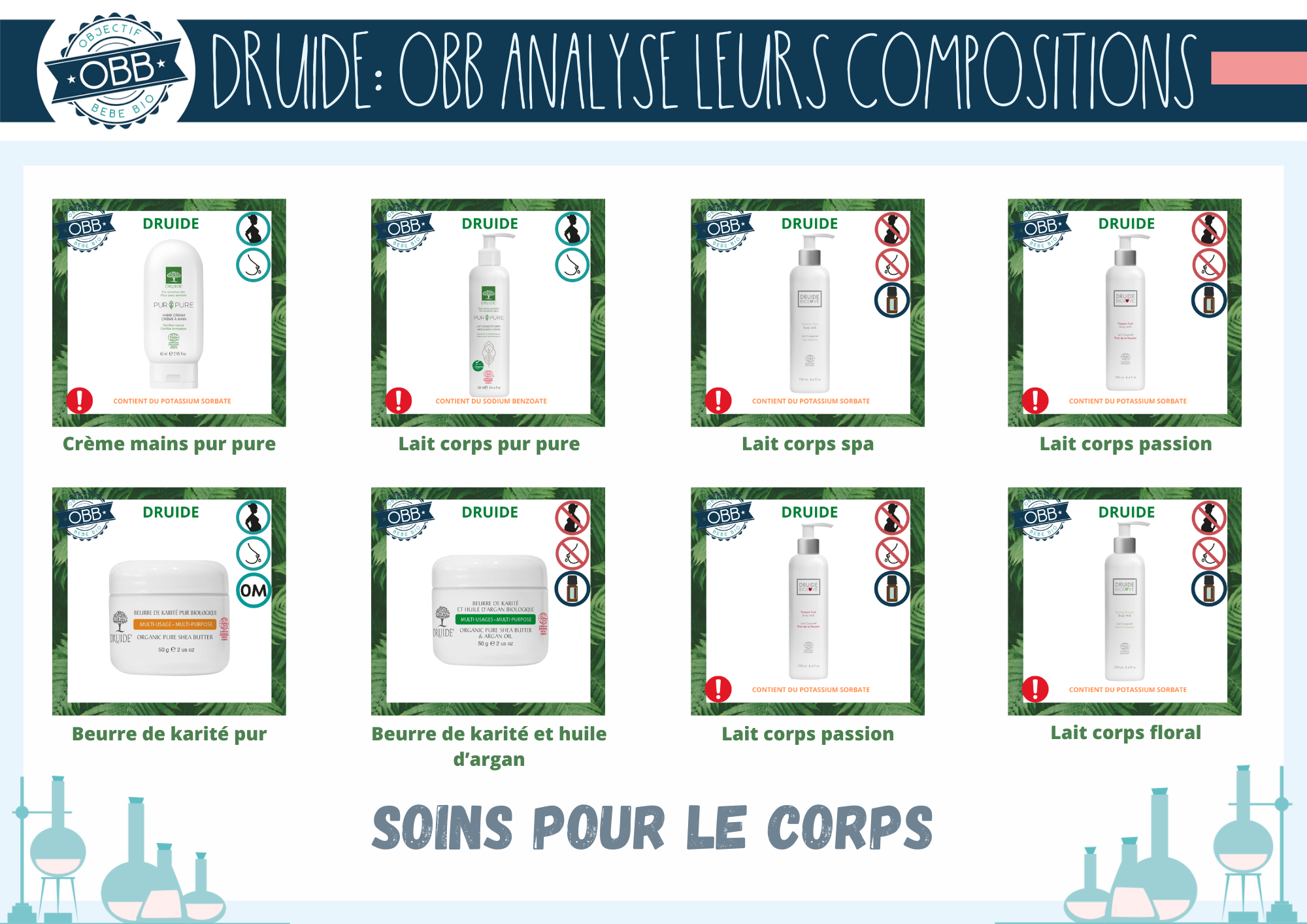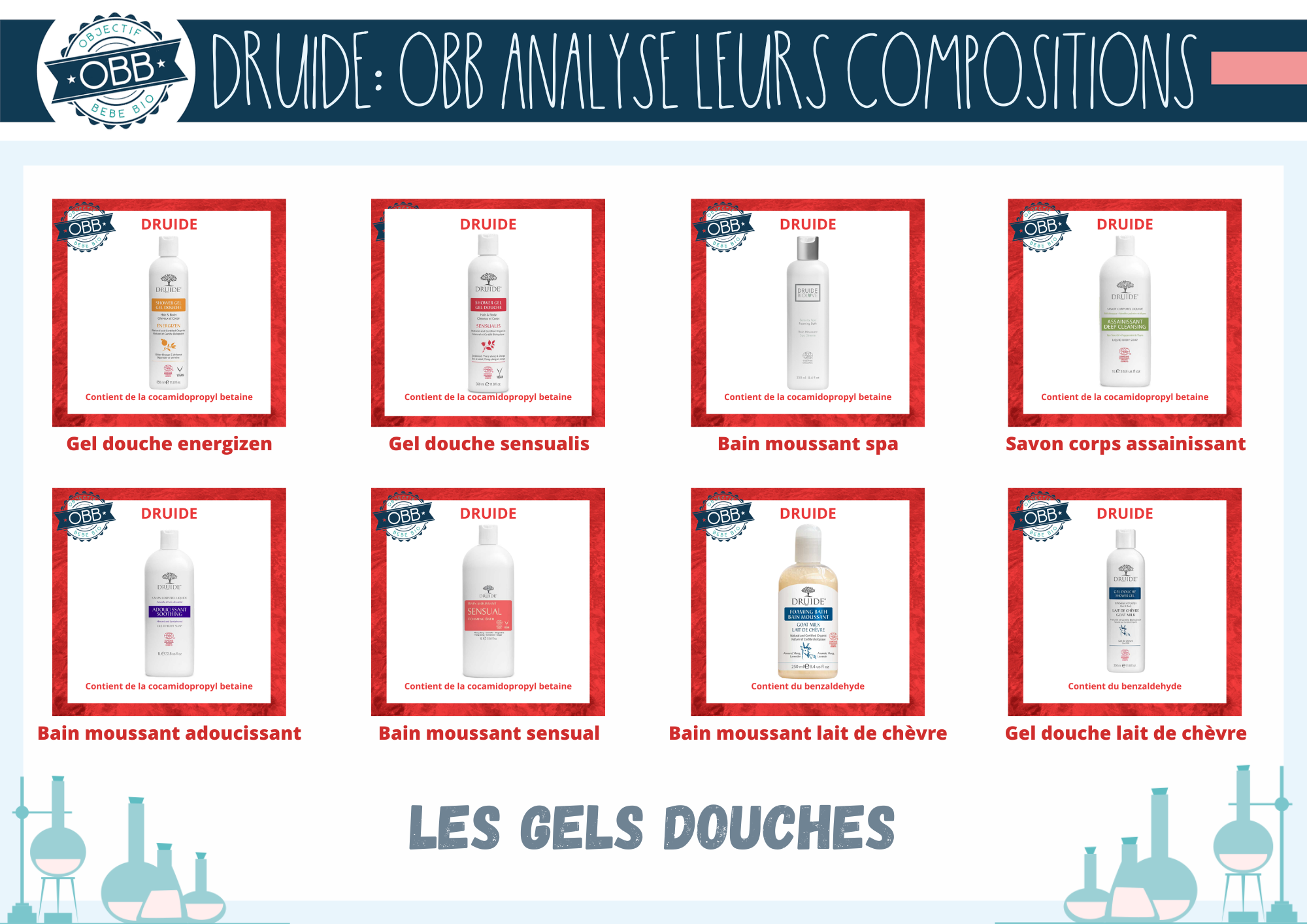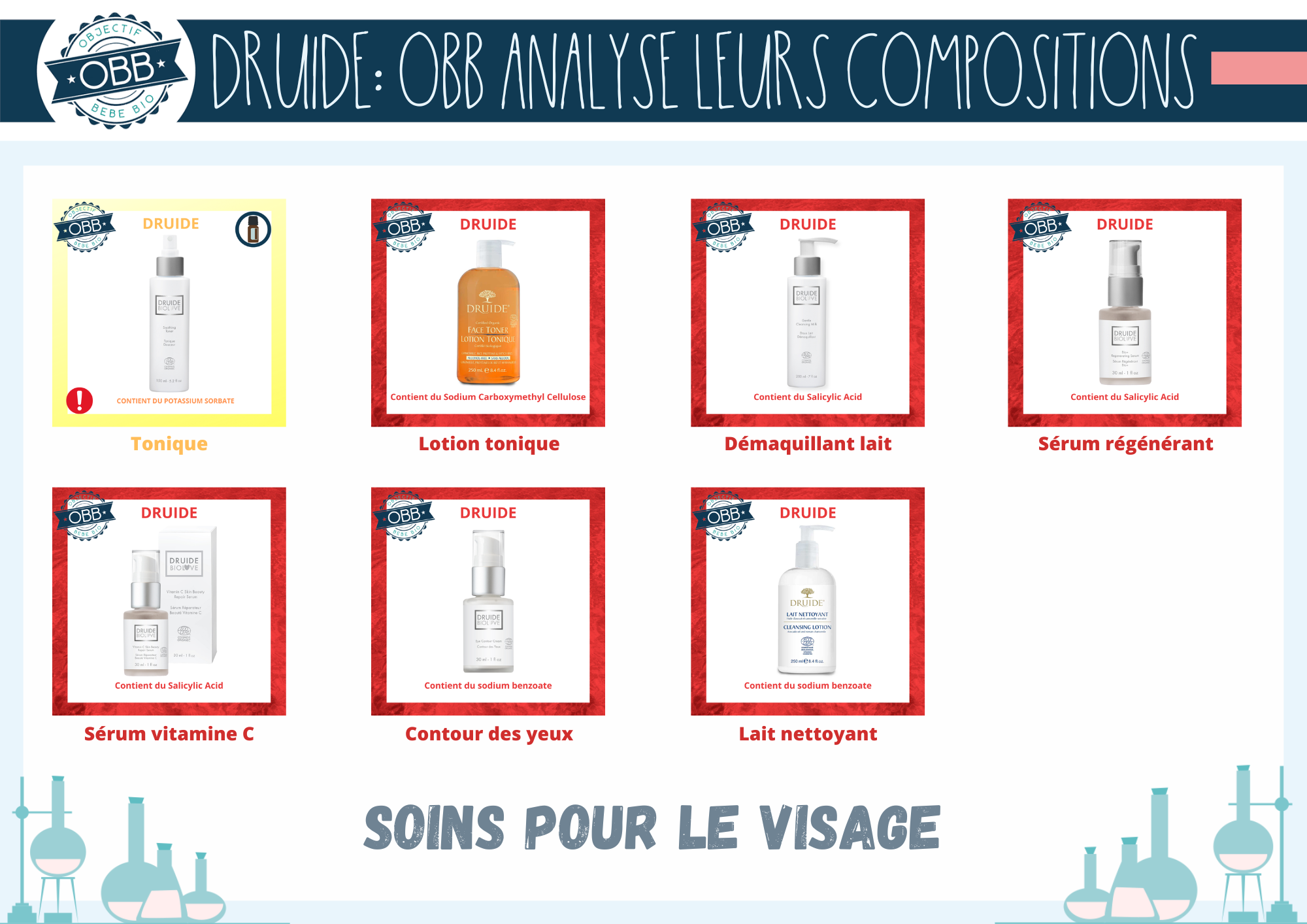 Druide propose une gamme de soin pour le visage et de dentifrices. Dans ces derniers on retrouve par exemple du dioxyde de titane, du potassium sorbate ou encore de la cocamidopropyl betaine. Vous trouverez des alternatives dans cet article: