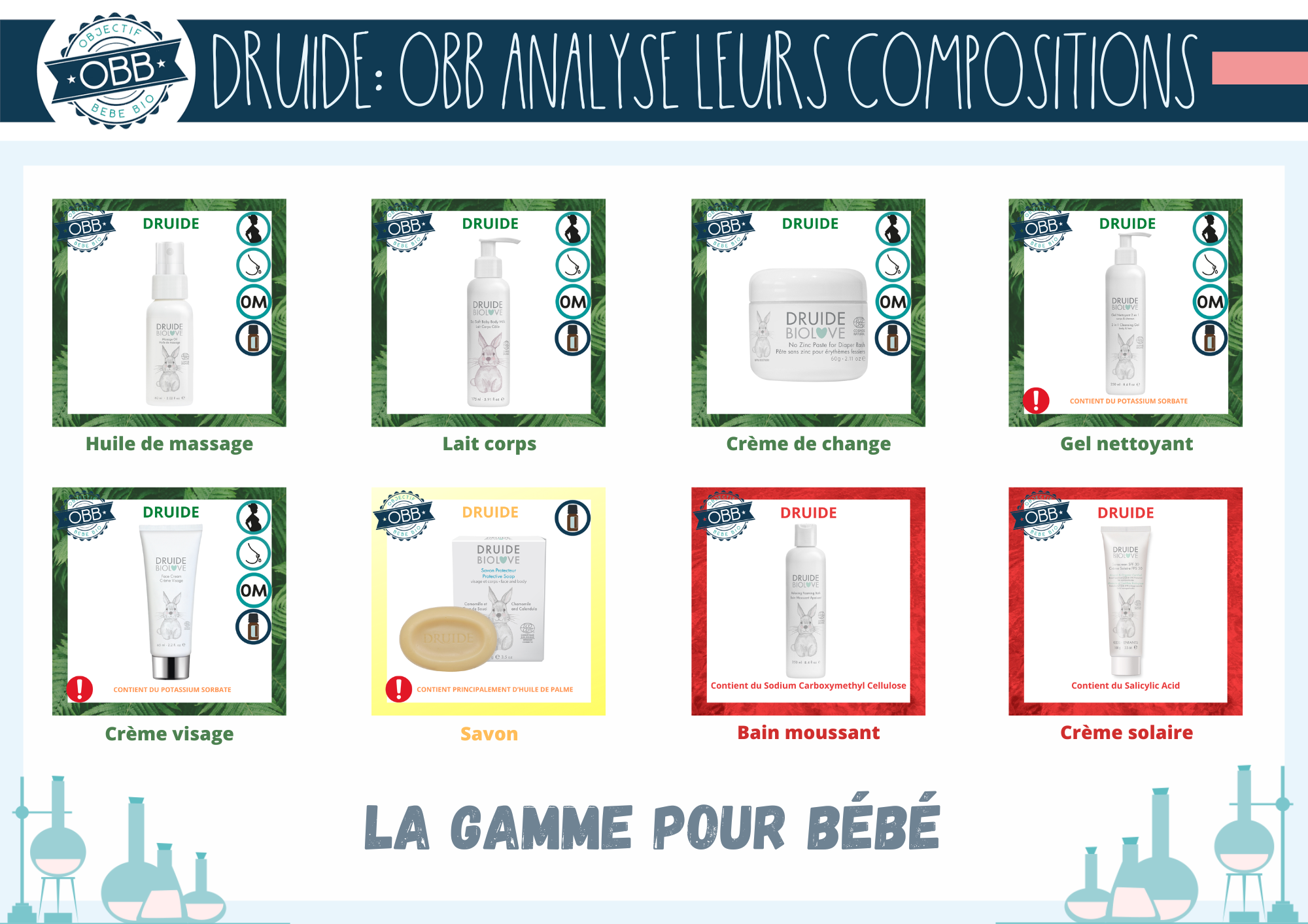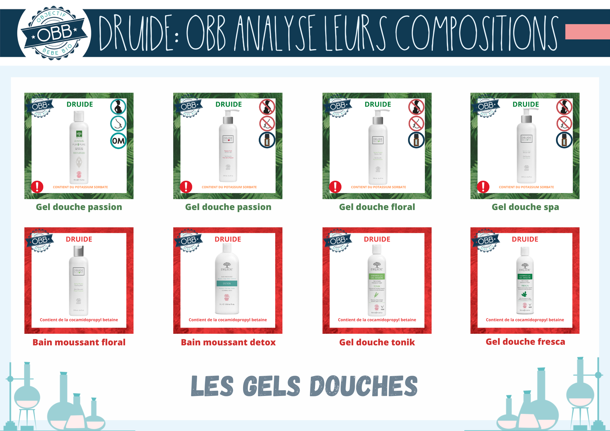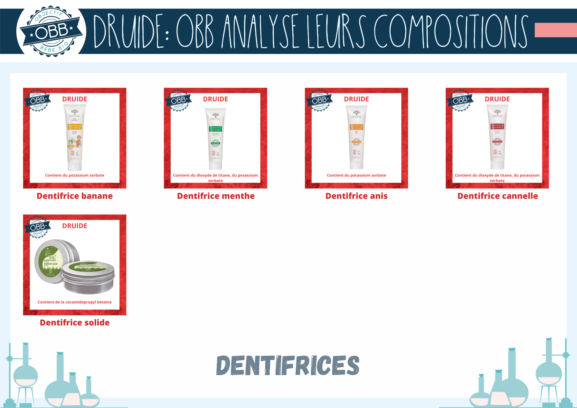 Druide propose une gamme de soin pour le visage et de dentifrices. Dans ces derniers on retrouve par exemple du dioxyde de titane, du potassium sorbate ou encore de la cocamidopropyl betaine. Vous trouverez des alternatives dans cet article: