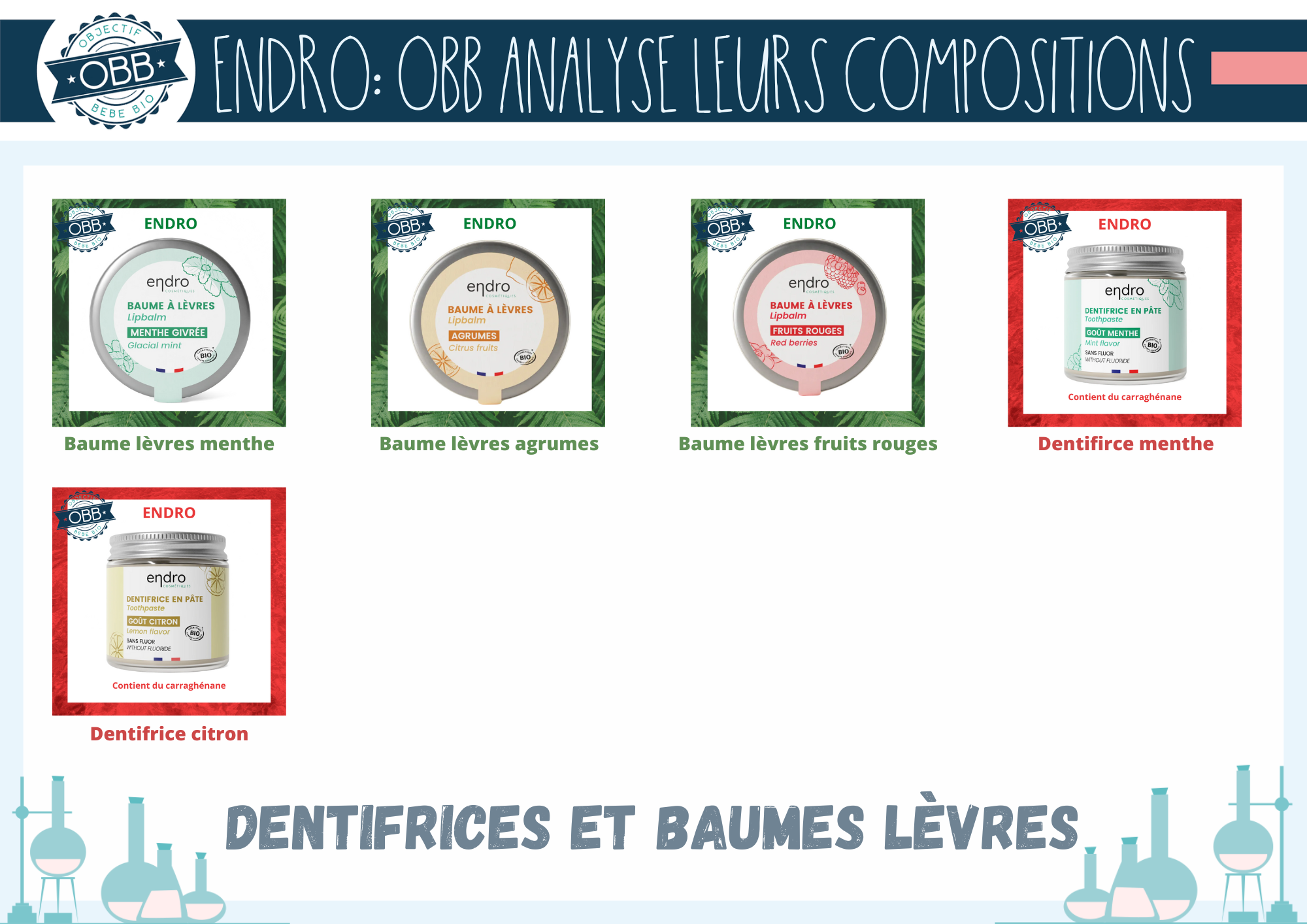 Dans le même esprit des déodorants, la marque propose deux dentifrices solides. Ils contiennent des carraghenanes. Le CIRC a classé les carraghenanes dégradés comme cancérigène possible quand ils sont ingérés. Par mesure de précaution nous déconseillons l’utilisation de ce produit dans les produits ingérés (dentifrices, compléments alimentaires etc) car on ne peut pas savoir si l’ingrédient est dégradé ou non. Endro a également conçu une gamme de baume à lèvre en pot à base de beurre de karité, d’huile de ricin et de cire végétale.