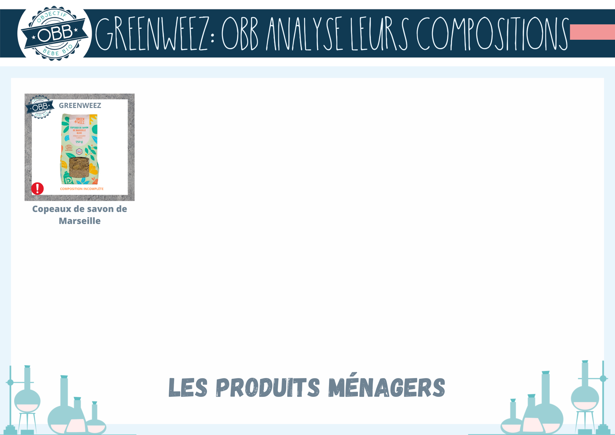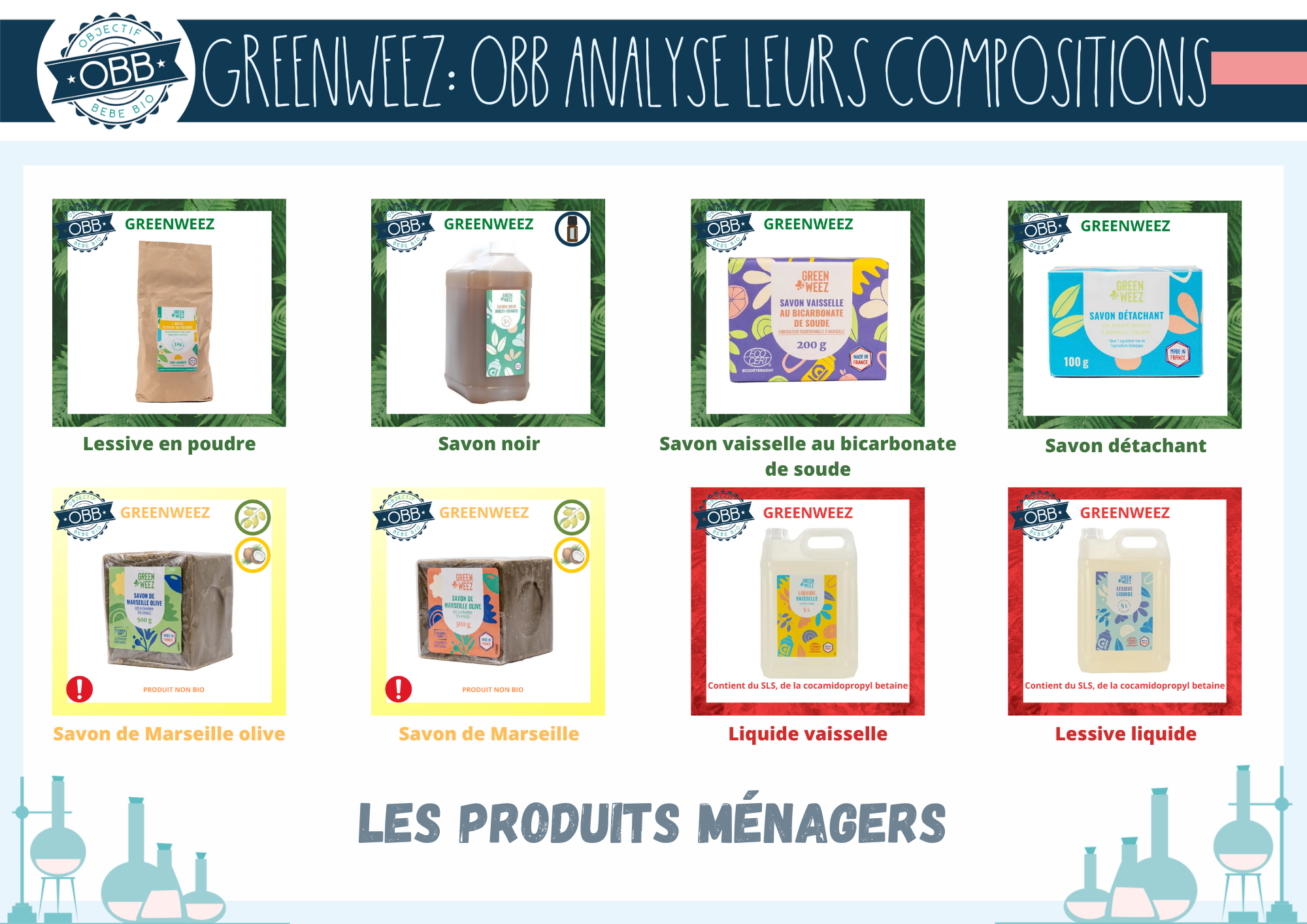 La marque propose les essentiels à avoir pour entretenir votre maison et votre linge. La lessive en poudre est de bonne composition et sans parfum ou huile essentielle, cependant elle est incompatible avec les couches lavables et les culottes menstruelles. La version liquide contient des ingrédients irritants qui peuvent être responsables de problèmes cutanés comme l’eczéma. Greenweez propose également des savons solides pour la vaisselle et un détachant.