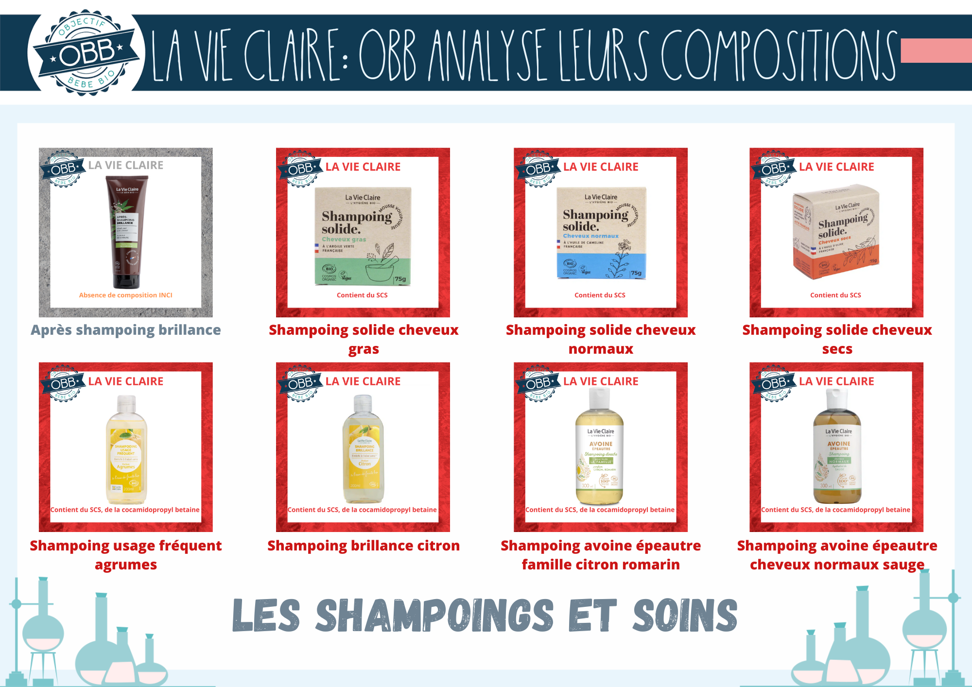 La Vie Claire propose plusieurs types de soins capillaires. Pour environ la moitié des références il manque la compo INCI sur le site de la marque donc nous ne pouvons pas vous dire s’ils contiennent des ingrédients problématiques. En dehors du shampoing douche à la pêche, les autres références ont des tensioactifs irritants comme le sodium coco sulfate.