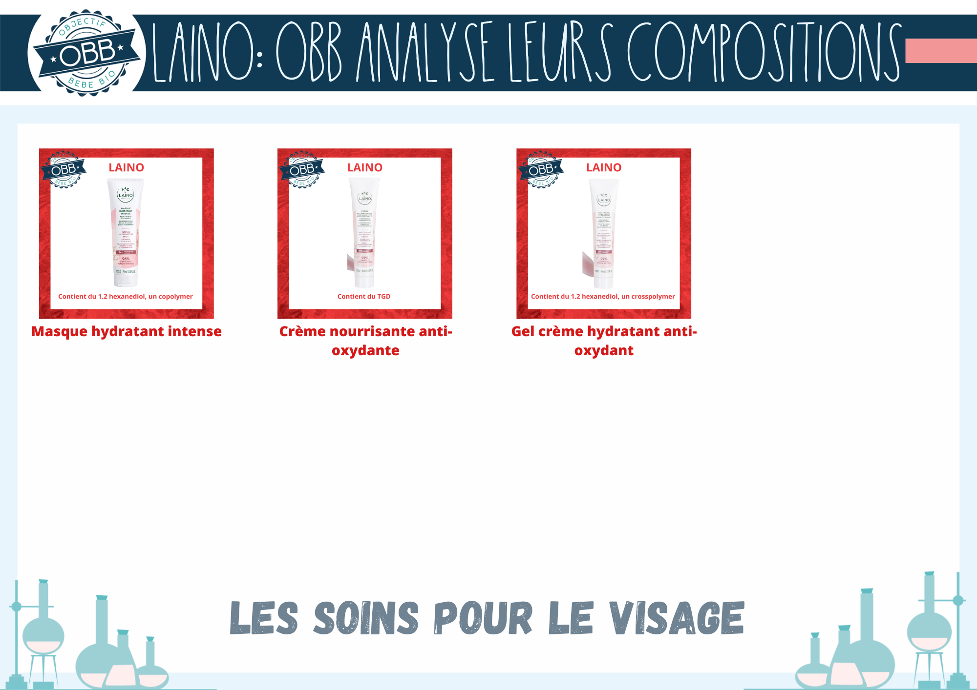 Afin de compléter sa gamme, la marque Laino a également confectionné des soins pour le visage. En dehors du gommage hydratant on y retrouve une nouvelle fois des ingrédients problématiques comme un polysorbate, du TDG, un crosspolymer ou encore du 1.2 hexanediol.