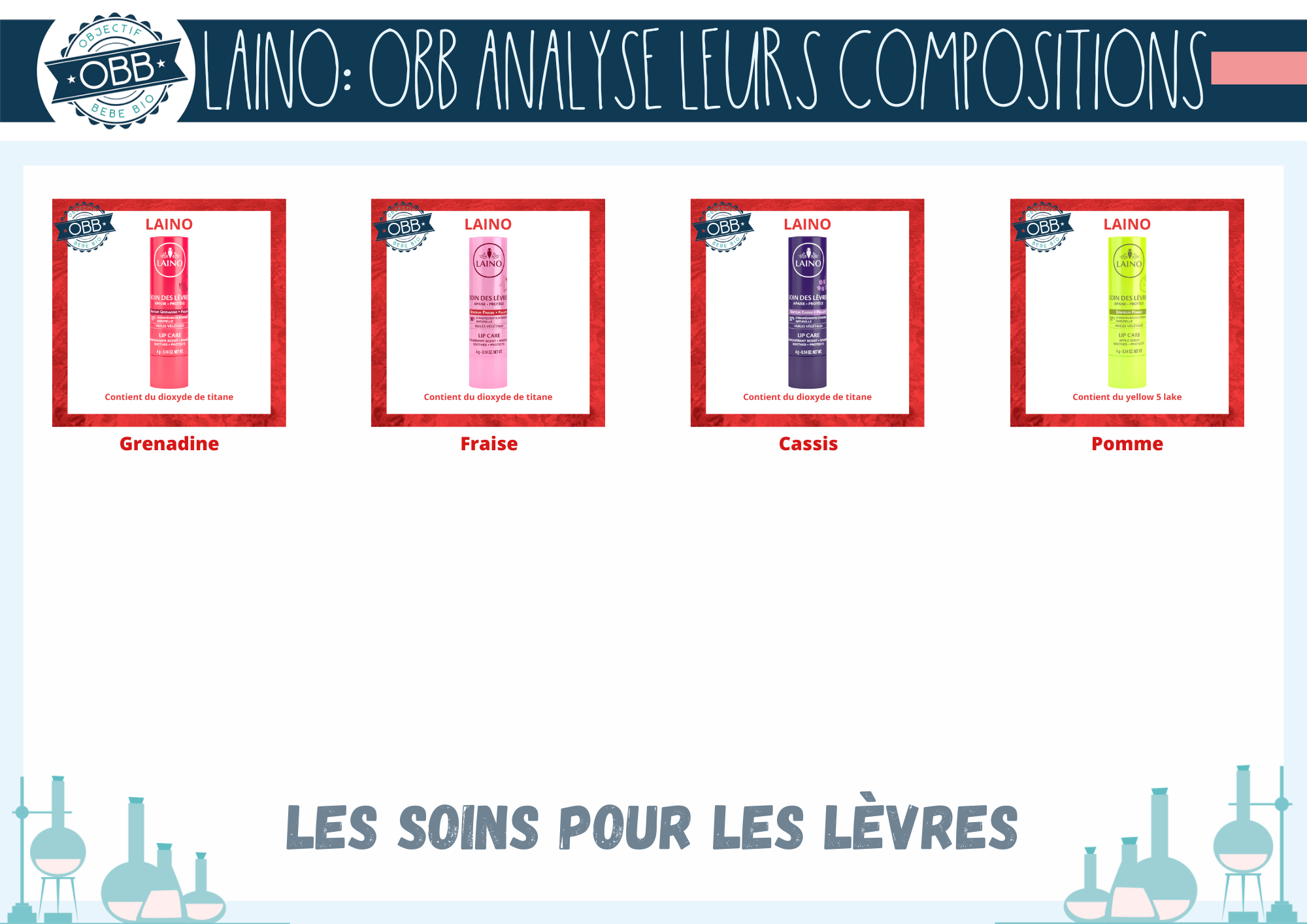 Pour conclure voici les produits destinés à prendre soins des lèvres, en particulier à cette saison. A l’image des autres produits de la marque, mis à part trois baumes non bio, les autres références sont loin d’être en accord avec notre cahier des charges. En effet, on y retrouve de nombreux colorants problématiques comme le dioxyde de titane qui est suspecté d’être cancérigène.