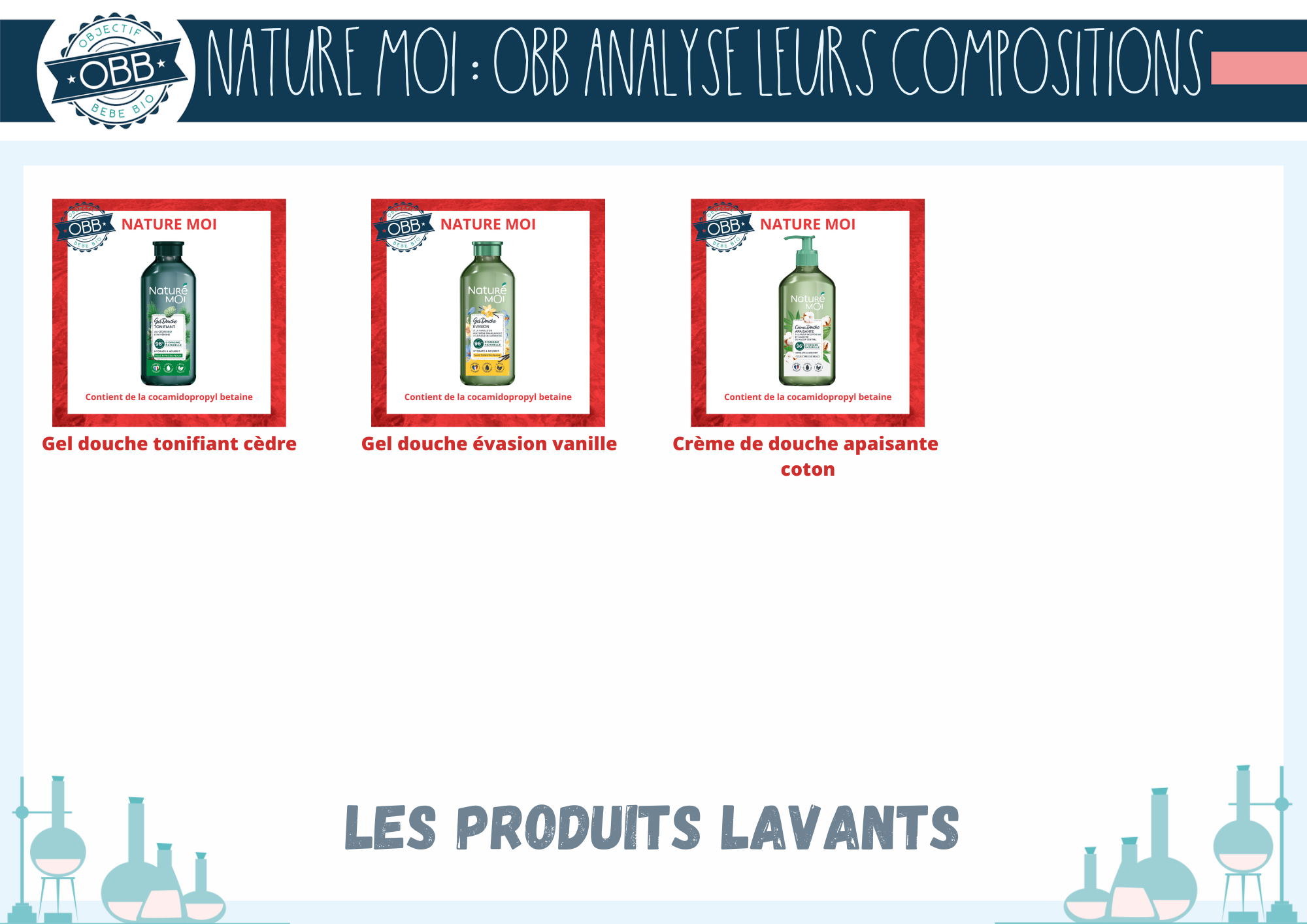 La marque propose un savon solide, mais aussi une large gamme de gels ou crèmes de douches. Cependant ils contiennent tous des ingrédients irritants comme le TGD et la cocamidopropyl betaine. Voici des explications plus détaillées sur cette dernières:
