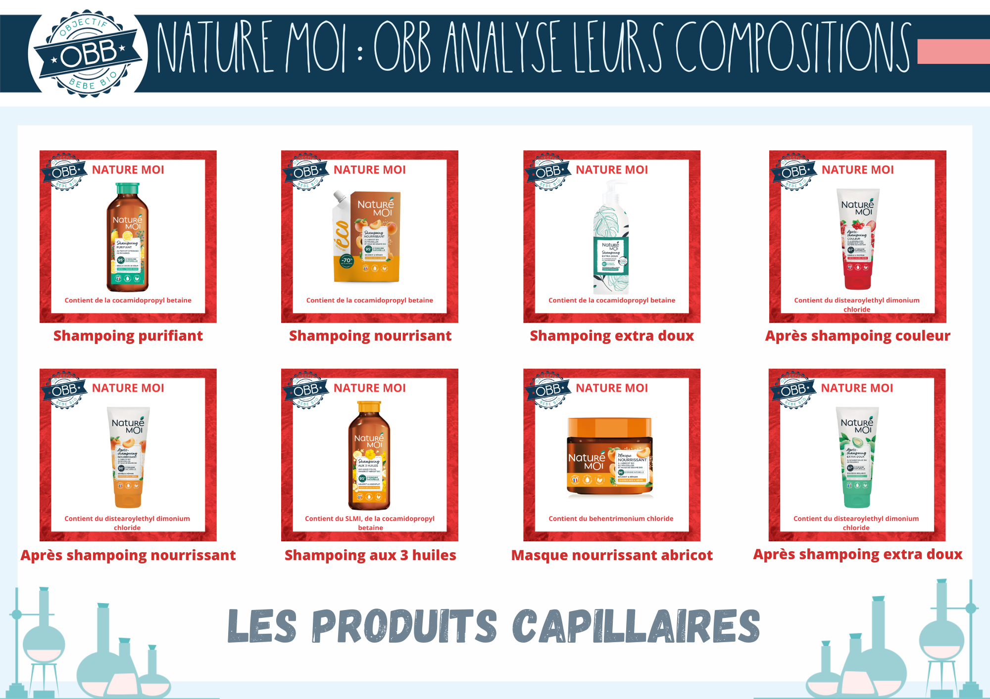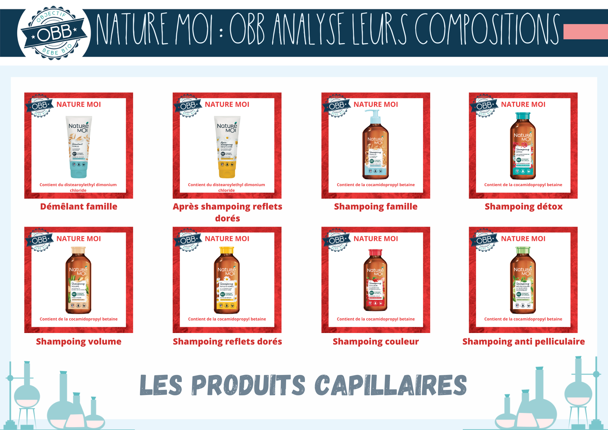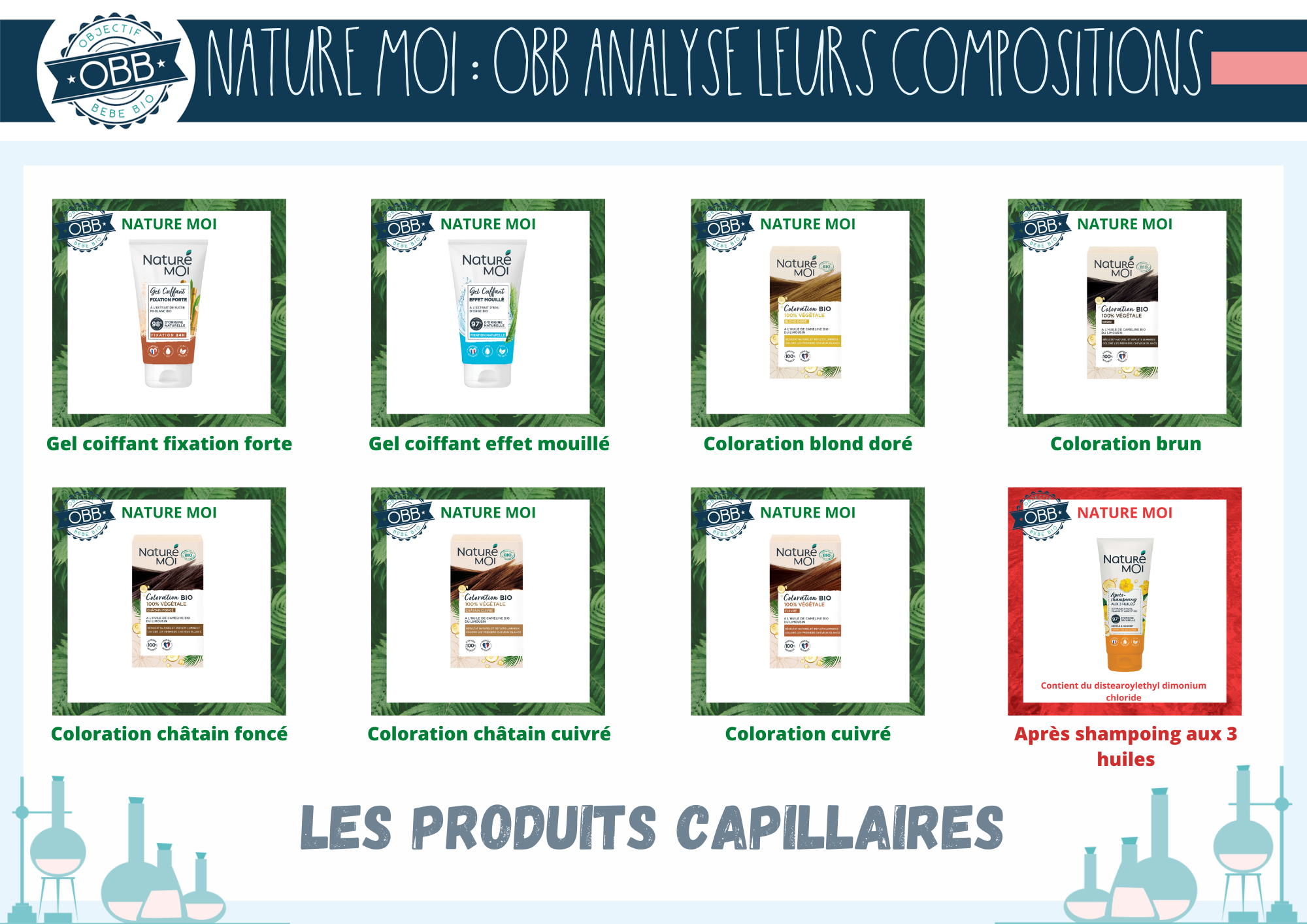 En ce qui concerne les shampoings ils contiennent les mêmes tensioactifs que les produits lavants pour le corps. Les soins capillaires eux contient un ammonium quartenaire: distearoylethyl dimonium chloride. Cependant la marque propose deux gels coiffants à base de sucre qui ont une compo en accord avec notre cahier des charges. Naturé moi possède également plusieurs colorations végétales principalement composées de divers hennés.
