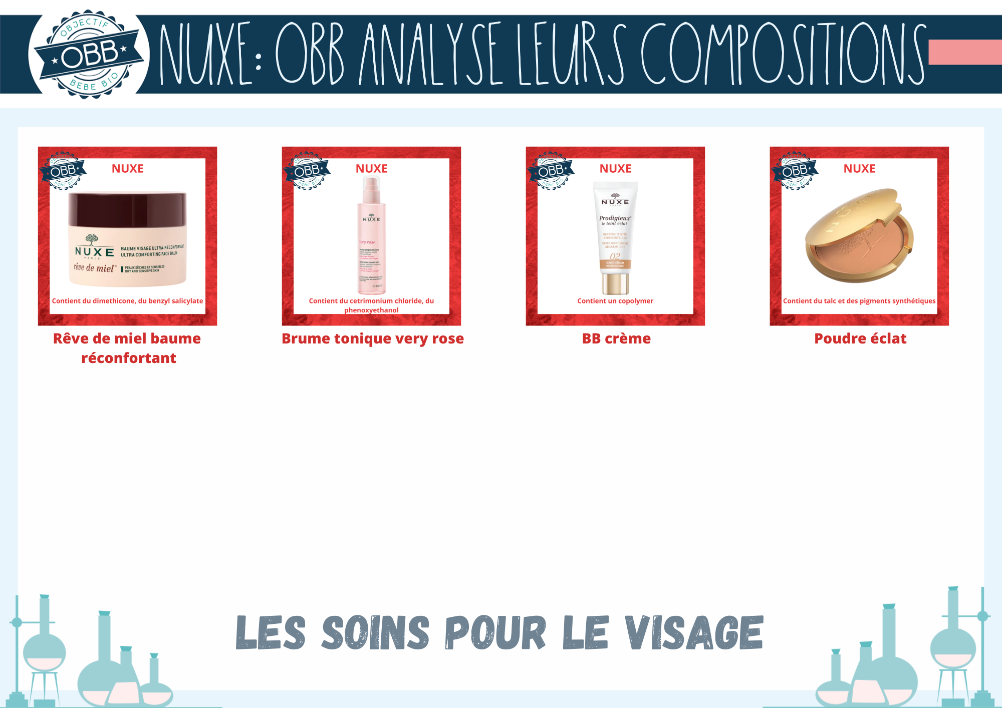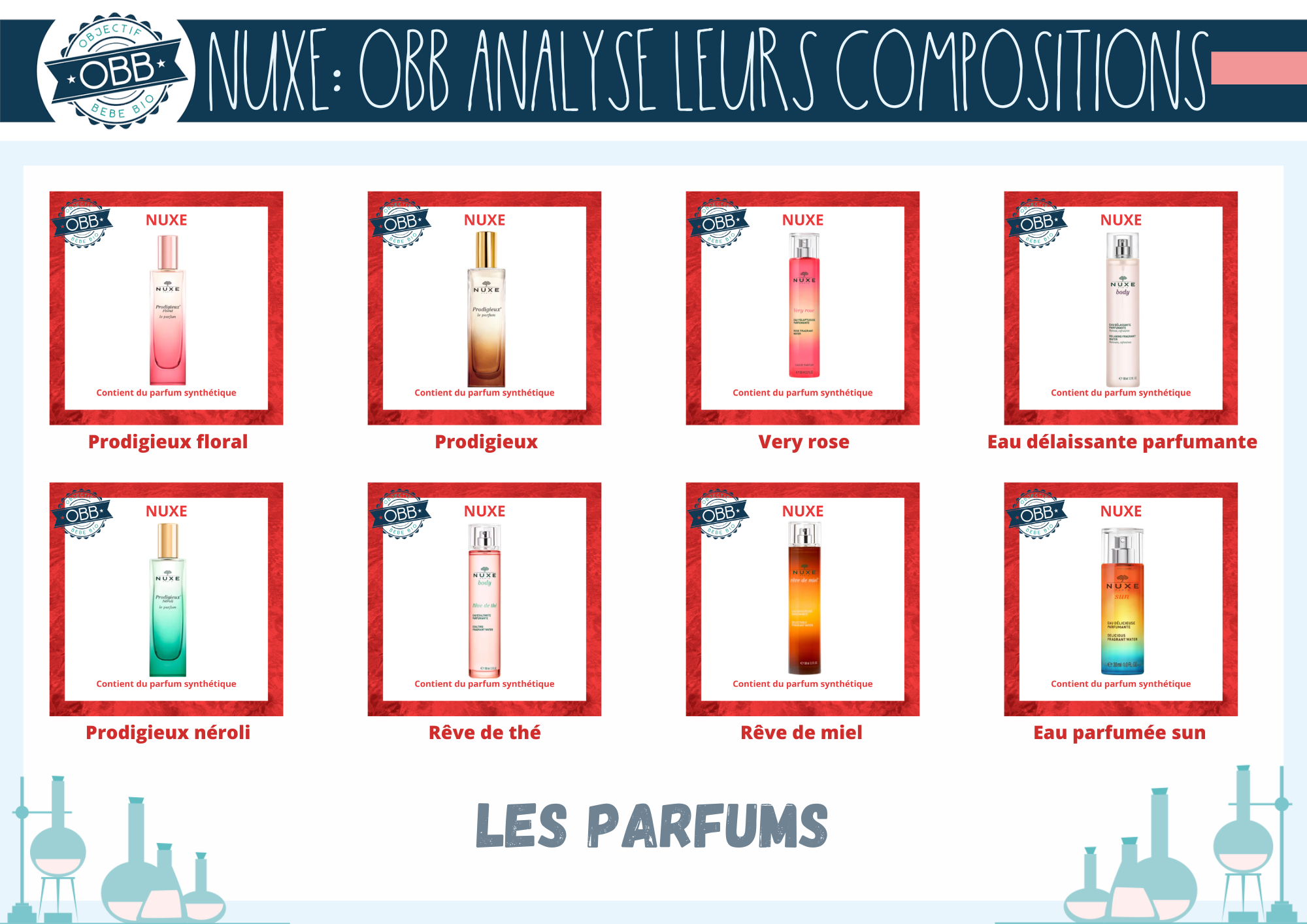 En plus des produits de soins, la marque propose aussi des parfums. Nuxe nous a confirmé qu’en dehors des références certifiées bio ils utilisent des parfums avec certaines molécules synthétiques dans leurs produits.