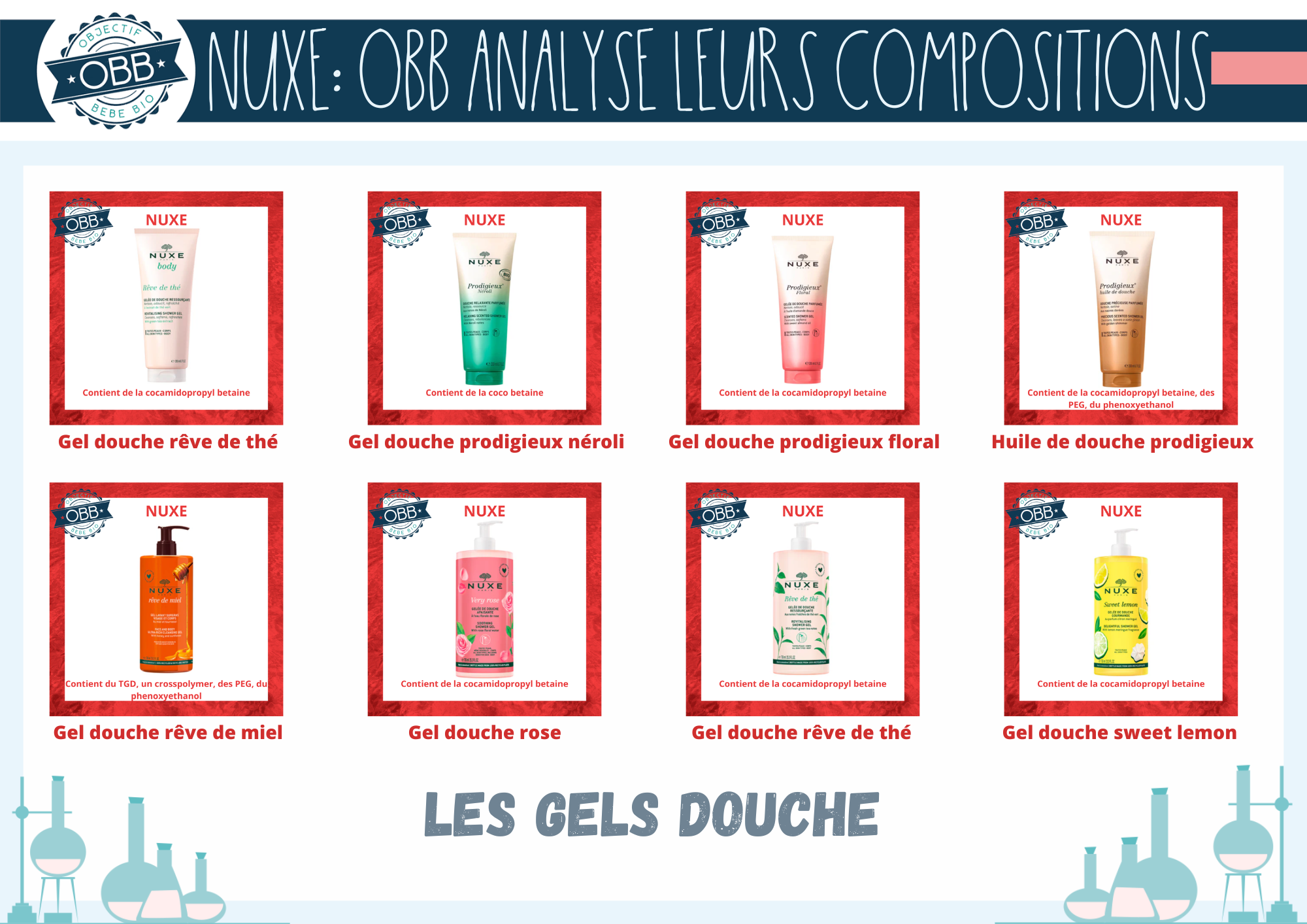 La marque a conçu différents produits à utiliser sous la douche, comme des gels douche, une huile de douche et des shampoings. Toutes les références contiennent des tensioactifs comme la cocamidopropyl betaine: